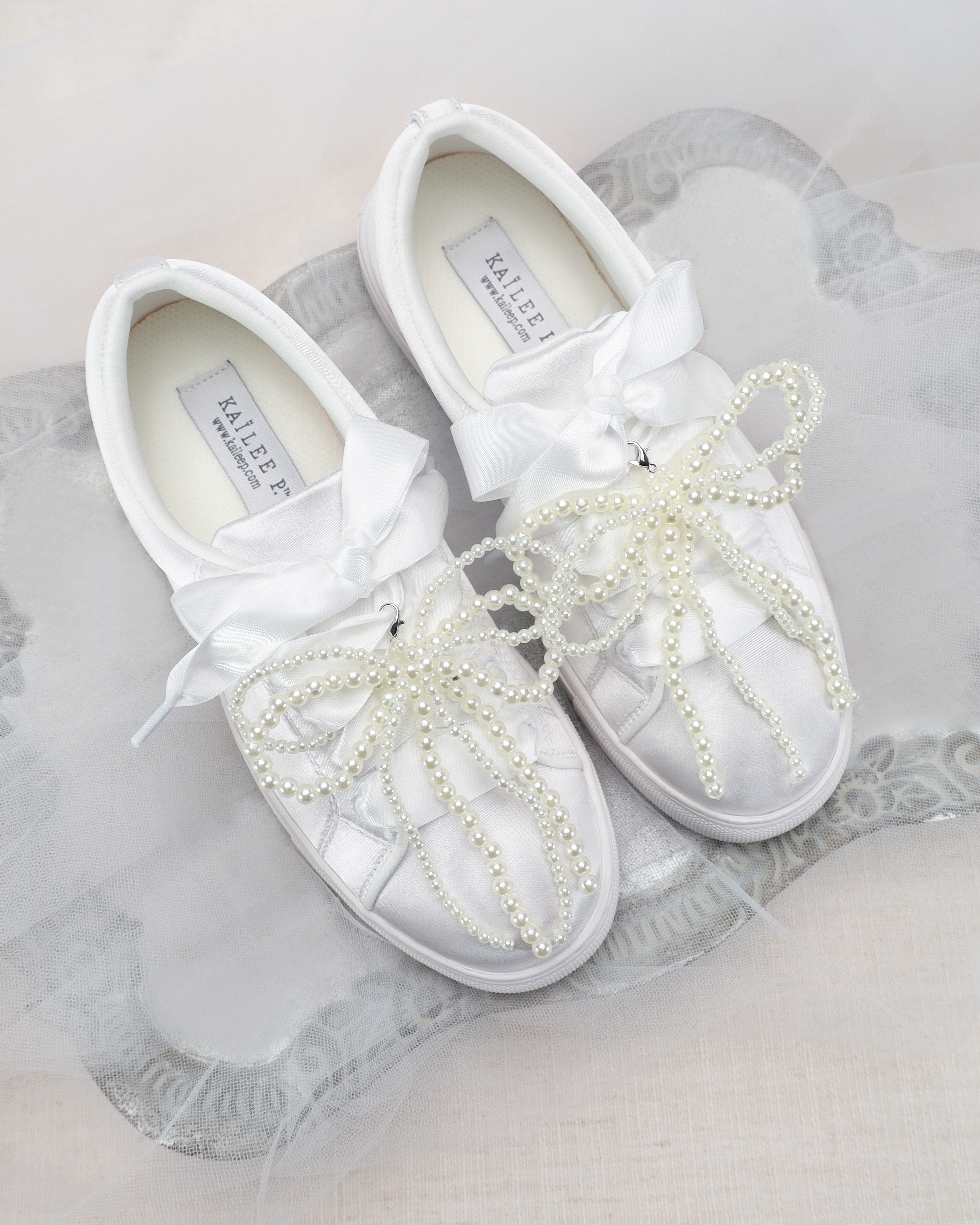 Perfect for brides, bridesmaids, flower girls, or anyone wanting to elevate their daily footwear, these pearl bow charms pair effortlessly with satin ribbon laces, bridal sneakers, and after-ceremony reception shoes.