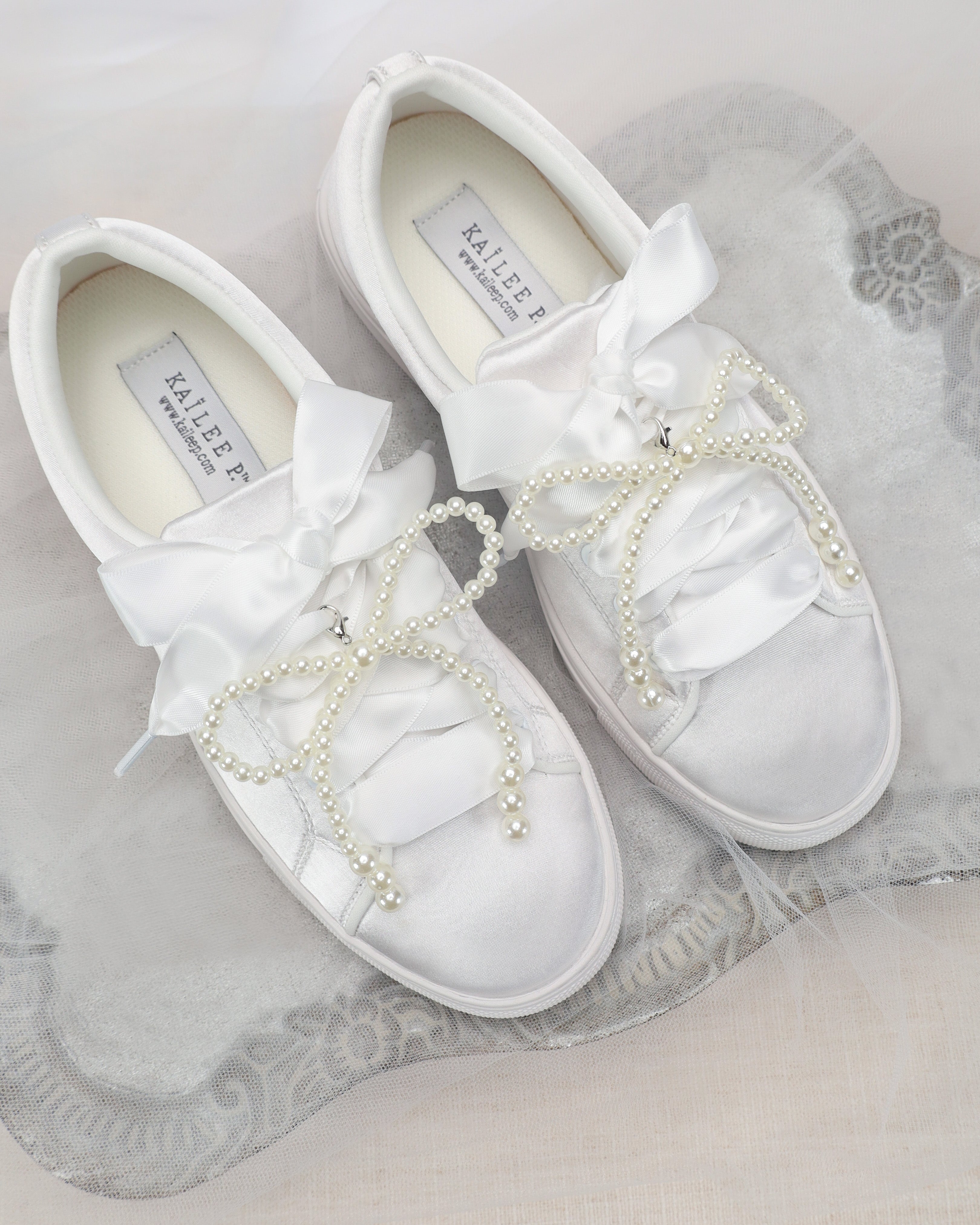 Perfect for brides, bridesmaids, flower girls, or anyone wanting to elevate their daily footwear, these pearl bow charms pair effortlessly with satin ribbon laces, bridal sneakers, and after-ceremony reception shoes.