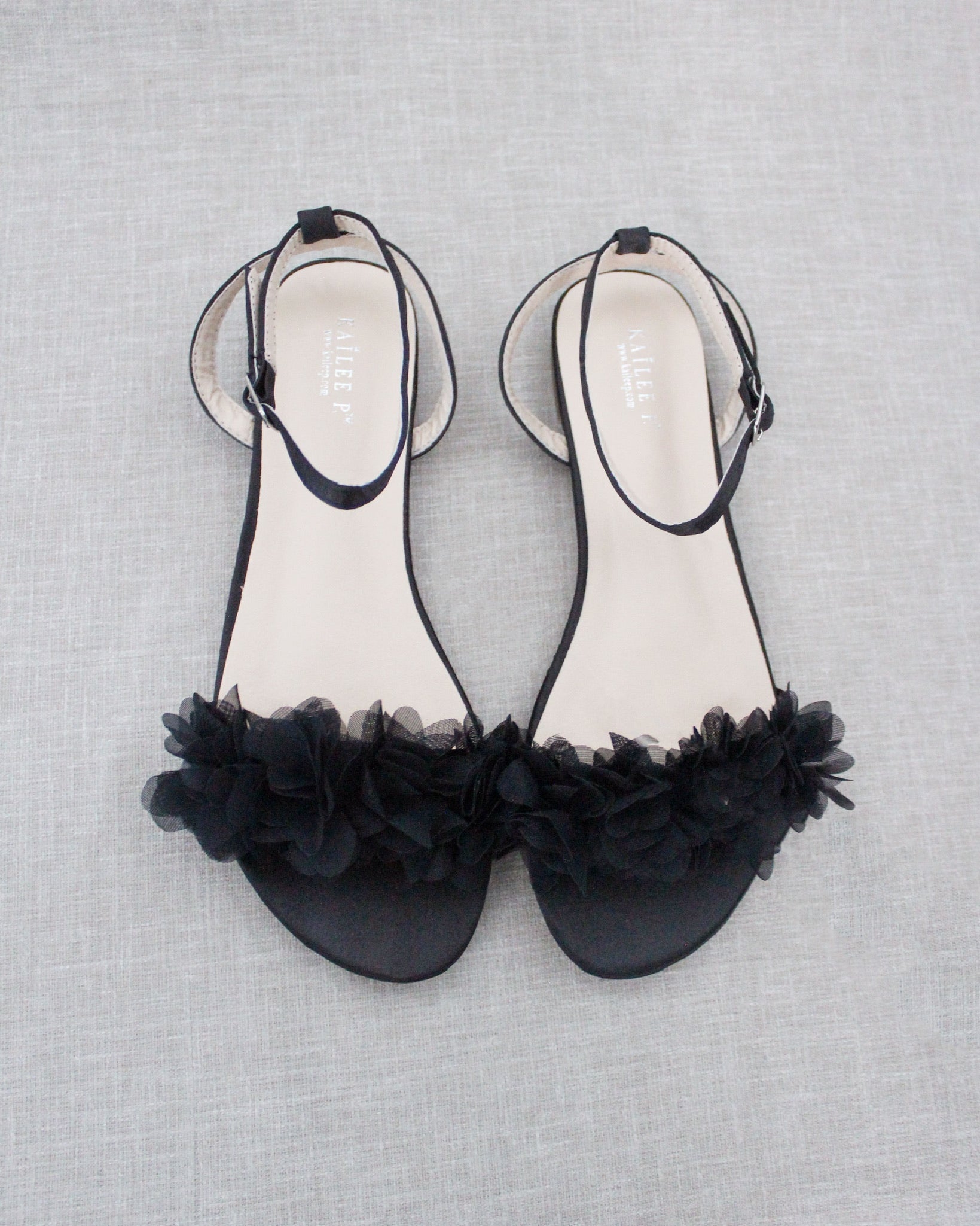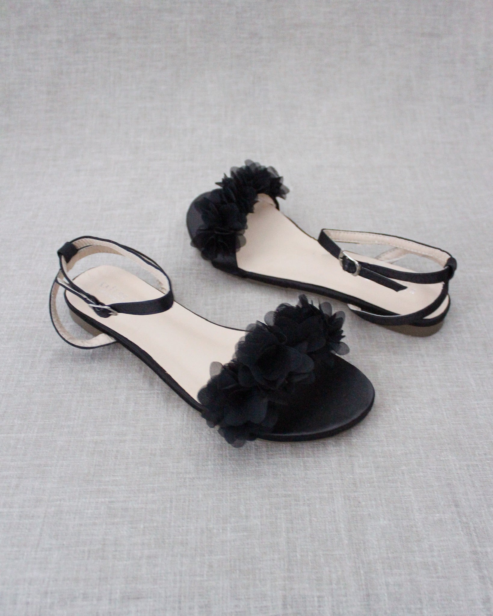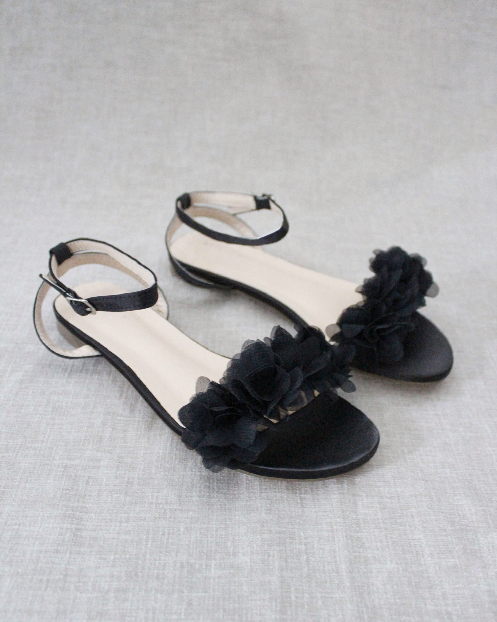 Black Satin Flat Sandal with Chiffon Flowers and Ankle Strap