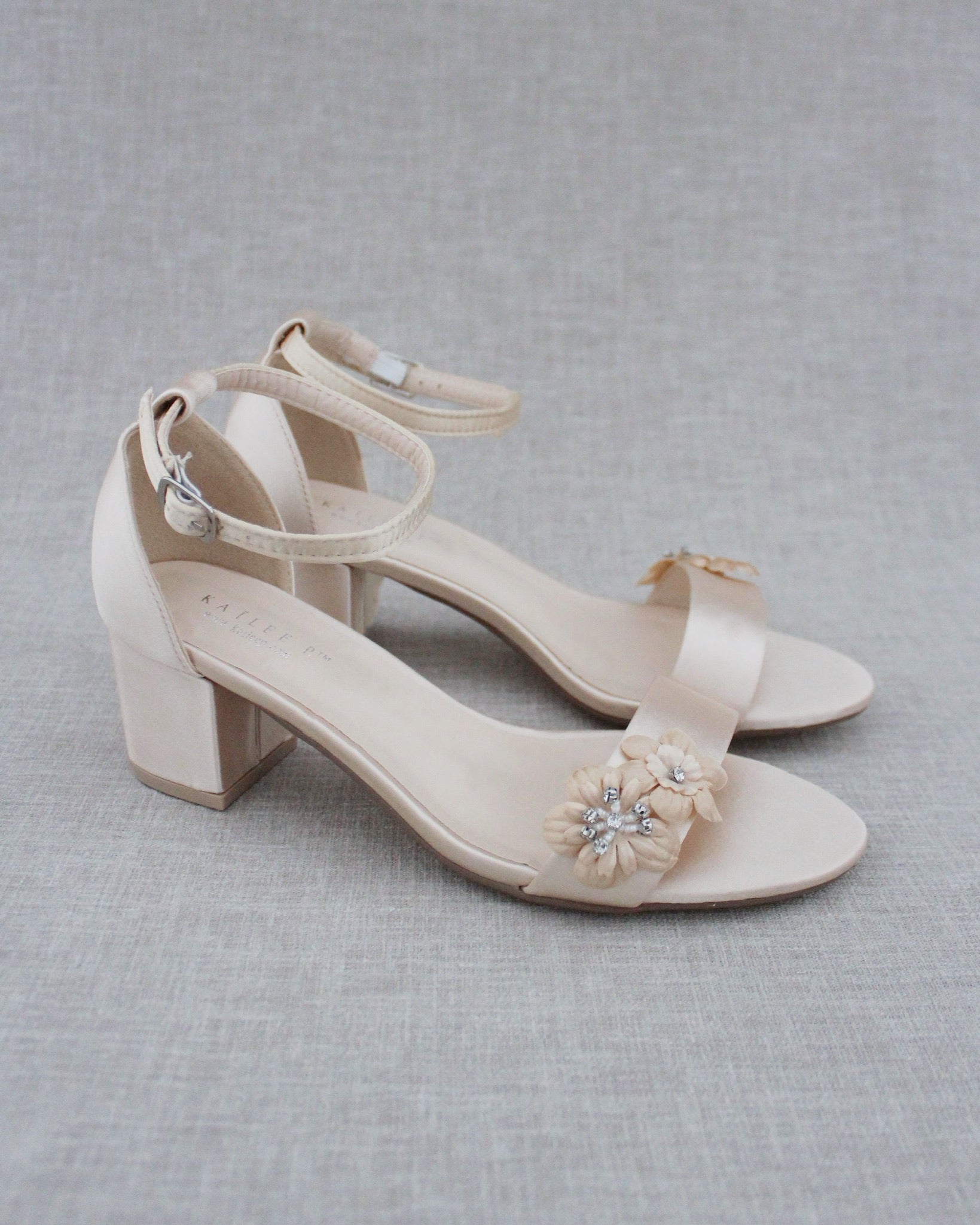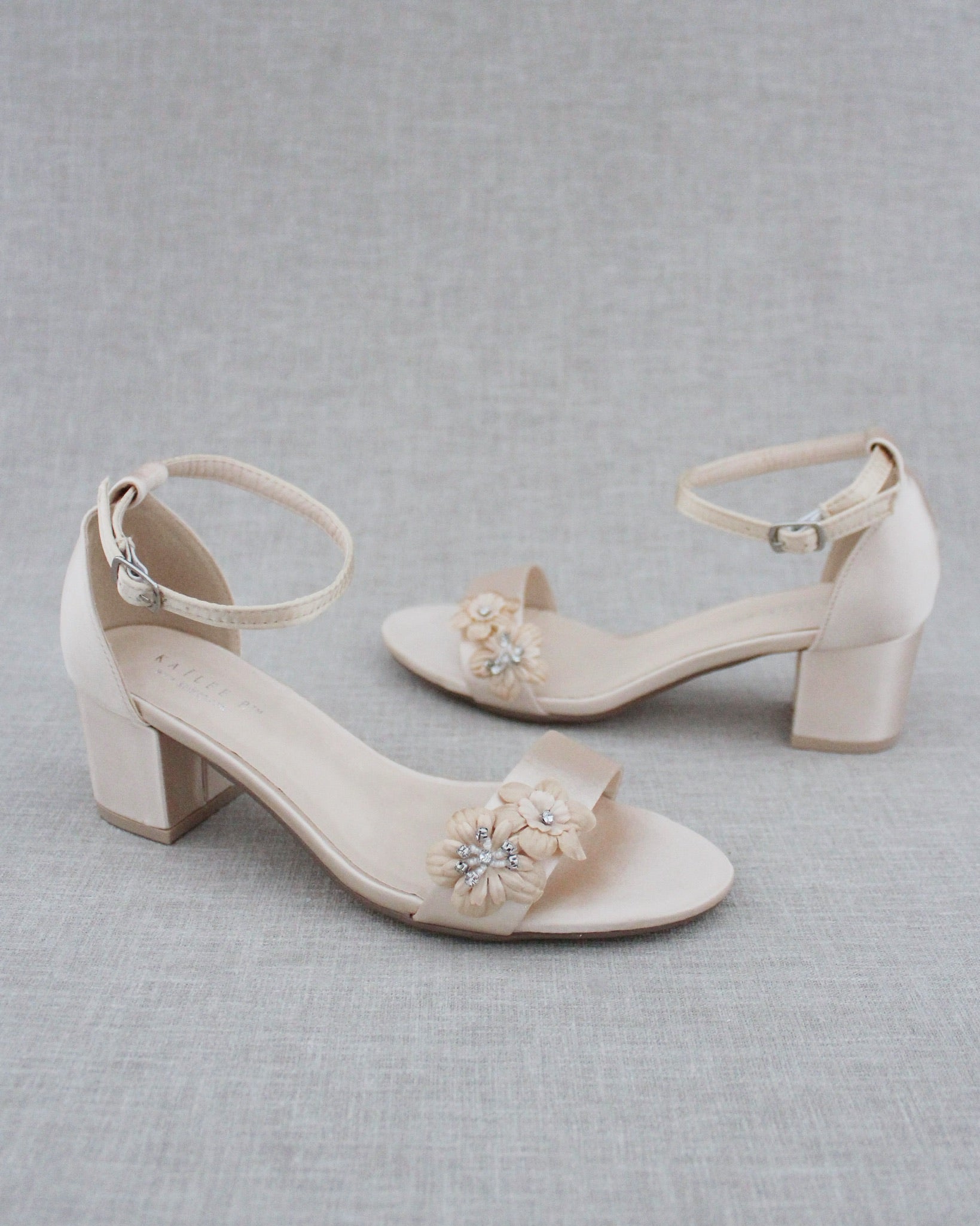 Classy satin block heel with flower appliques. Simple yet elegant are great combination and will definitely be a favorite. Perfect for flower girls, bridesmaids, prom night, and any special occasions.