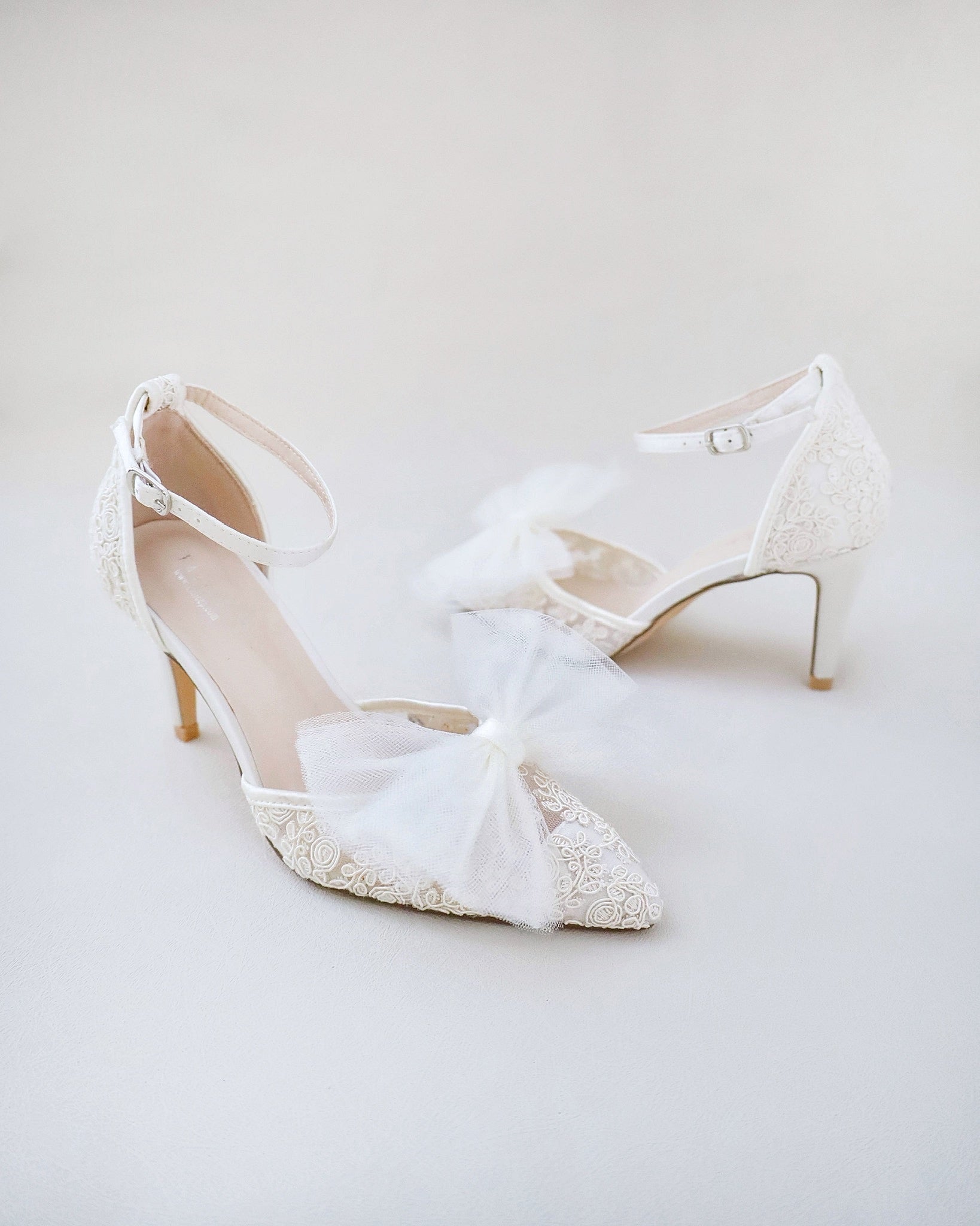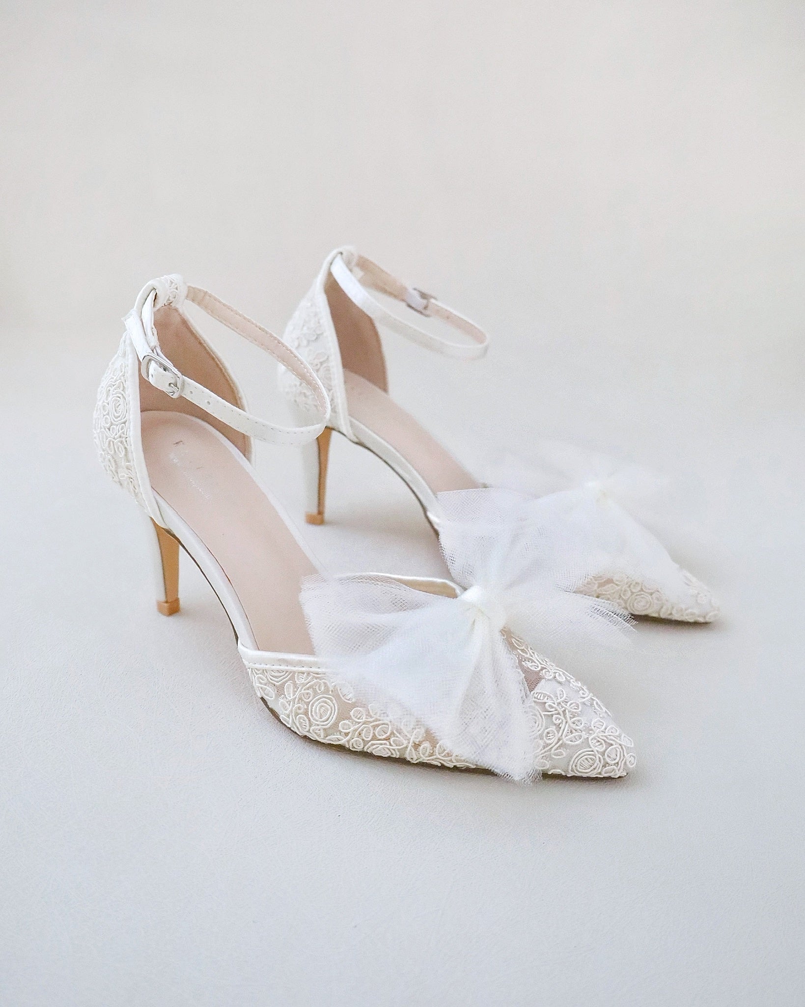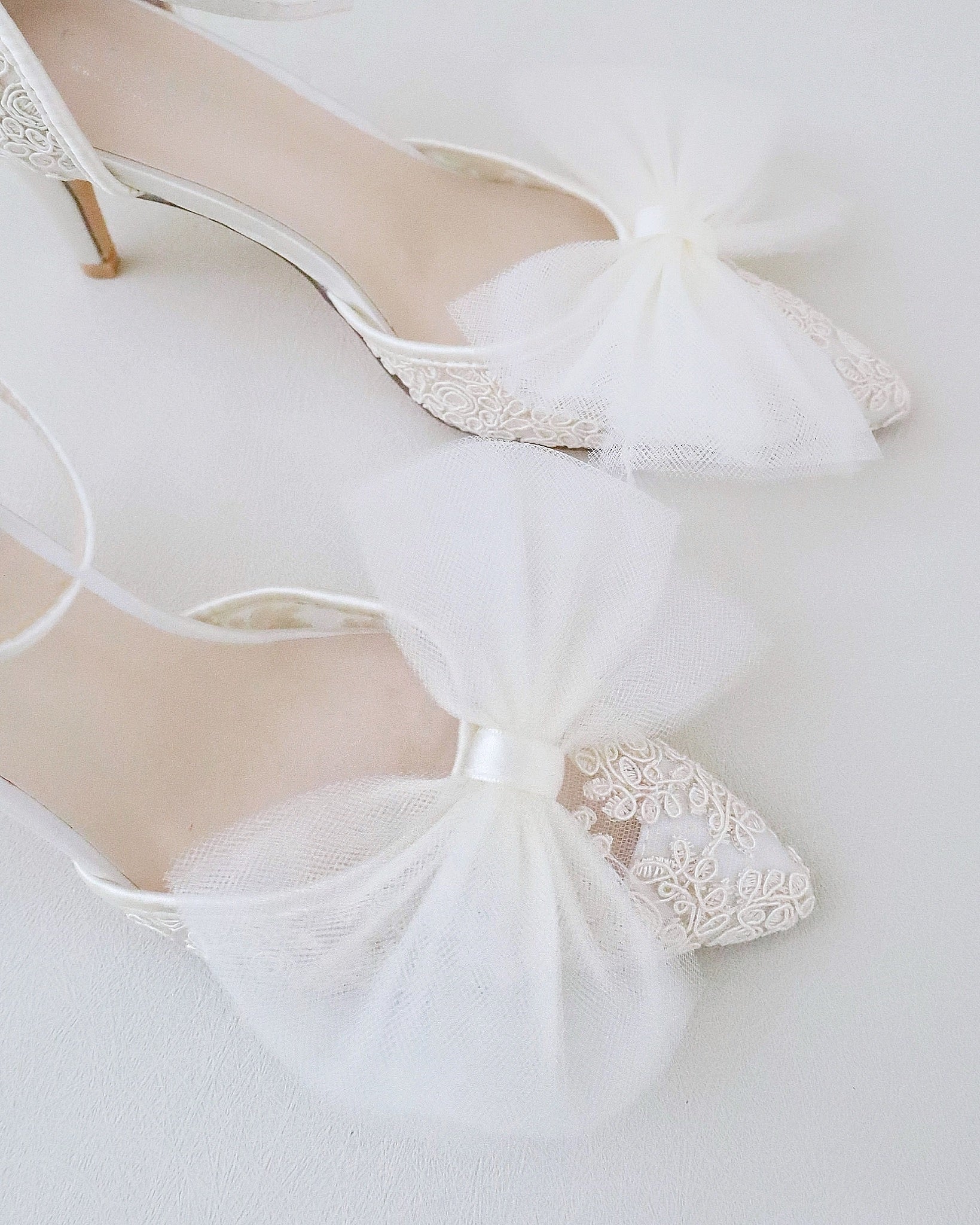 Crochet Lace Wedding Collection. Vintage inspired pointed toe crochet lace. The fluffy tulle bows detailing adds a fun and chic statement piece. Perfect for brides, bridal party, bridesmaids, prom, parties, or any special occasion.