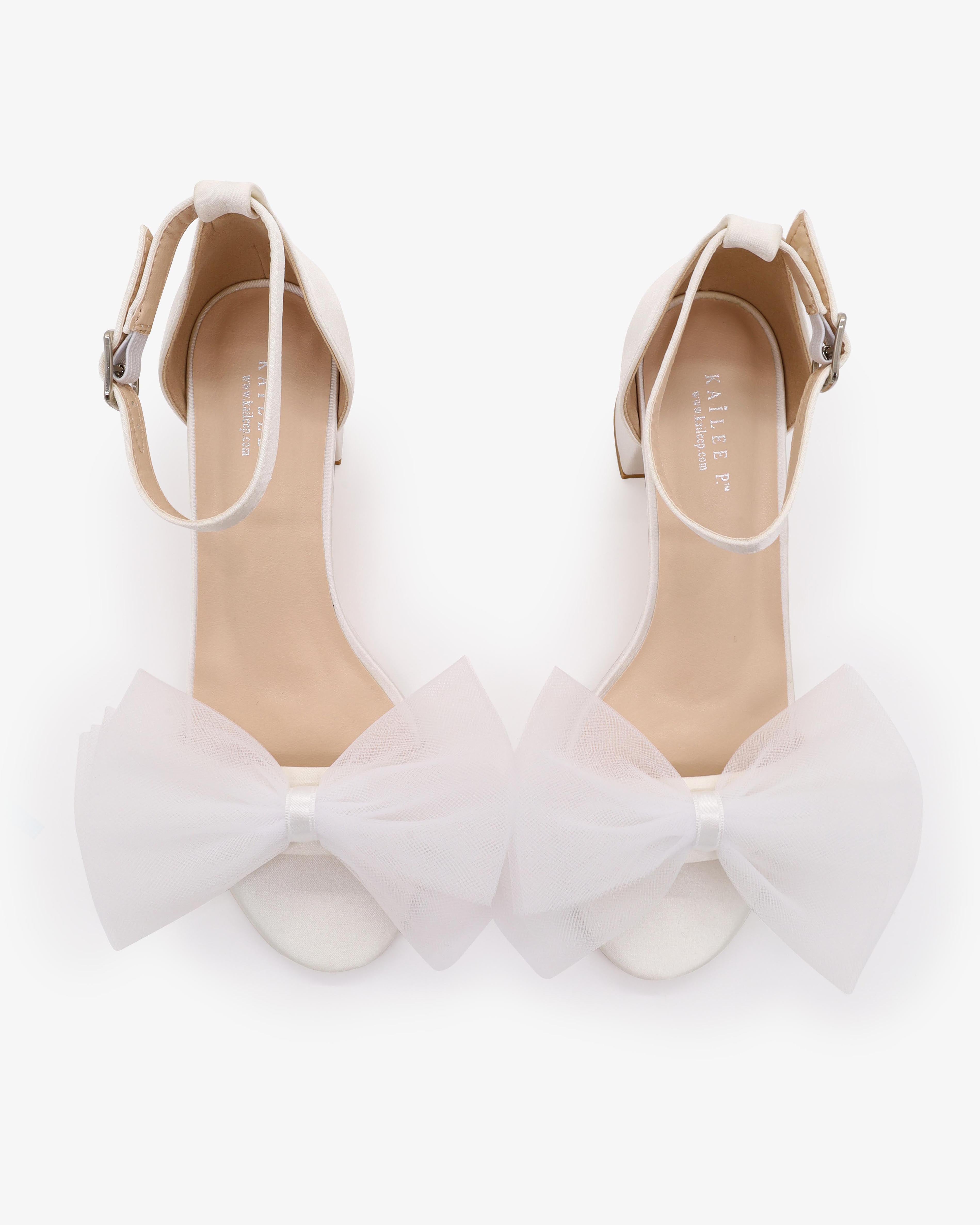 Satin Block Heel Wedding Sandal with Front Oversized Tulle Bow