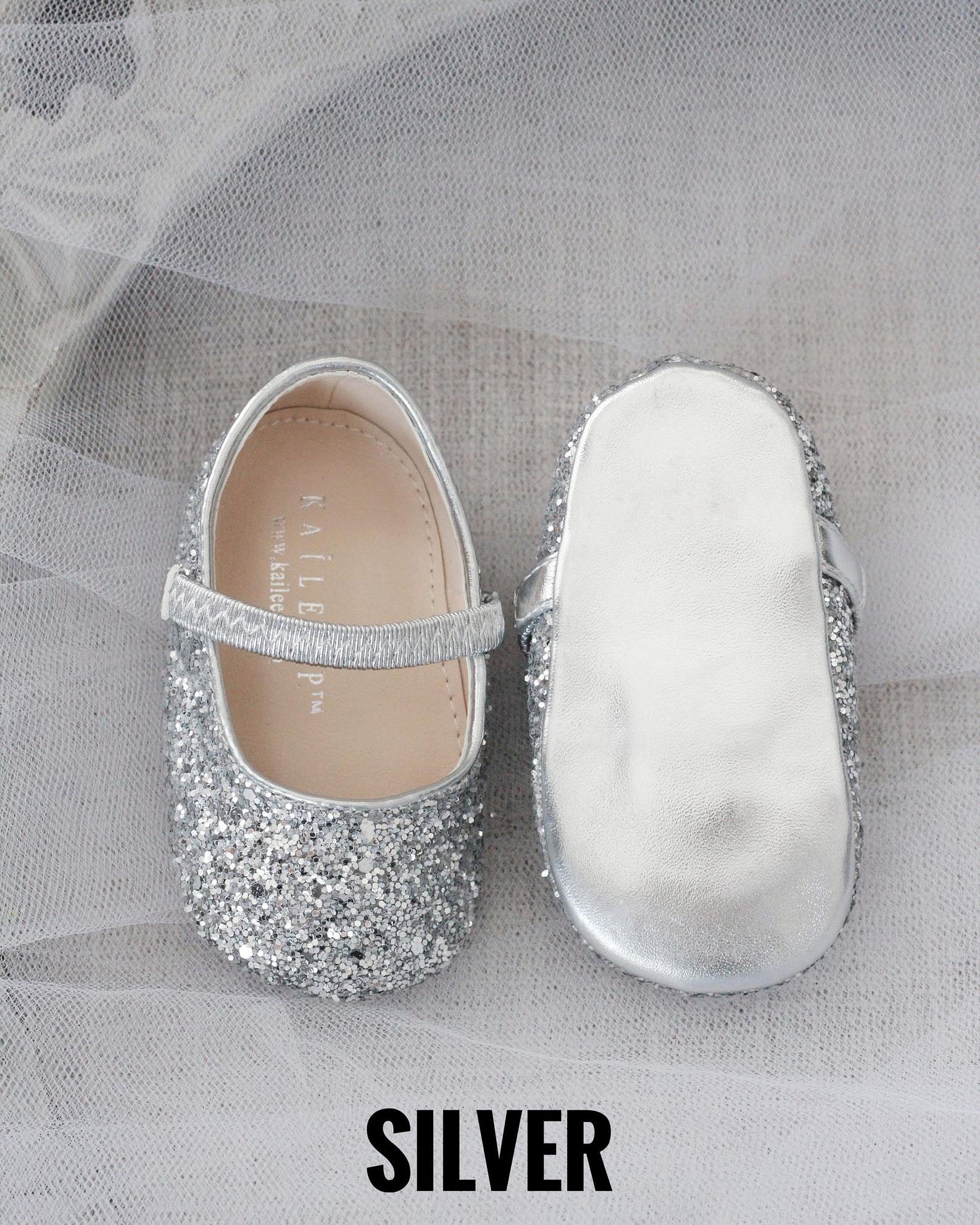 Beautiful allover rock glitter ballet flats with matching hair accessories for baby girls. Perfect gift for baby's first Christmas, Holiday party, family picture.