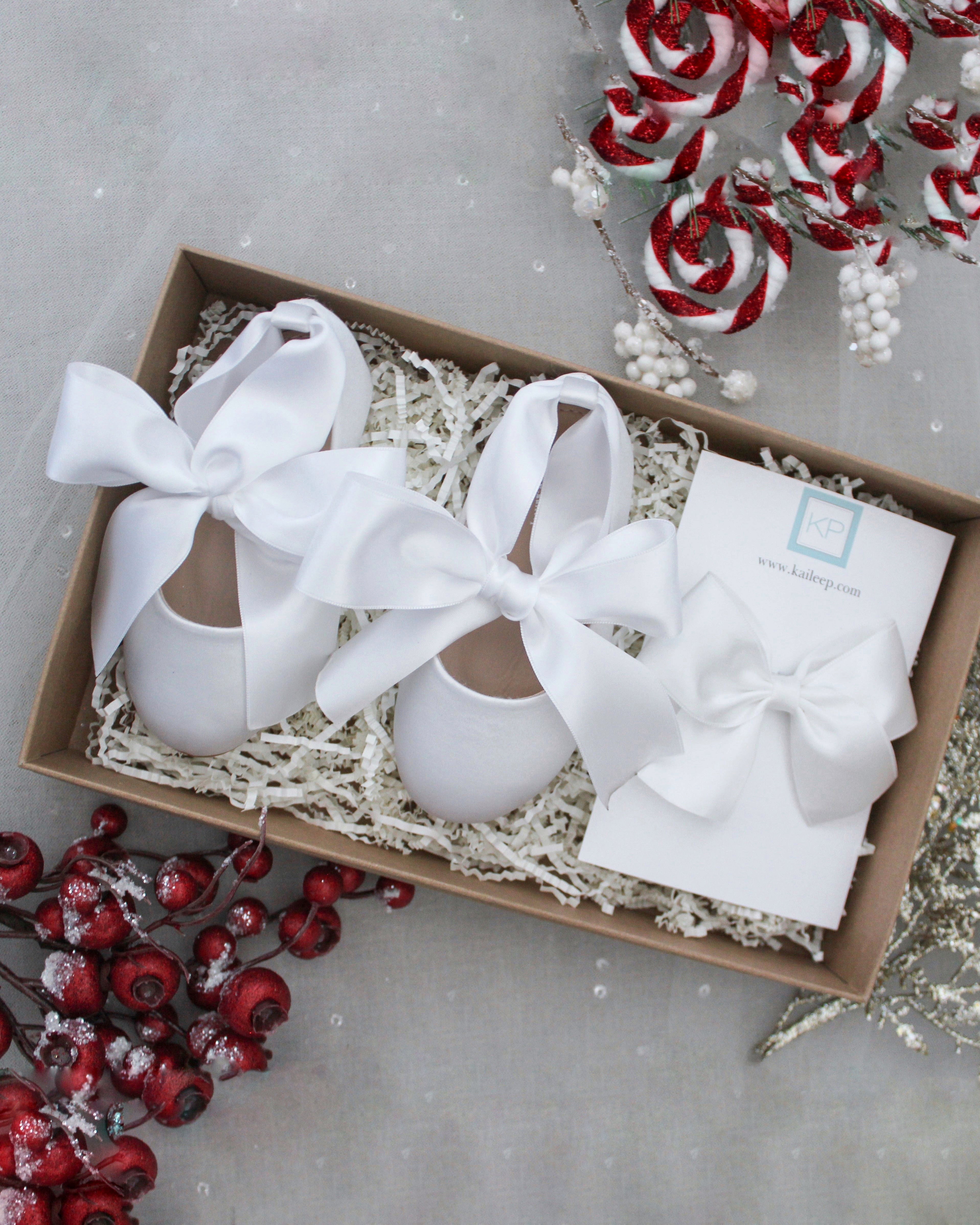 Beautiful satin flats with satin ankle tie and matching hair accessories for baby girls. Perfect gift for baby's first Christmas, Holiday party, family picture.