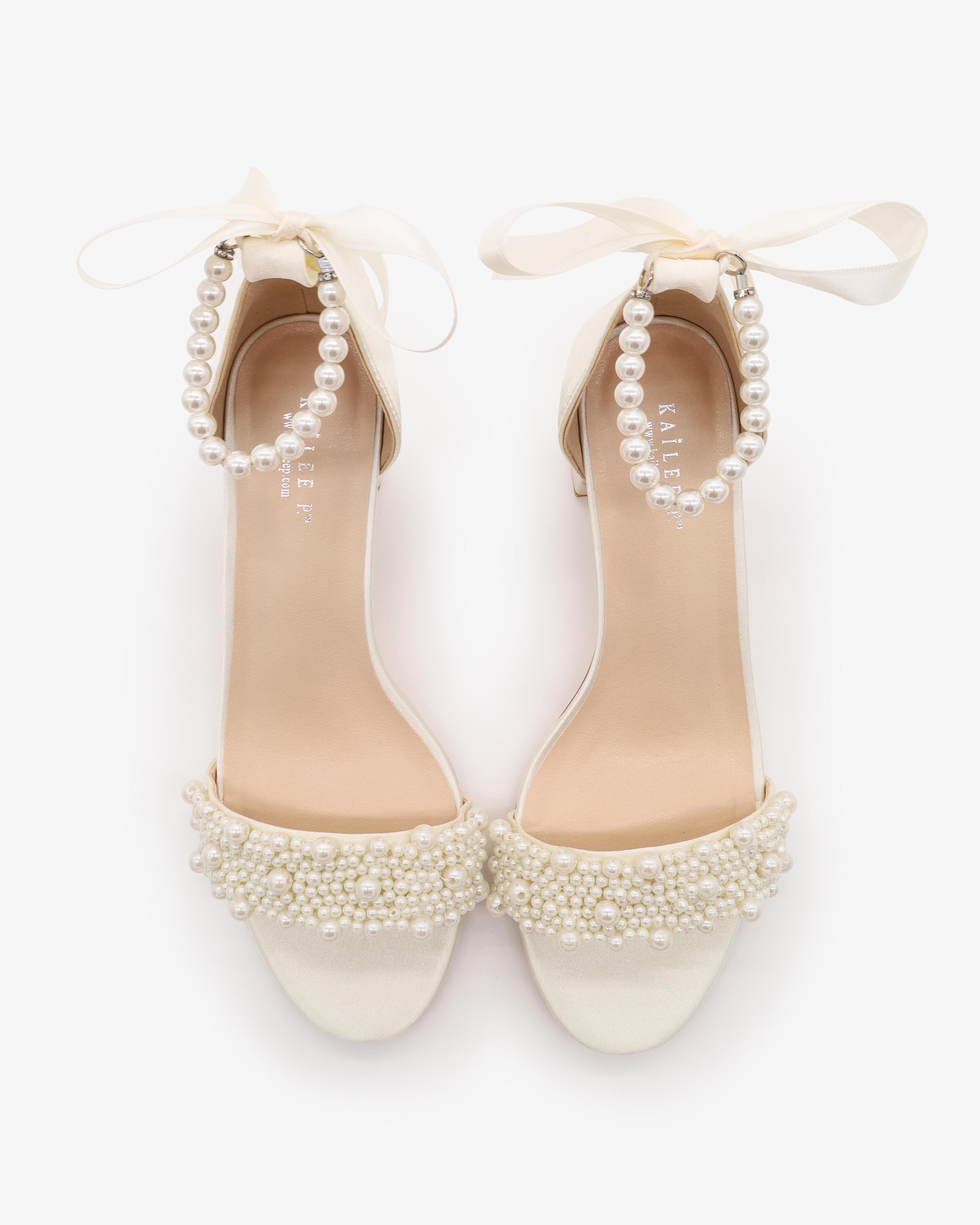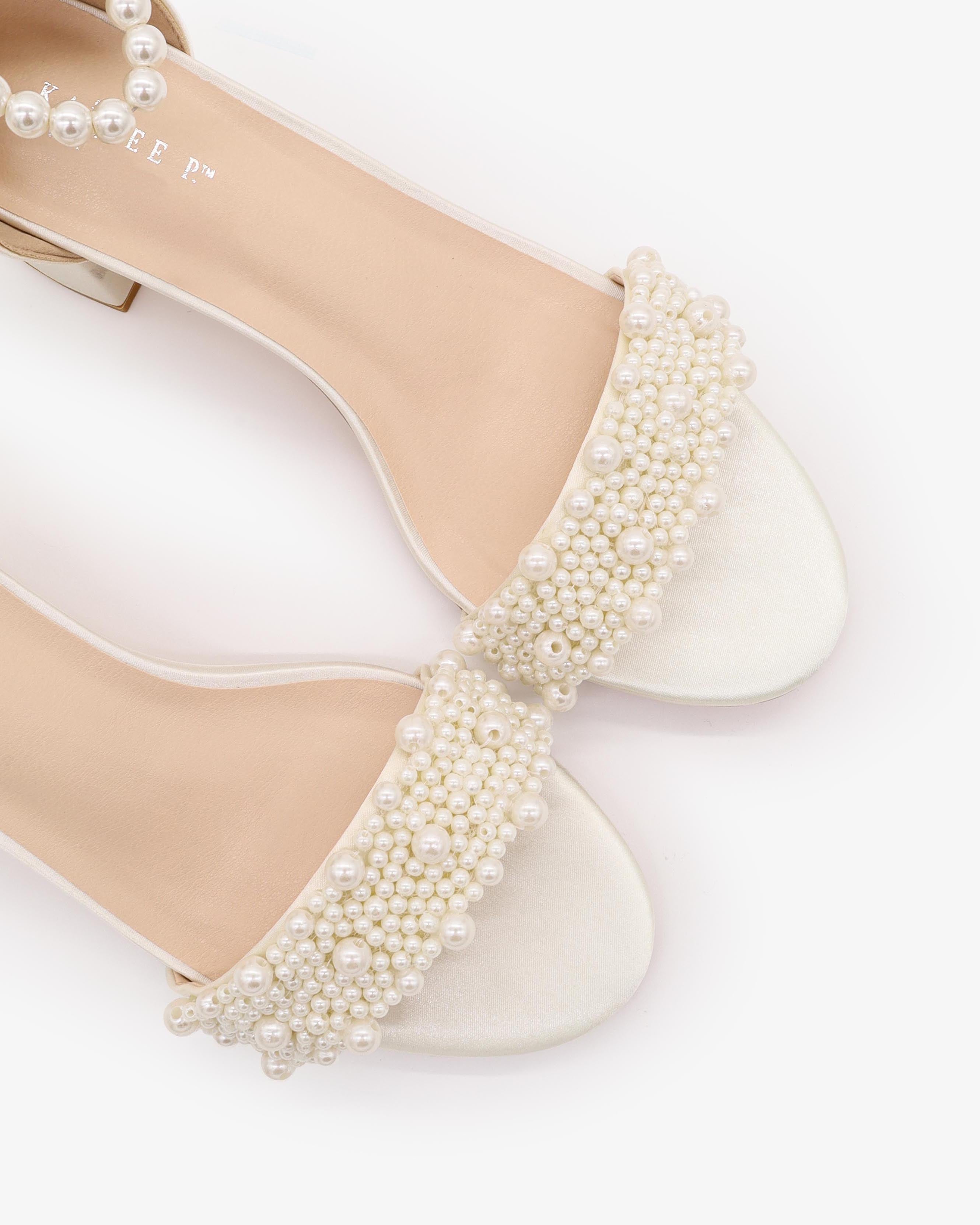 Classic satin block heel sandals adorned with allover pearls on the vamp and pearl ankle strap for romantic, elegant and feminine look. The delicate pearl beads are placed to create a graceful classic style. Simple and easy wear for bridal wear, bridesmaids, holiday party, wedding parties, and any special occasions.