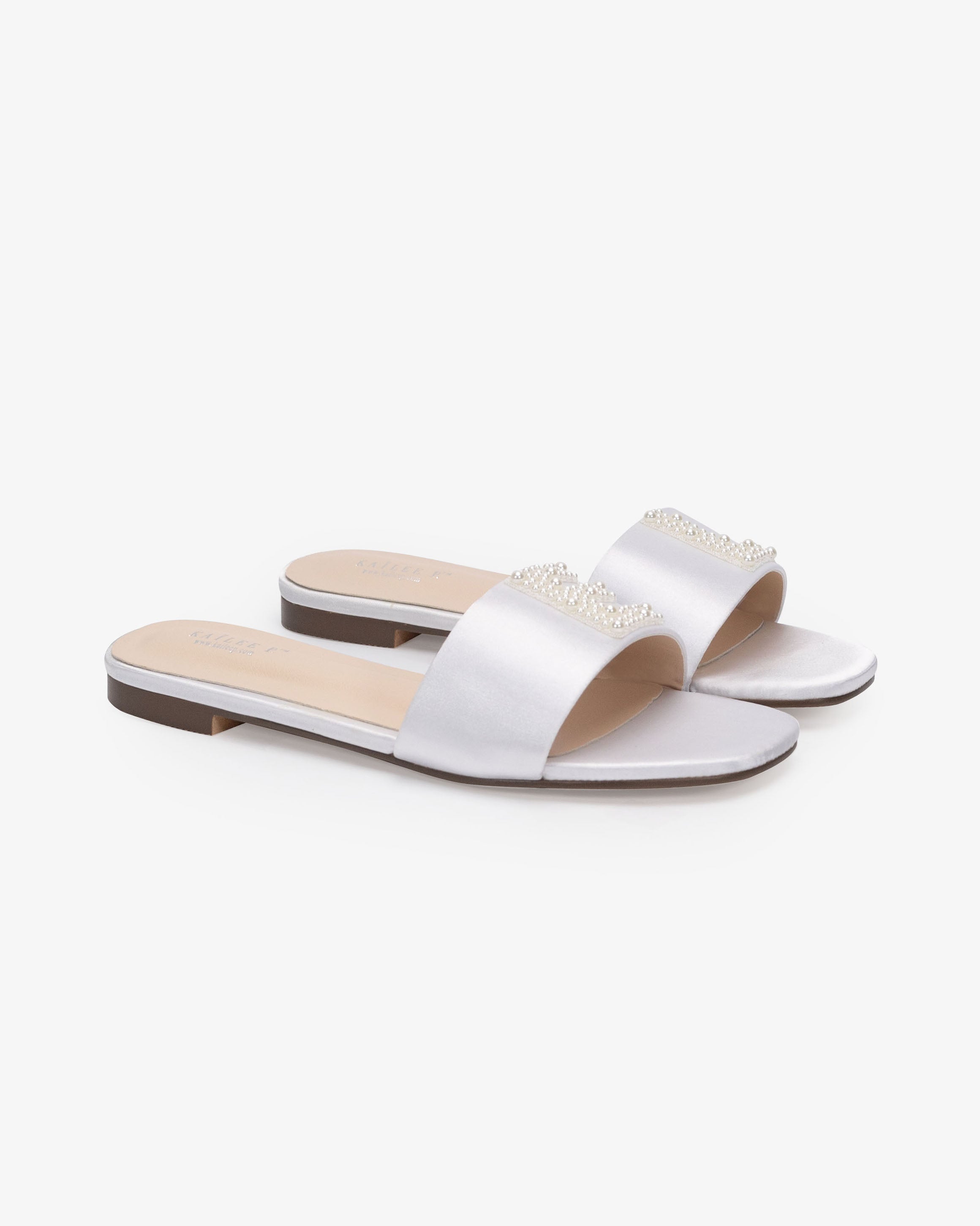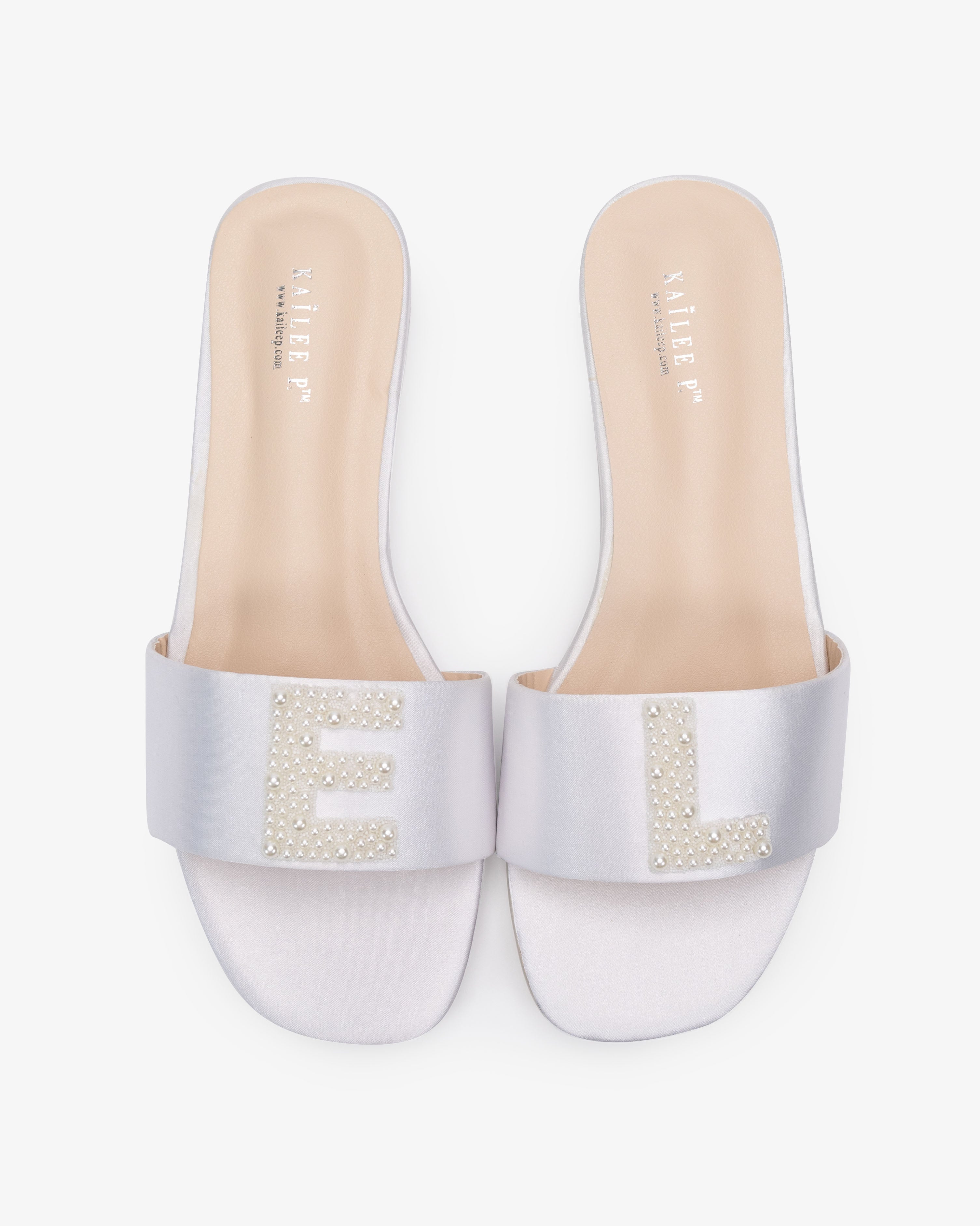 Classic slide flat sandals with embellished personalized all pearls letter at your choice. It's perfect for getting ready on your wedding day, a bridesmaid gift or a comfortable wear to change into and dance the night away. Simple and easy wear for brides, bridesmaids and wedding parties.