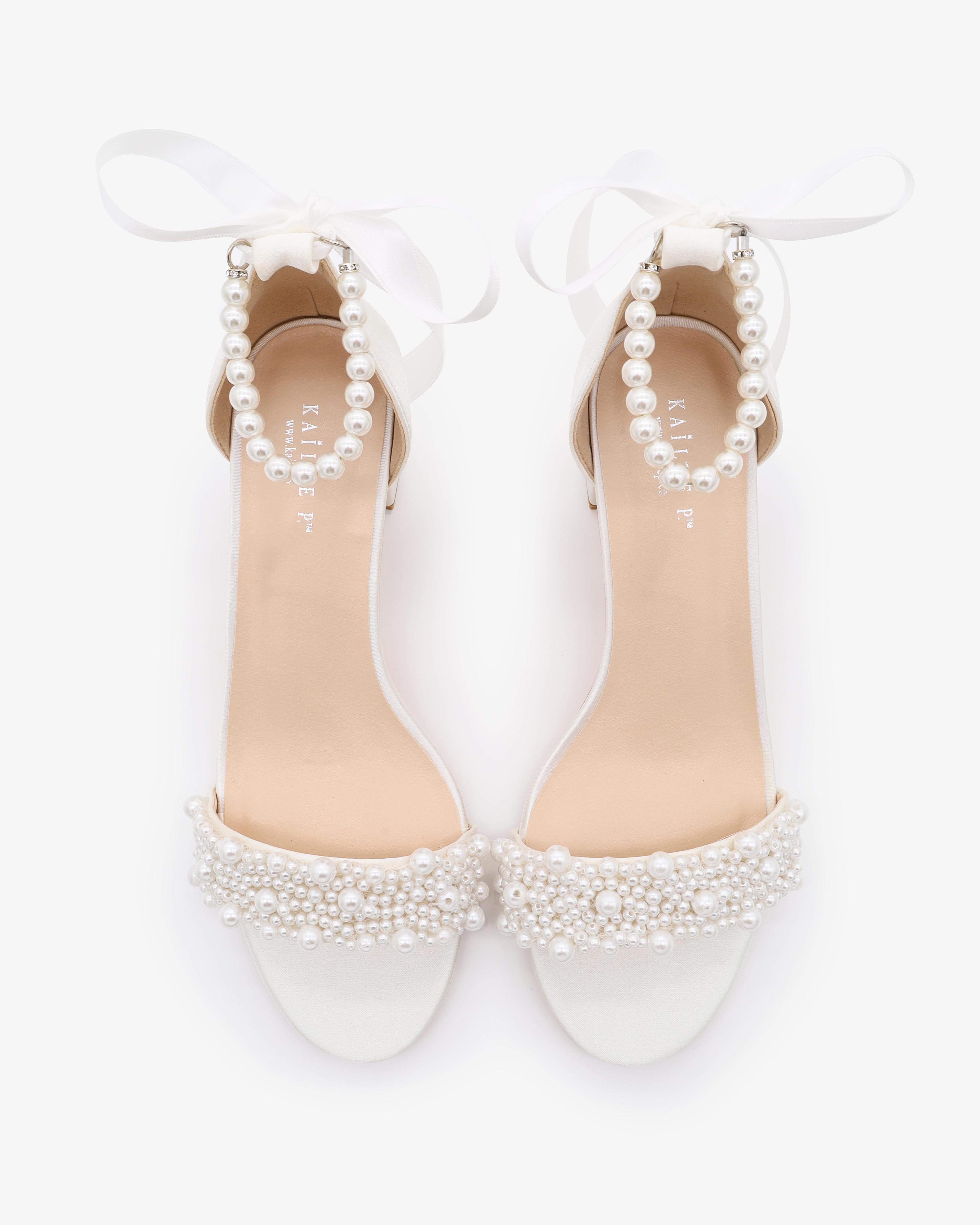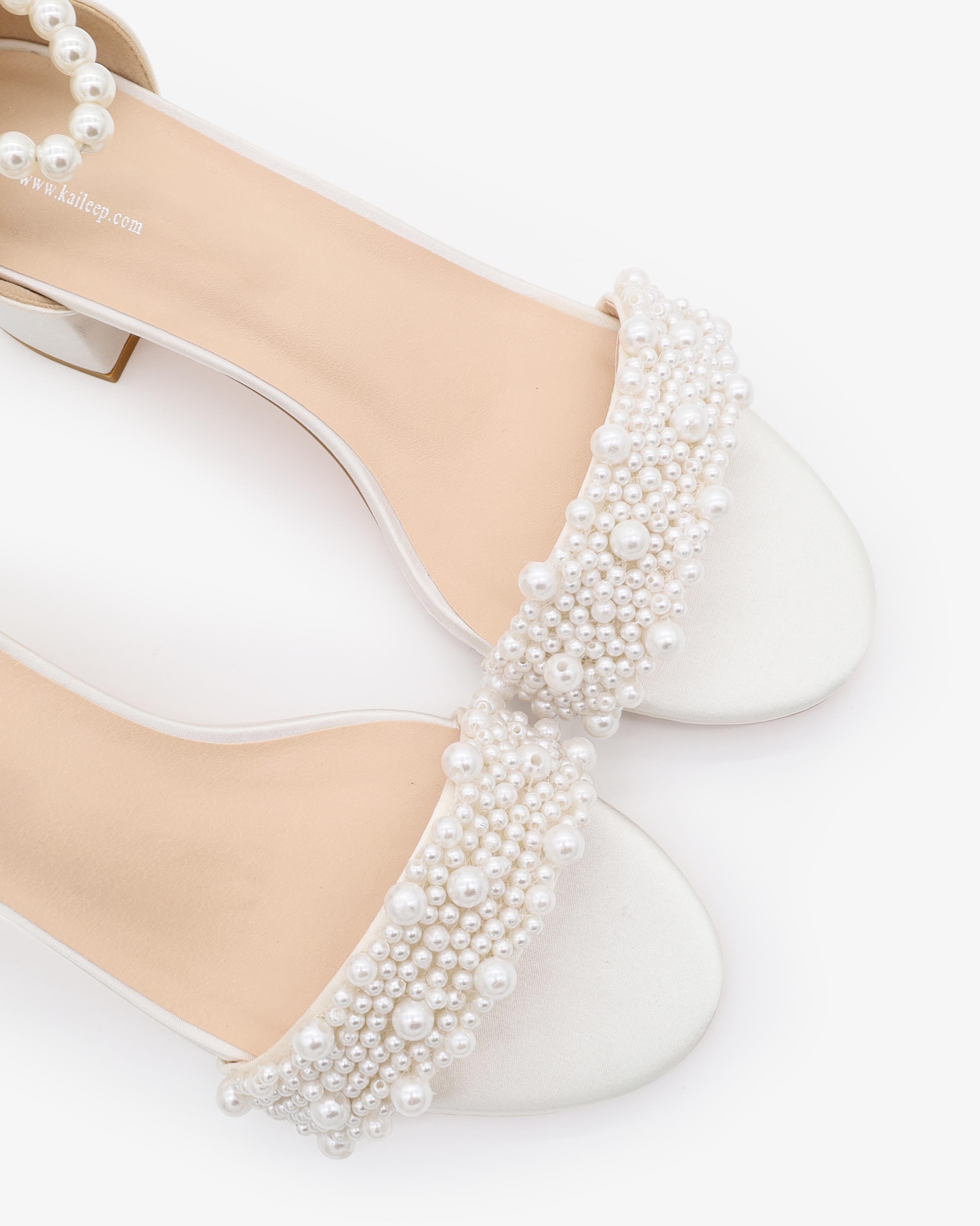 Classic satin block heel sandals adorned with allover pearls on the vamp and pearl ankle strap for romantic, elegant and feminine look. The delicate pearl beads are placed to create a graceful classic style. Simple and easy wear for bridal wear, bridesmaids, holiday party, wedding parties, and any special occasions.