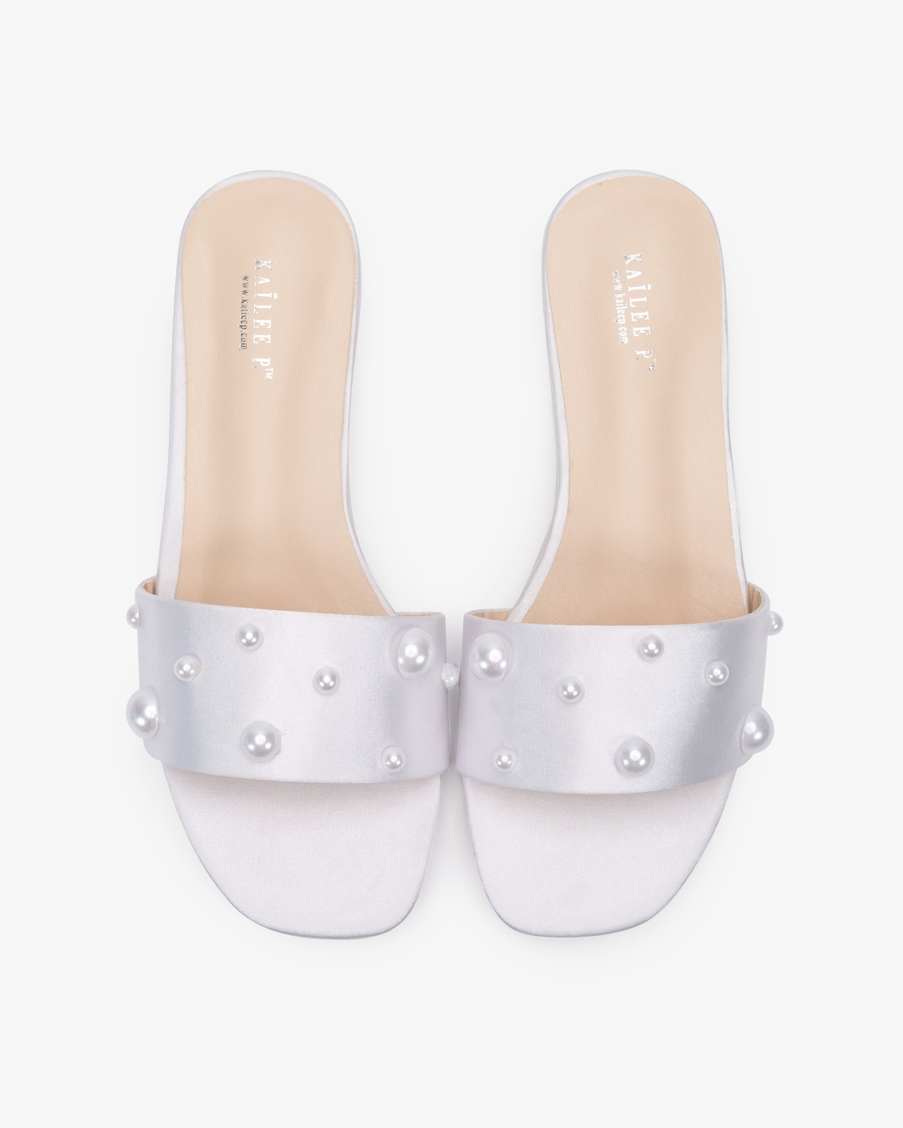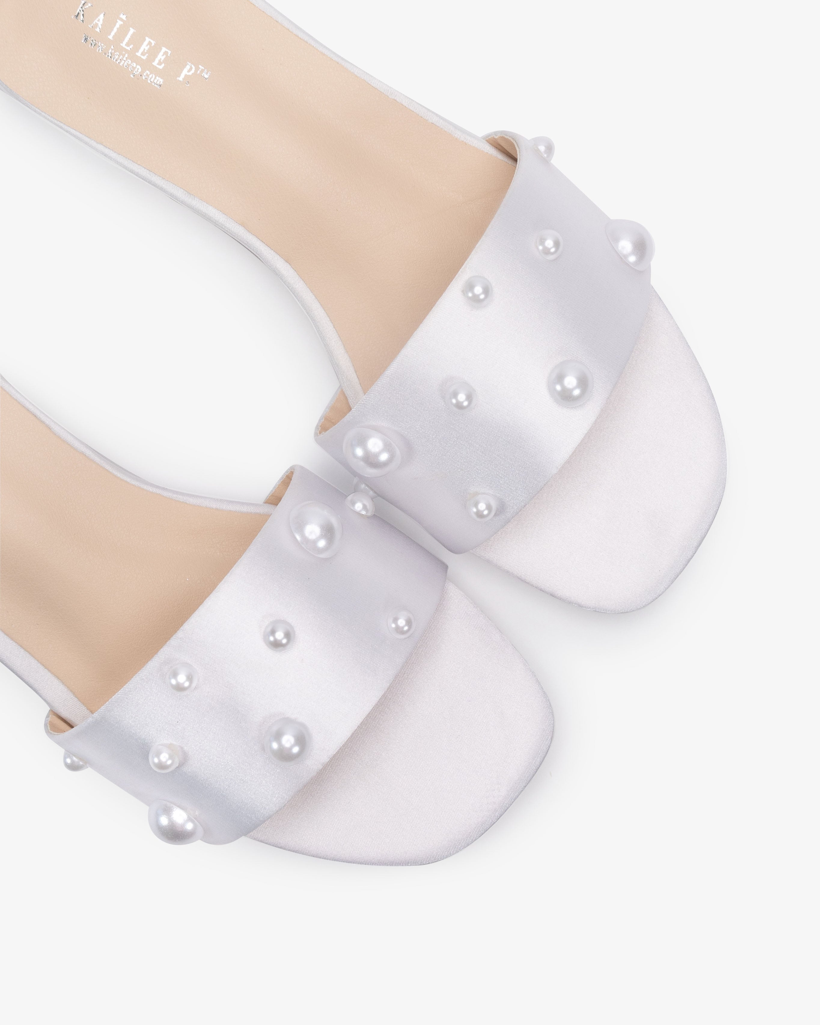 Classic satin slip on sandals adorned with scattered pearls on the vamp for romantic, elegant and feminine look. The delicate pearl beads are placed to create a graceful classic style. Simple and easy wear for bridal wear, bridesmaids, holiday party, wedding parties, and any special occasions.