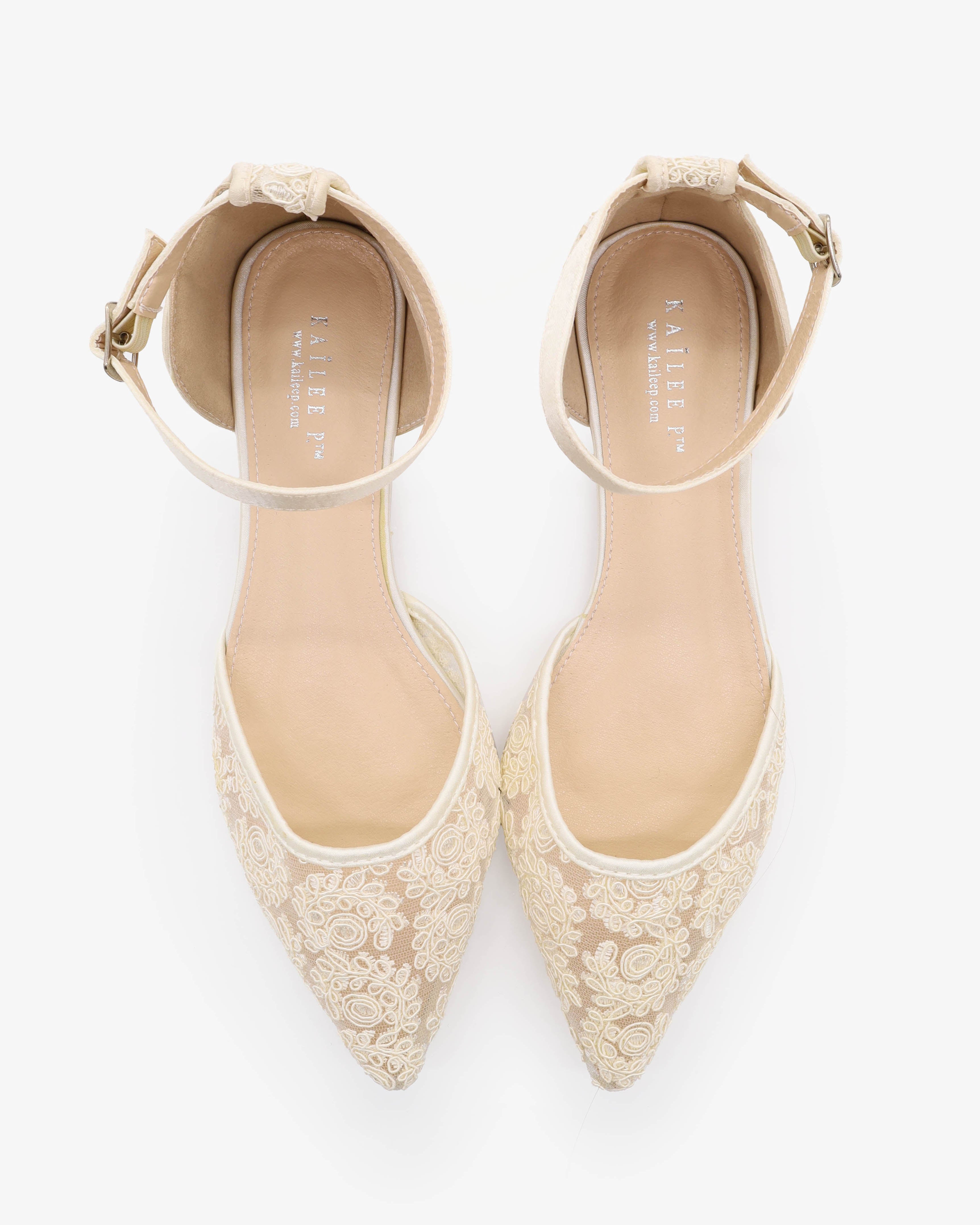 Feminine pointy toe wedding shoes for brides and with ankle strap. Elegant and vintage inspired wear for your special day with comfort of flats to be worn all day.