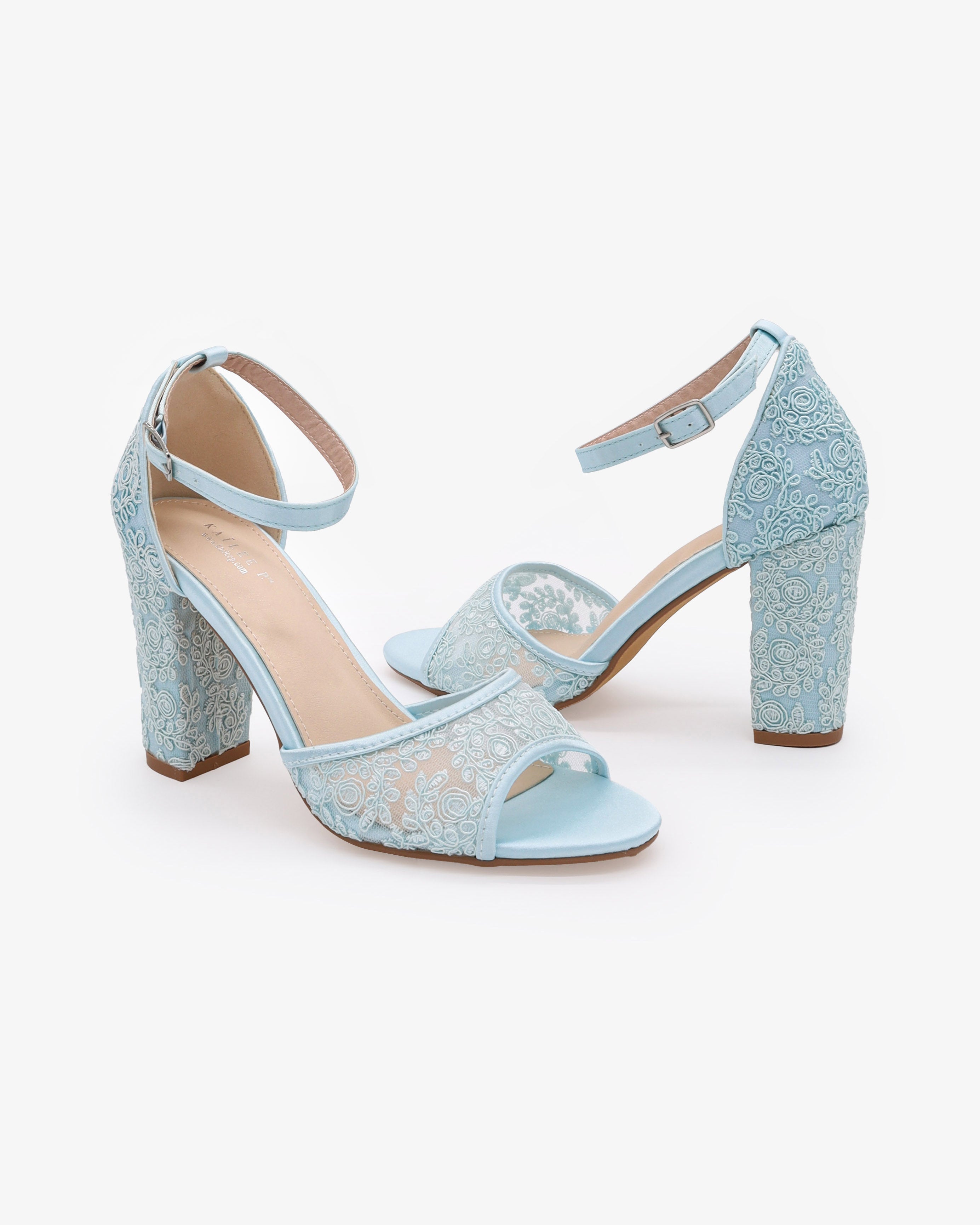 Fun and flirty block heel sandals in crochet lace. Elegance and classic inspired wear for your special day.