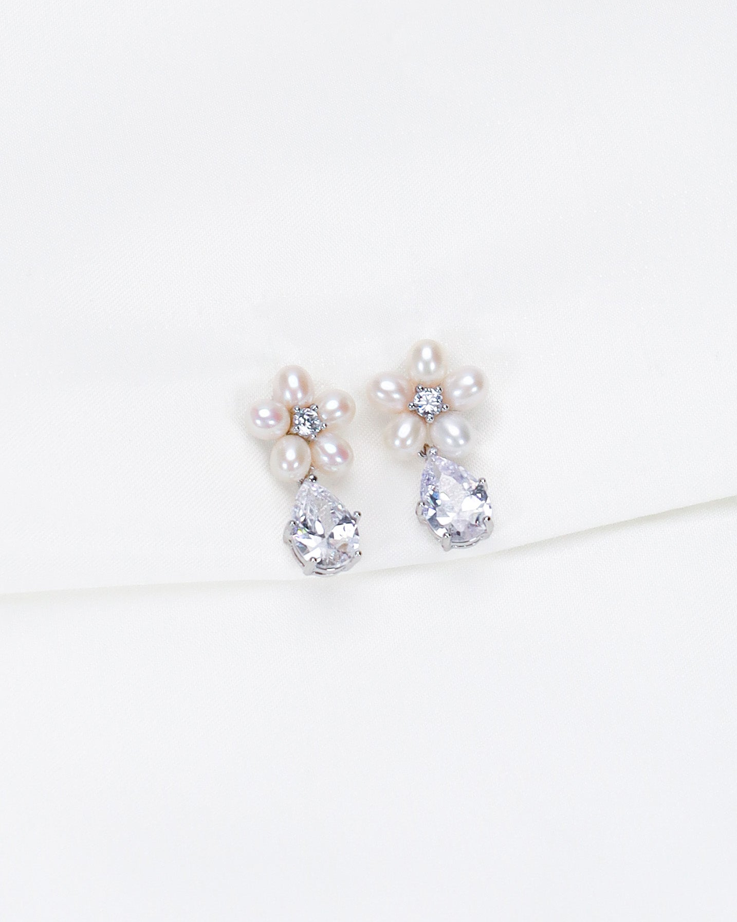 Delicate and classy, these stud earrings add the perfect touch of sparkle to any special outfit. Featuring sweet dainty flower shaped pearls nestled on a rhinestones accents. Lightweight and comfortable for all-day wear.
