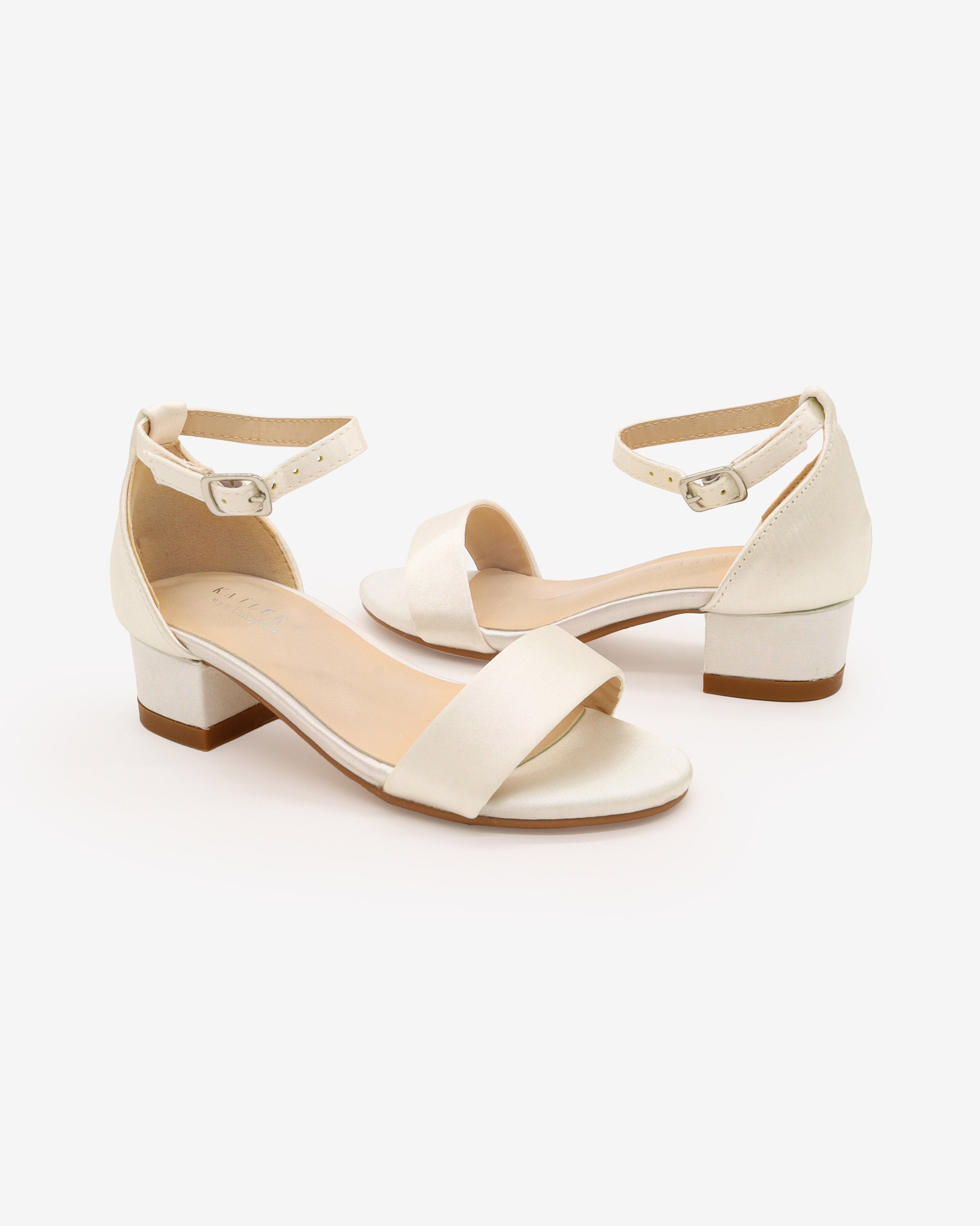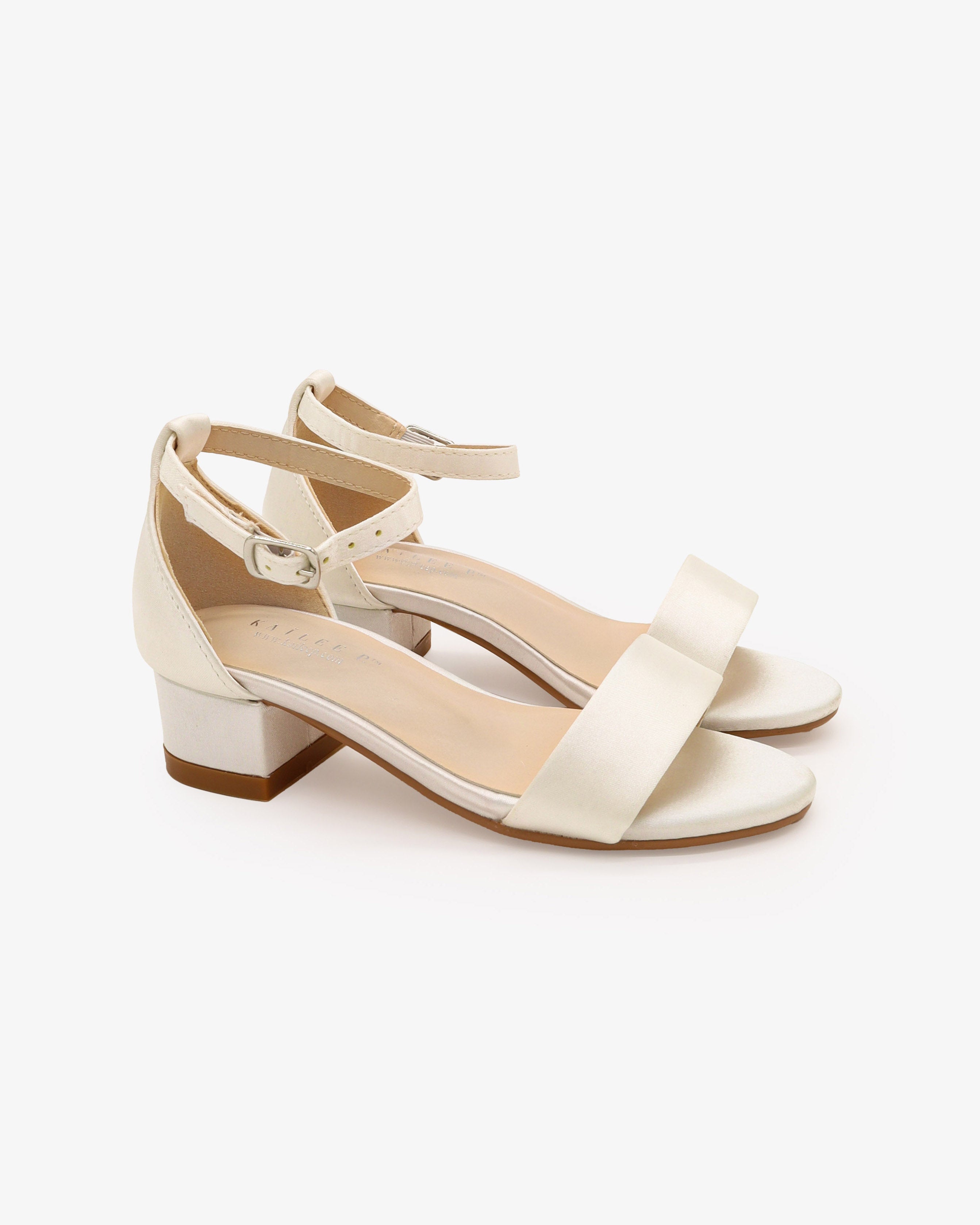 Satin low block heel sandals with removable ankle strap. Simple and sweet for flower girls, communion, parties, baptism, and any special occasions.