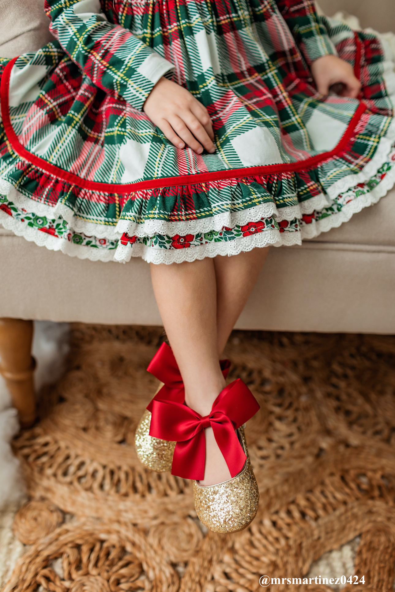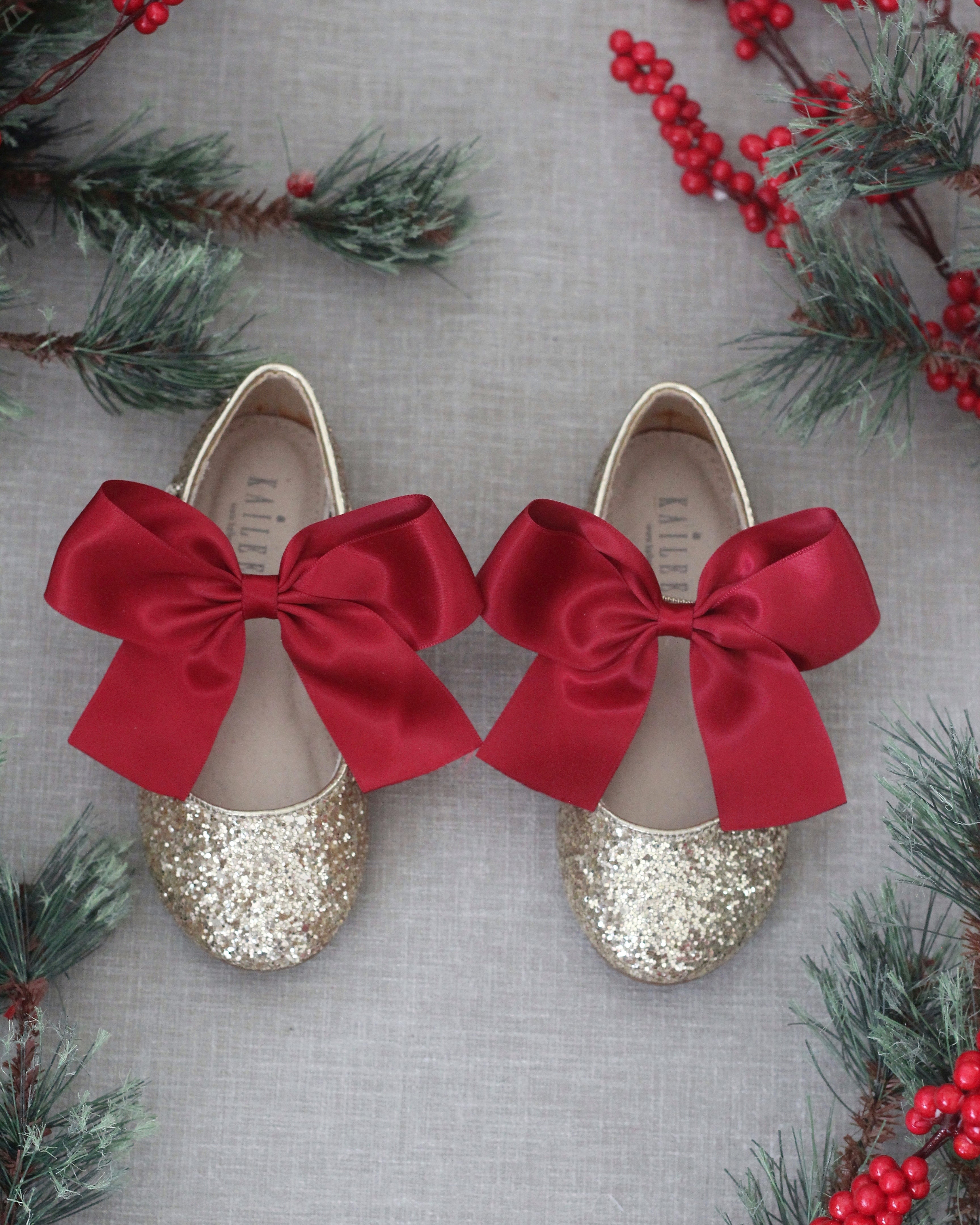 The perfect Holiday shoes! Beautiful allover GOLD rock glitter ballet flats with BRICK RED satin bow. Great for parties, flower girls, birthday parties, holiday pictures or just for the little princess to stay sparkly all day.