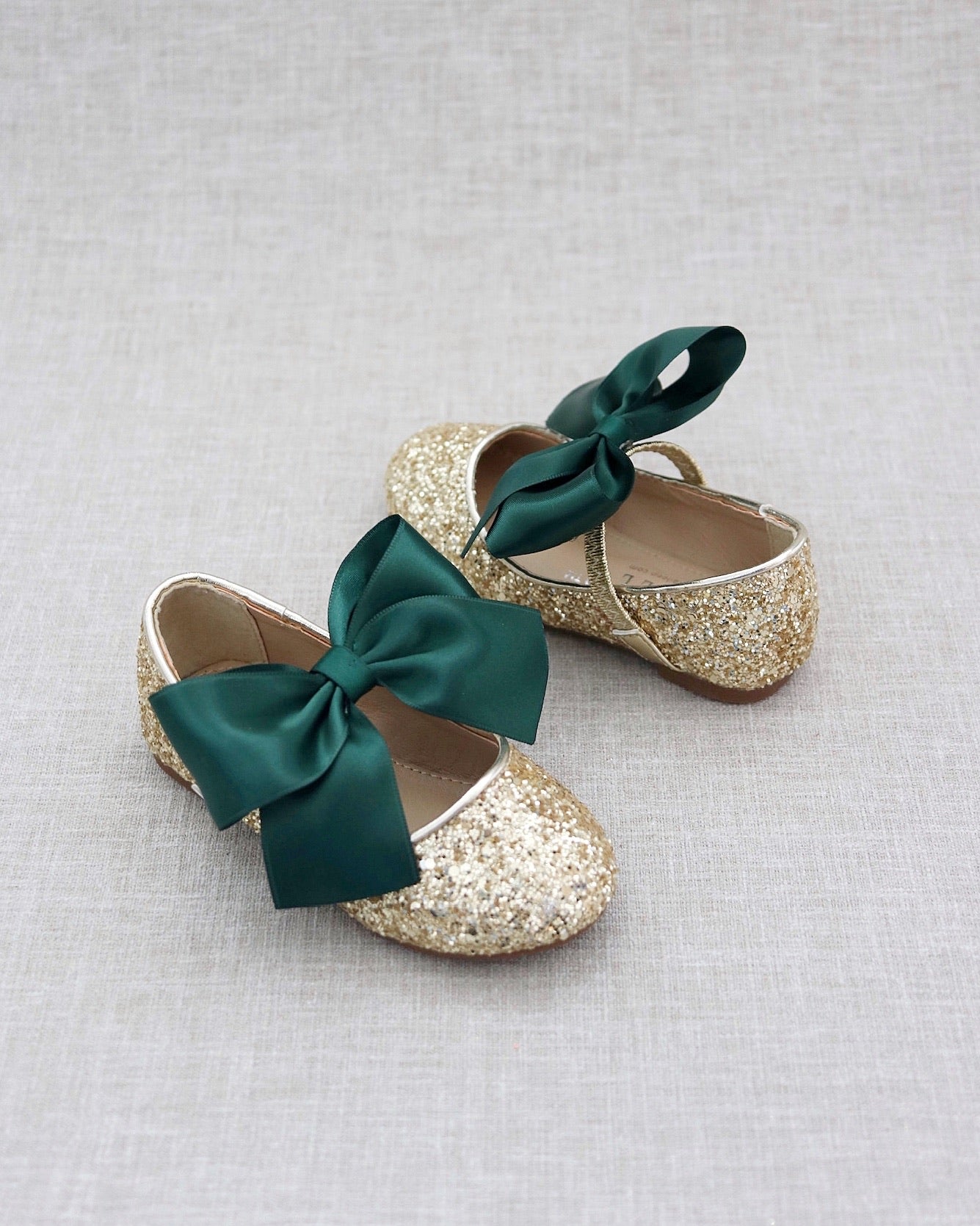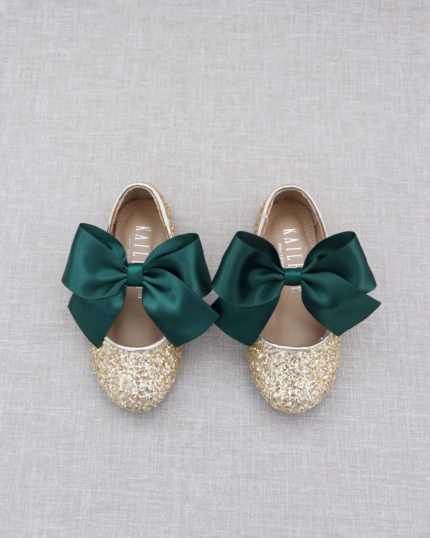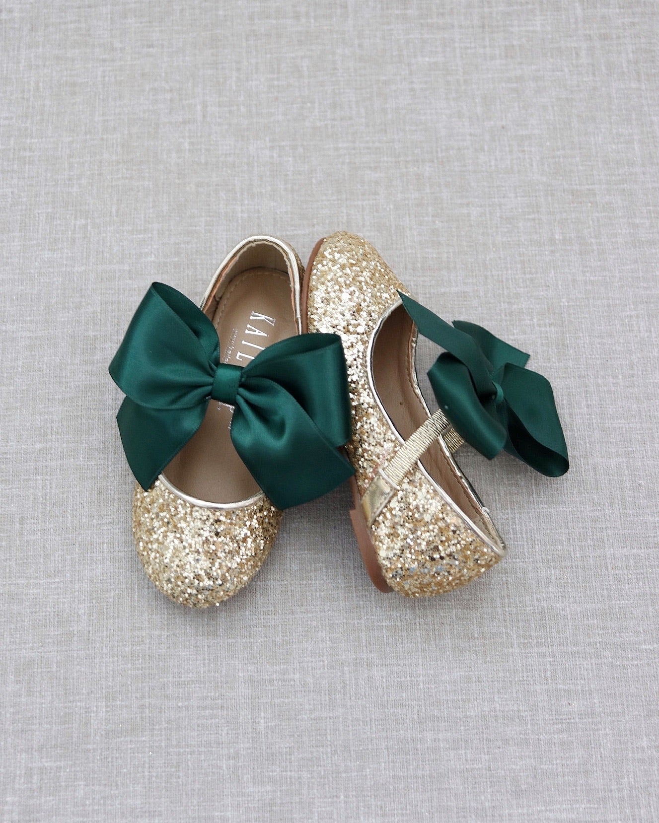 Beautiful allover GOLD rock glitter ballet flats with HUNTER GREEN satin bow. Great for parties, flower girls, birthday parties, holiday pictures or just for the little princess to stay sparkly all day.