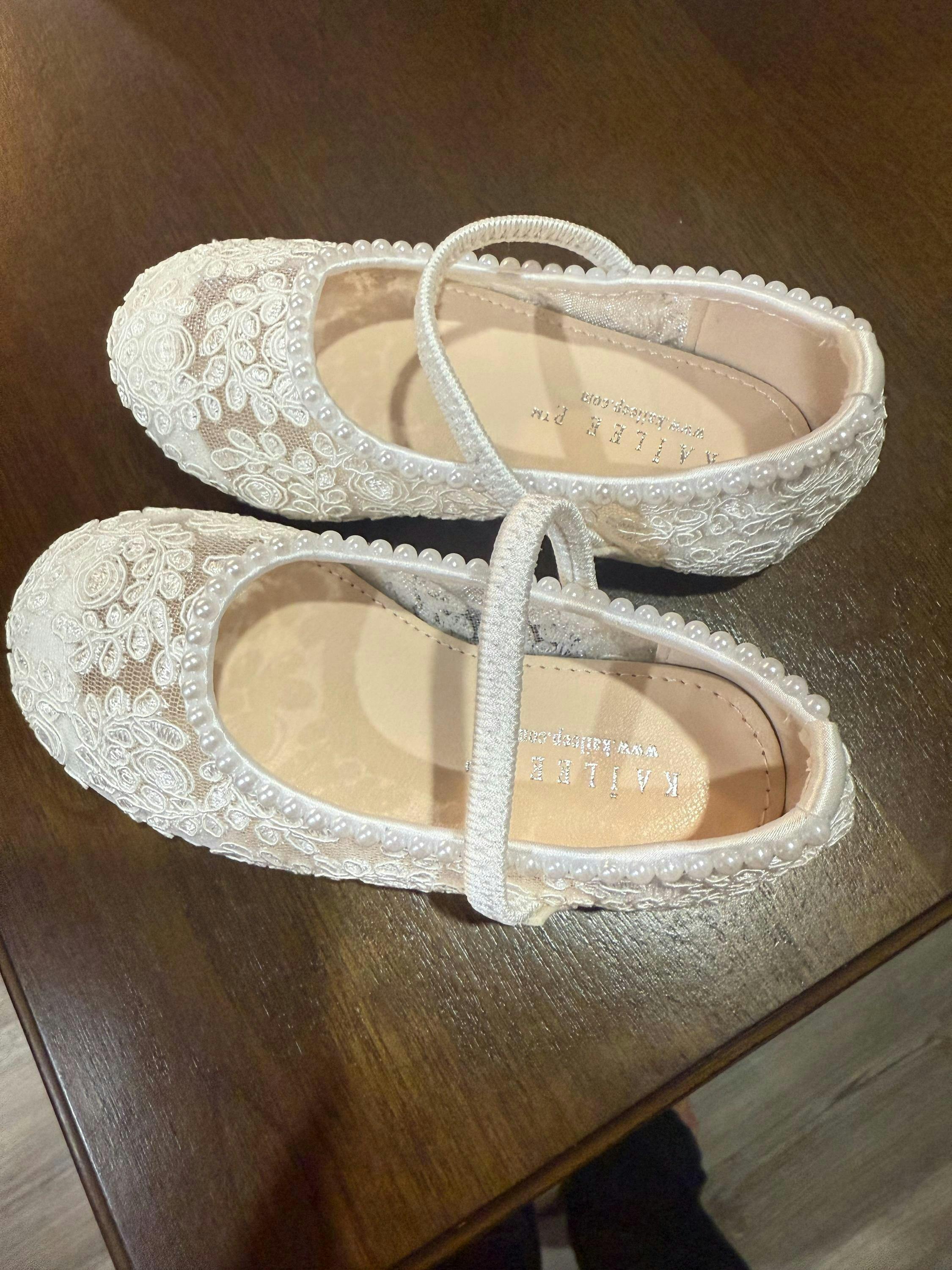 Crochet lace ballet flats with added with mini pearls for more adorable look. For flower girls, princess costumes, baptism, christening and parties. The delicate mini pearl beads are placed carefully by hand made to order to create a delicate design.