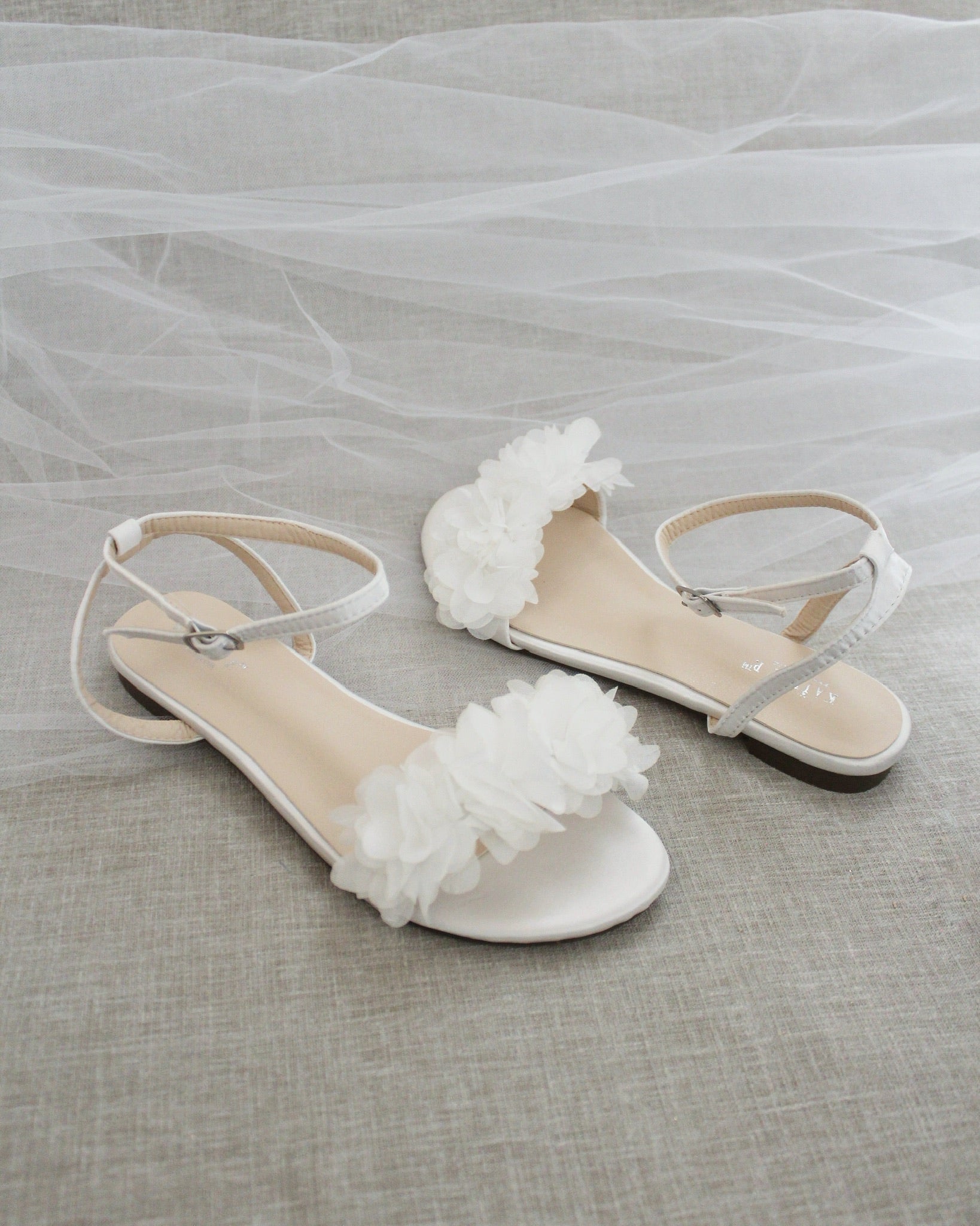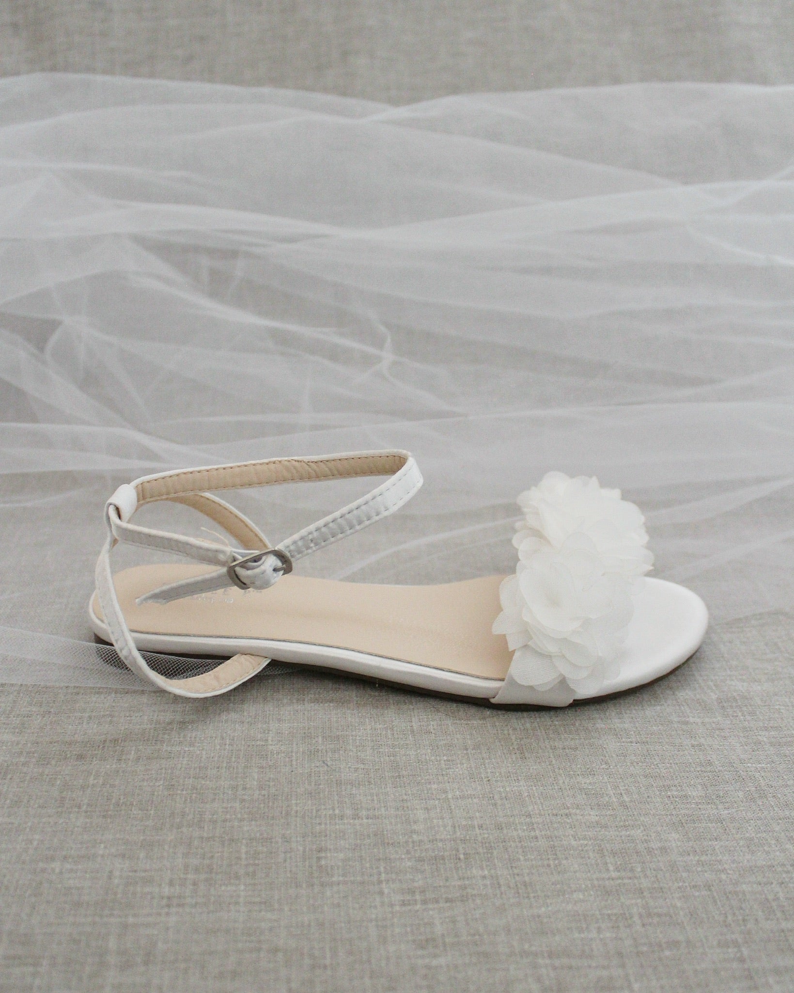 Classy satin flat sandals with a chiffon flowers and ankle strap. Effortless yet adorable to wear on your favorite occasion. Can be pair with dress or casual look. Flowers are done by hand made to order. Perfect for brides, bridesmaids, flower girls, holiday party, prom night, and any special occasions.