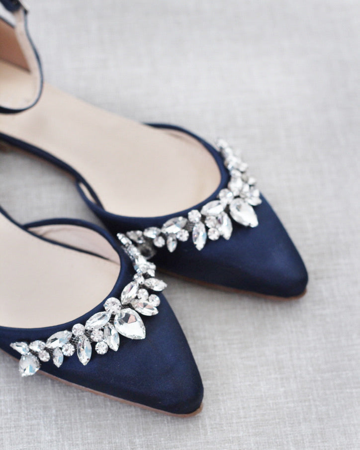 Embellished pointy toe flats with sparkly row of rhinestones across toe with detachable ankle strap. Comfort with simplicity perfect for brides and bridesmaids.