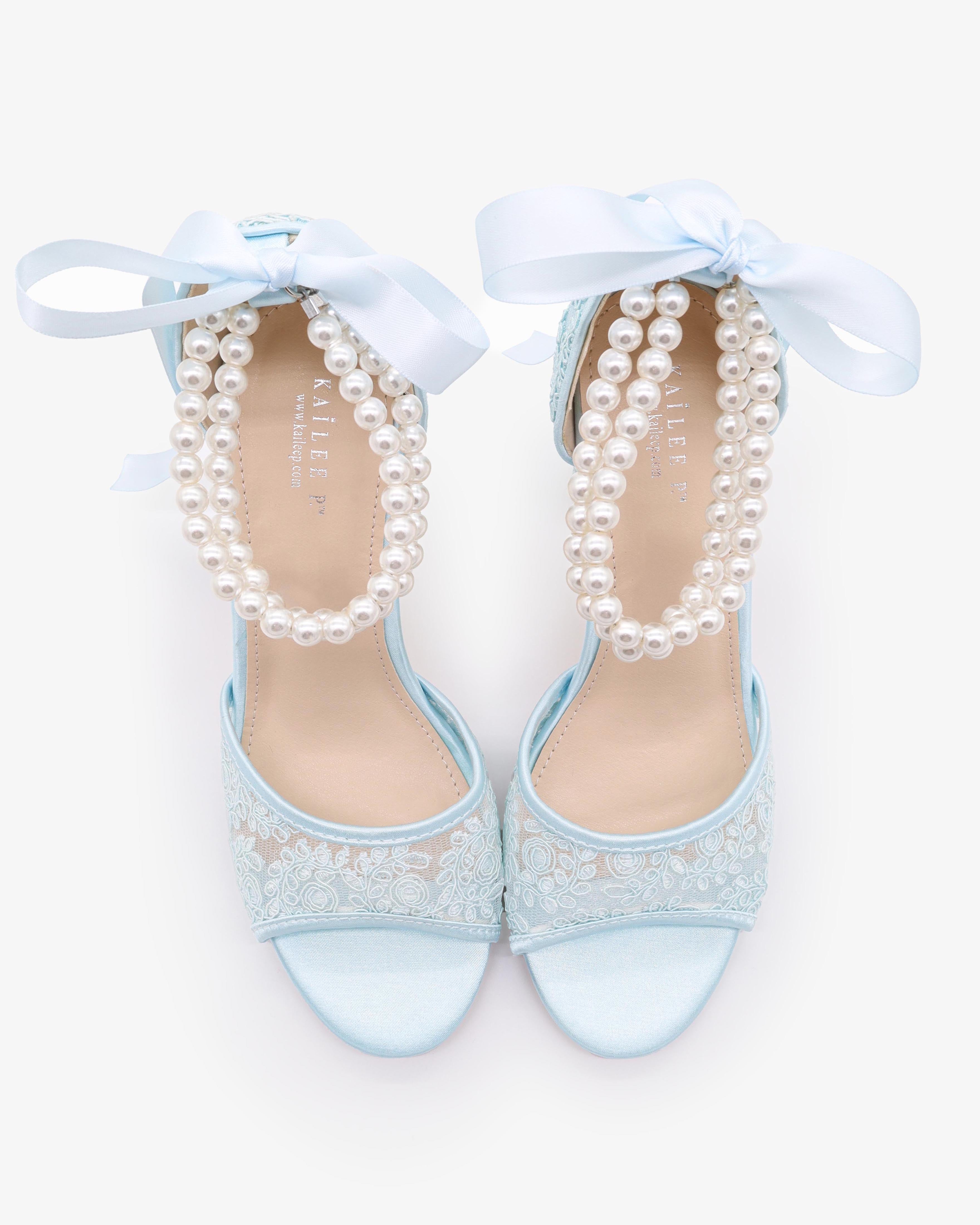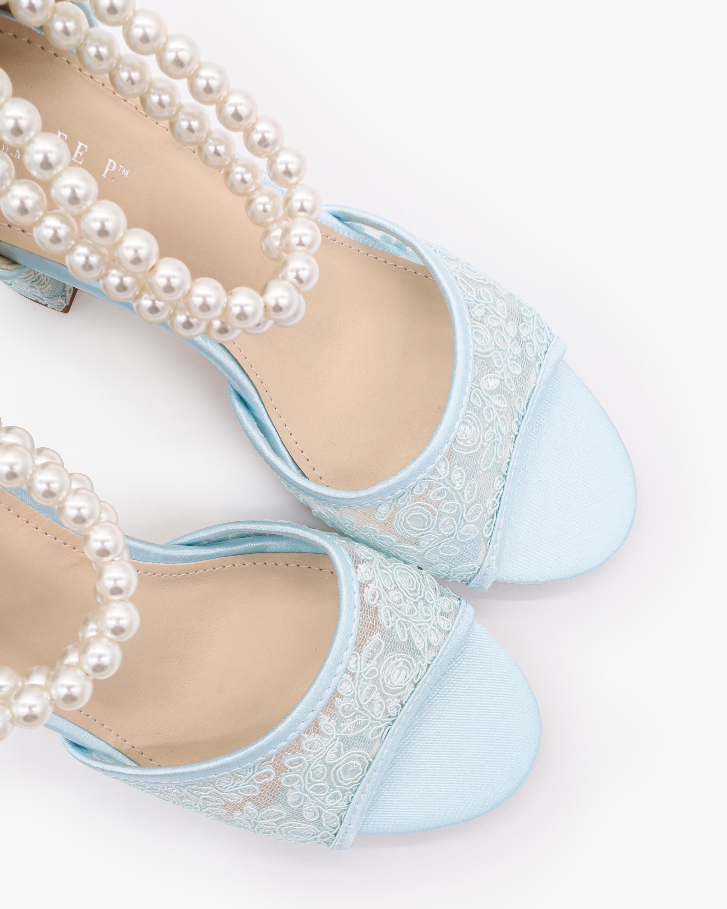 Crochet Lace Block Heel Sandals with Double Pearls Ankle Strap