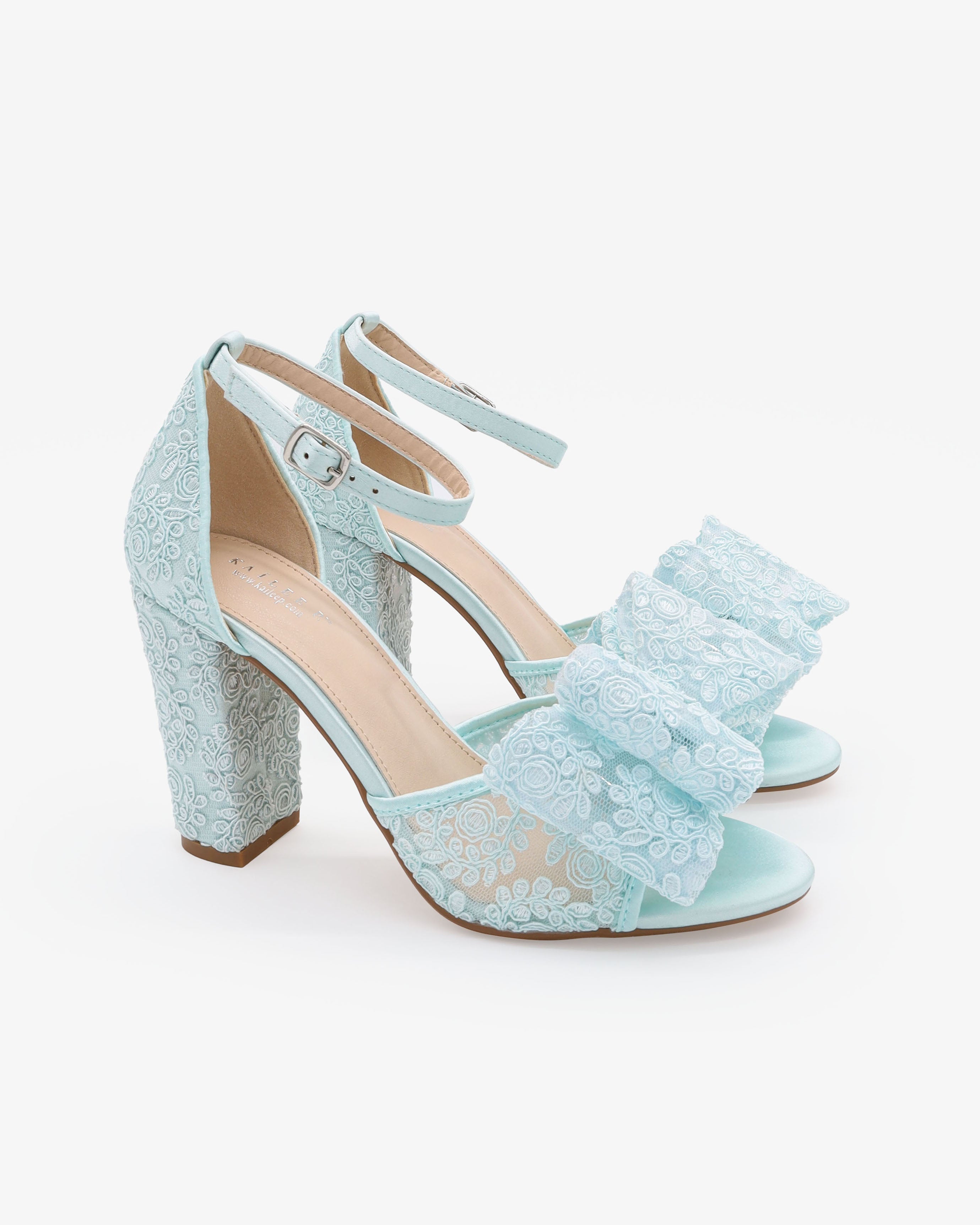 Fun and flirty block heel sandals in crochet lace with added an oversized crochet lace bow will create a dainty yet classic look to any occasions. An elegance and classic addition to your wedding look, bridesmaids, party, prom, date night, and any special occasions. The light blue color can easily be your something blue.