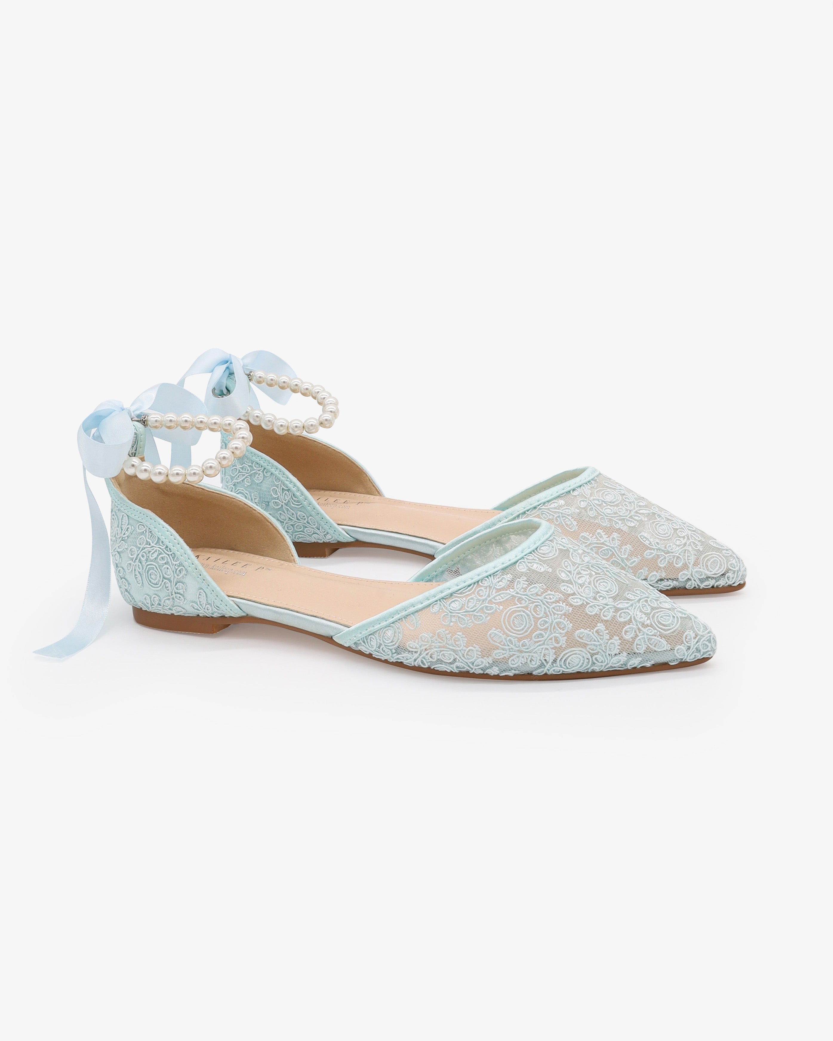 Crochet lace pointy toe flats for comfortable wear throughout your special day and perfect for wedding party, brides, bridesmaids, prom night, date night, or any occasions. With pearl ankle strap to create a classic yet sophisticated look for any occasion. The light blue colors can easily be your something blue.
