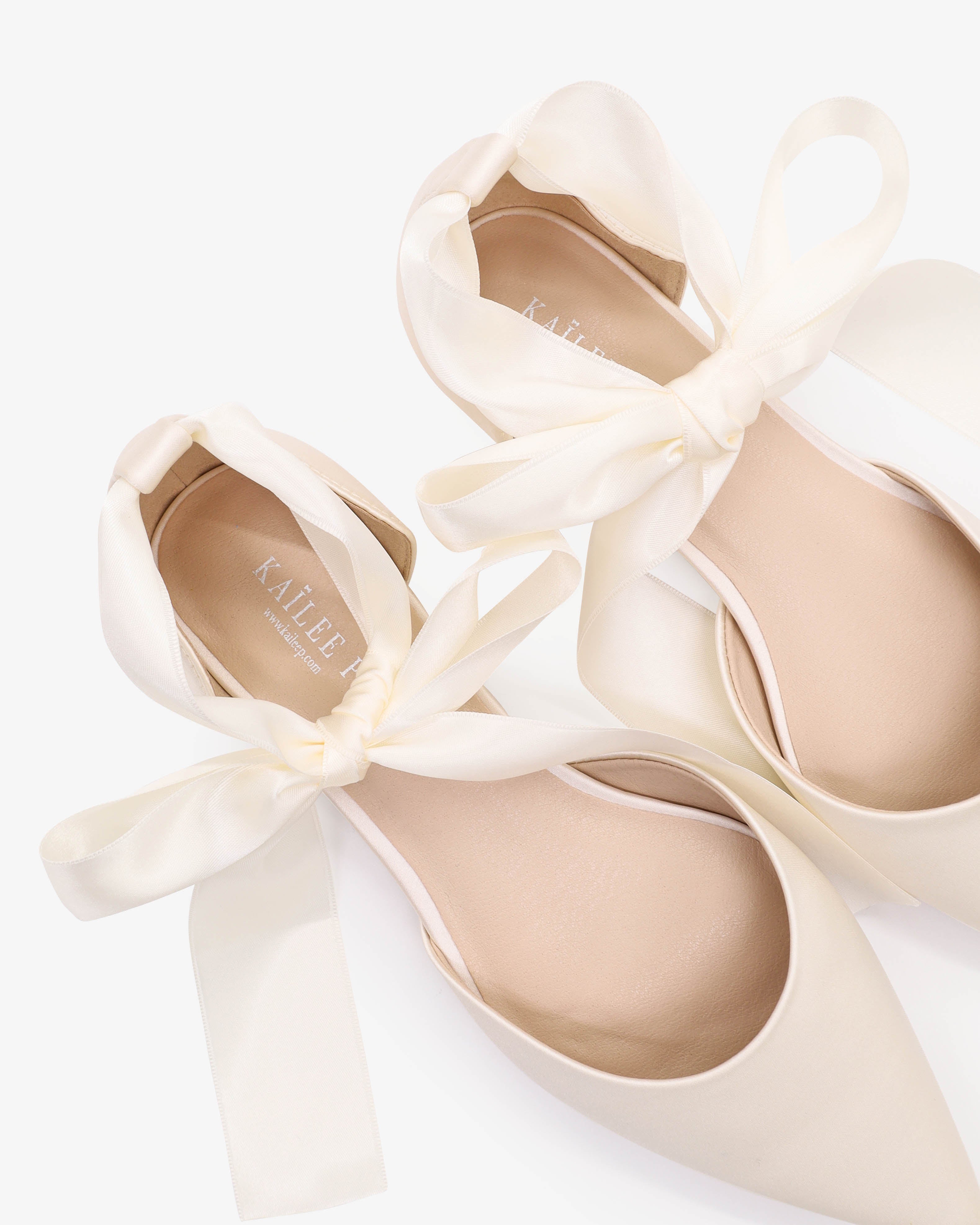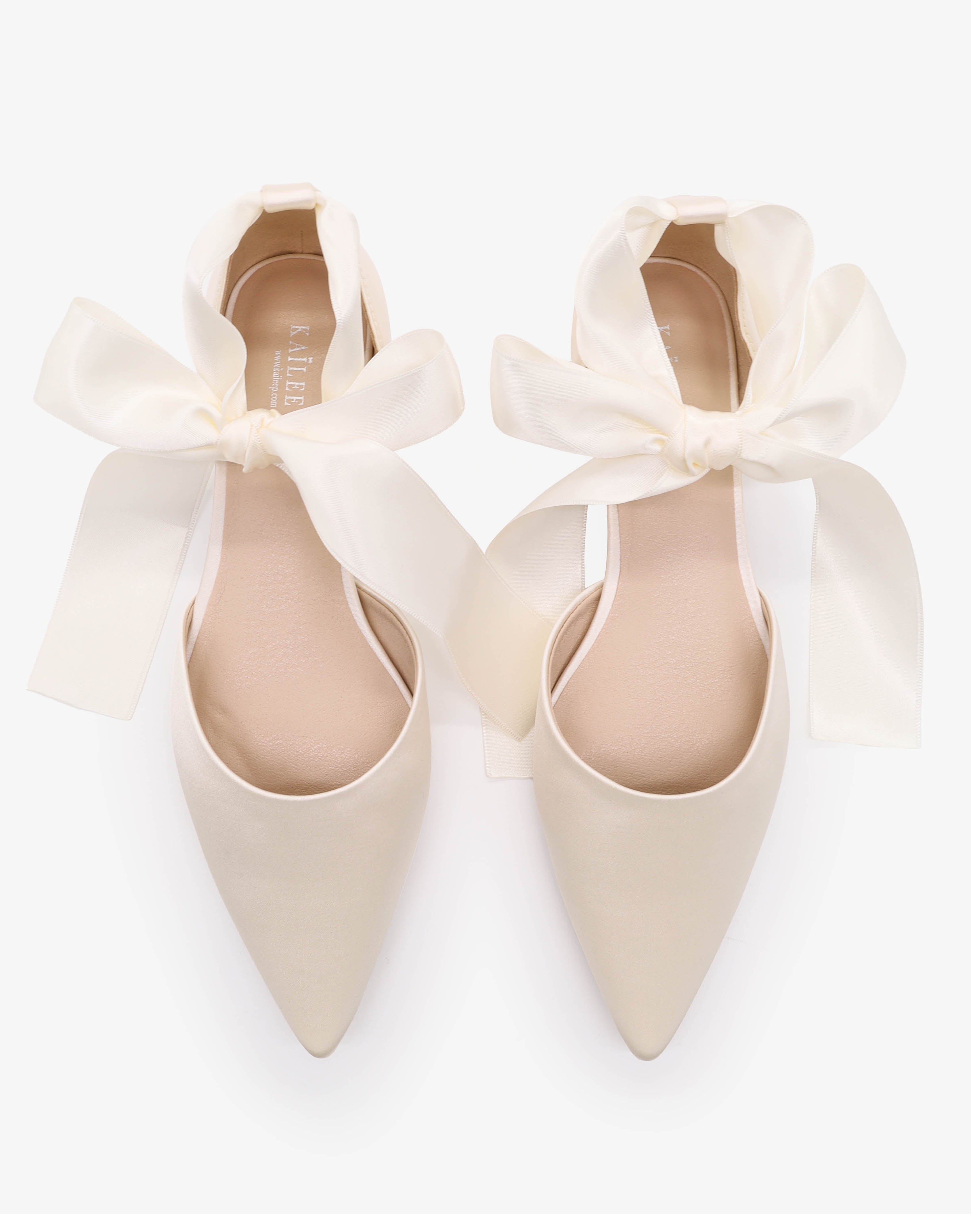 Satin pointy toe flats with satin ankle tie or ballerina lace up. Comfortable wedding shoes throughout ceremony and reception to dance the night away.