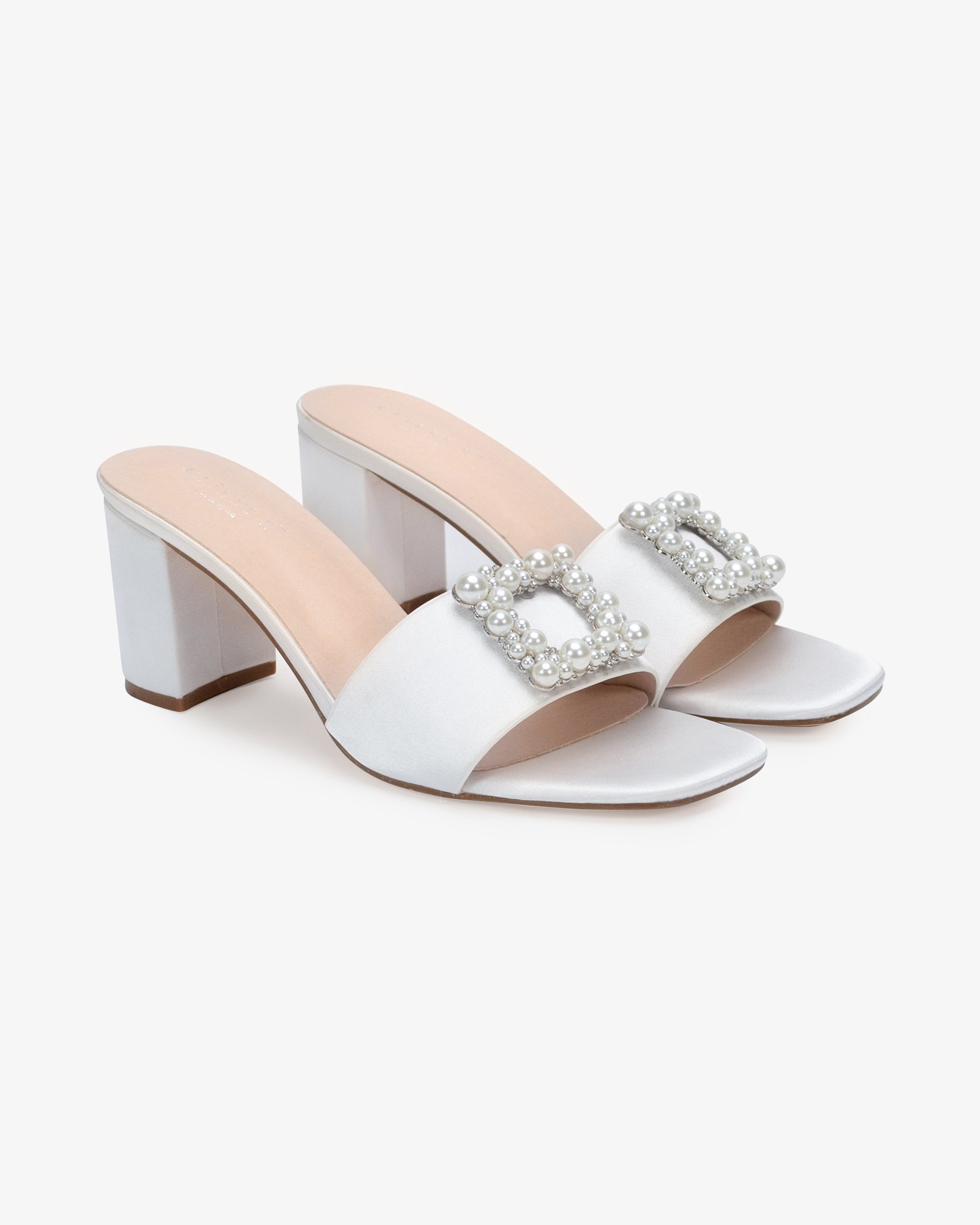 Satin Block Heels Slide Wedding Sandals with Pearlisse Buckle