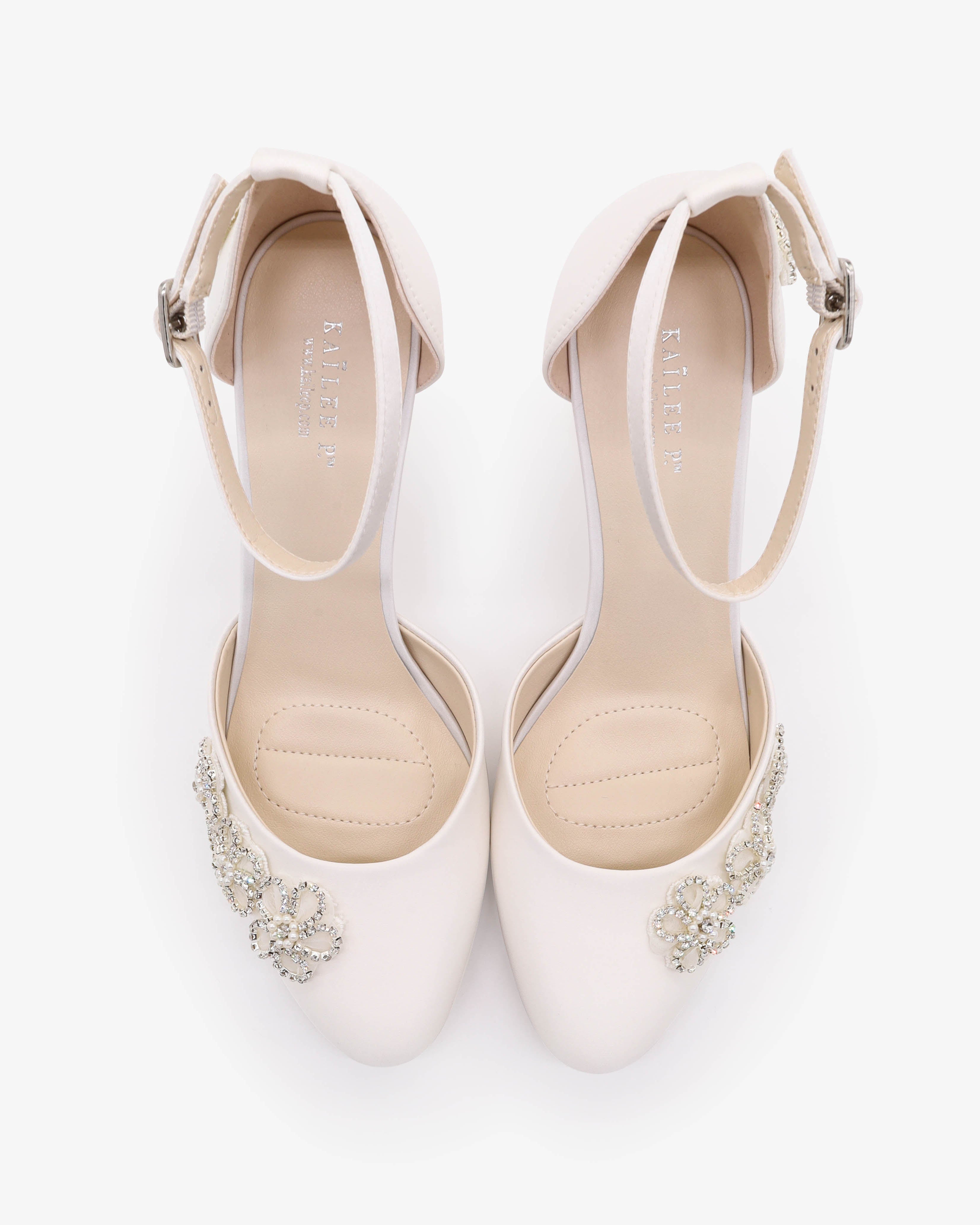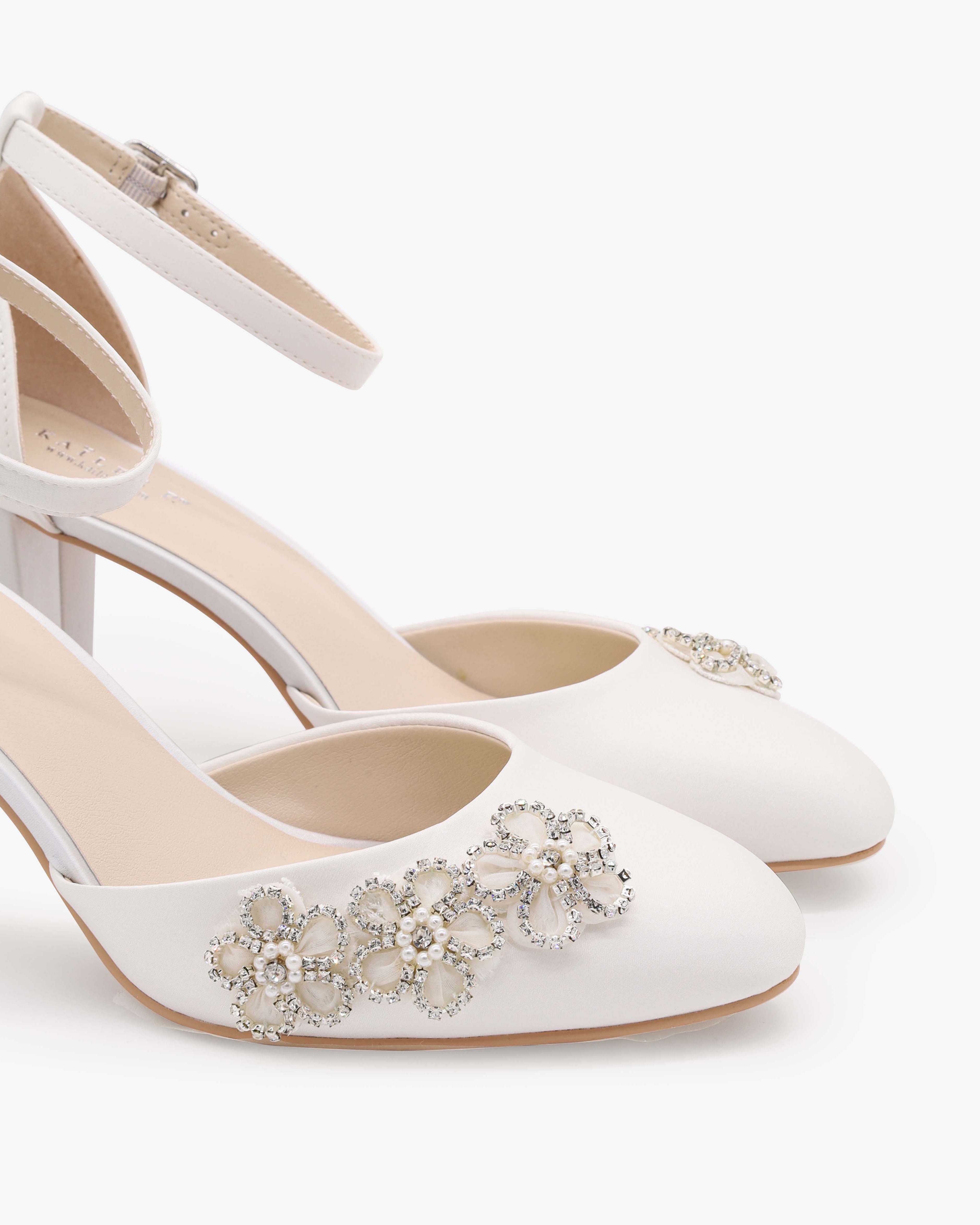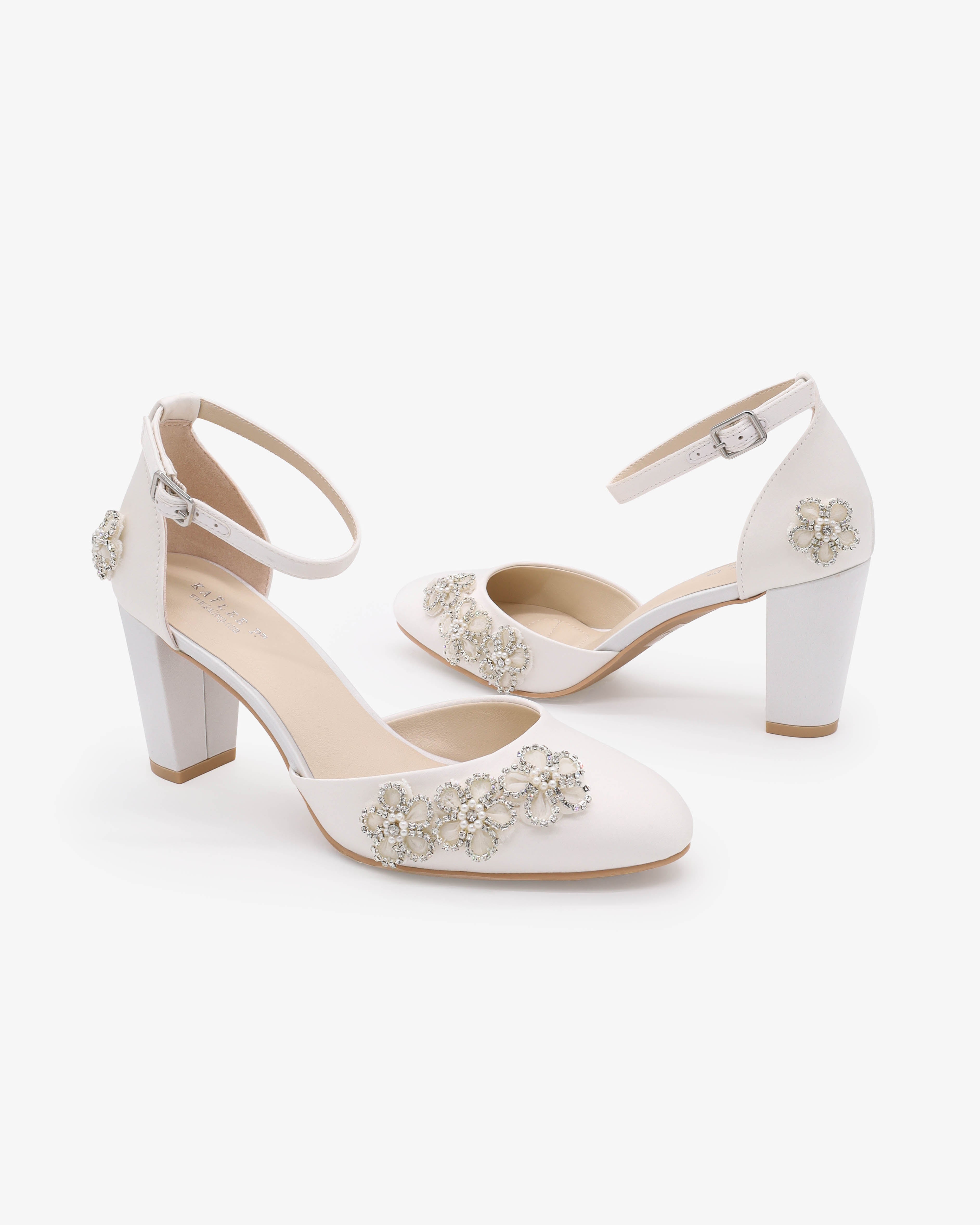 Satin Wedding Block Heel with Rhinestones Chassia Flower