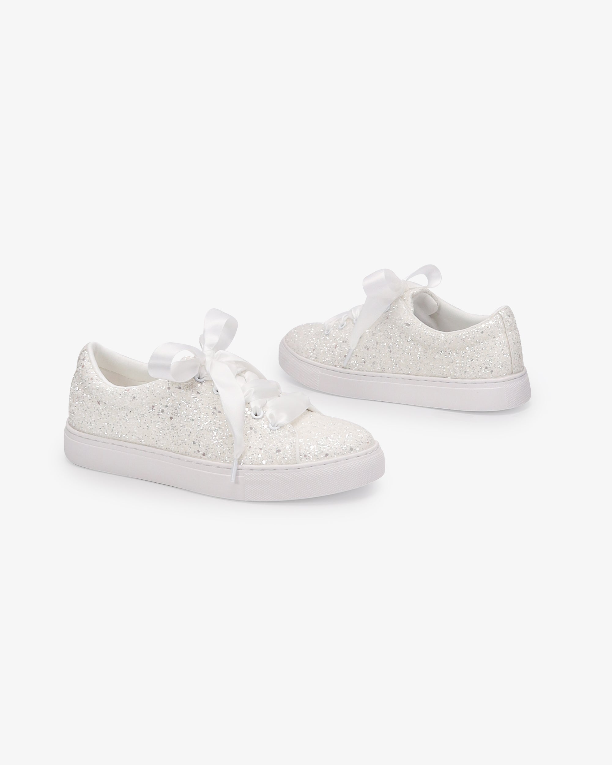 This rock glitter wedding sneakers combine both comfort and glamour for any special occasions while adding a touch of personality to your outfit. The platform provides extra cushions, allowing you to dance the night away with ease. Perfect for wedding, bridesmaids, bridal shower, prom, birthday, or even pair them with your casual look. Choose between satin or sheer laces to customize your look.
