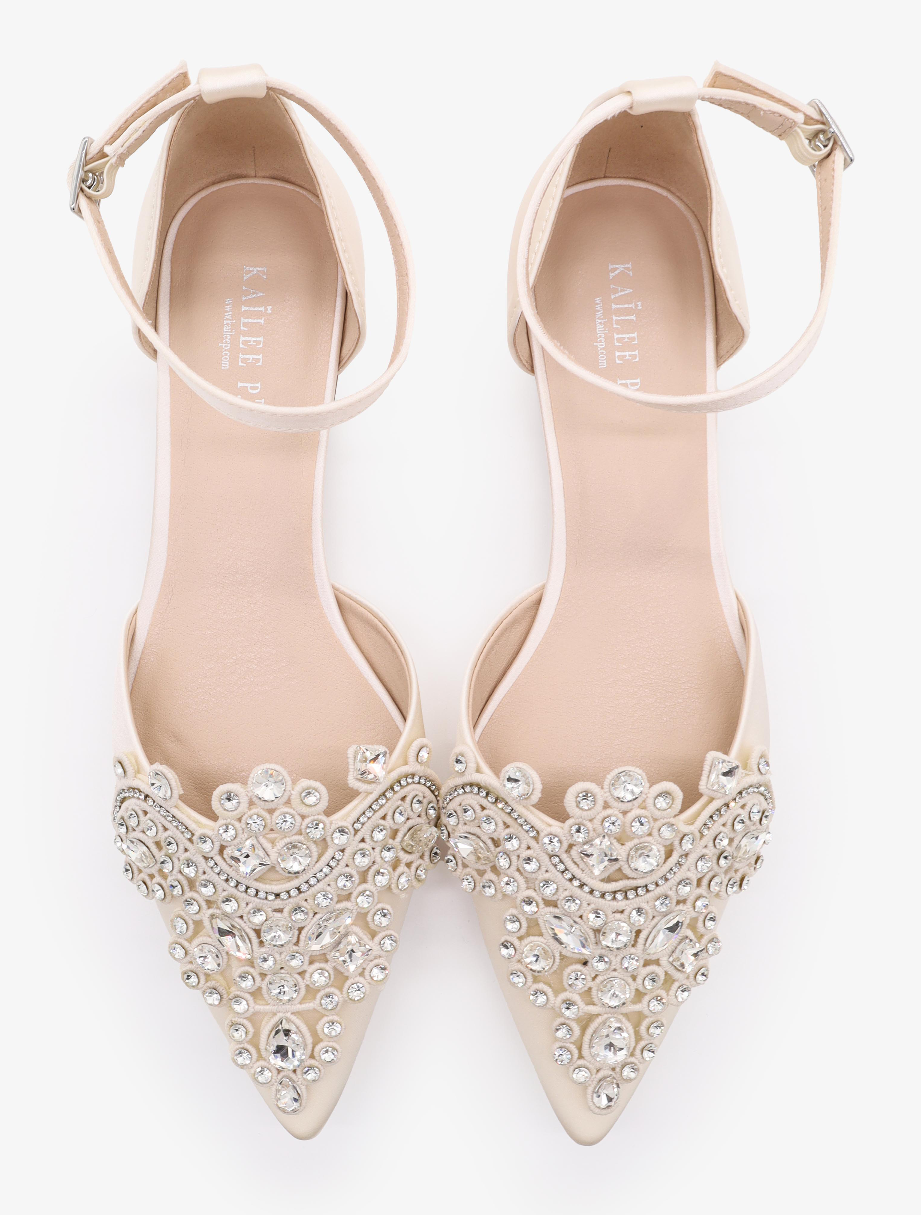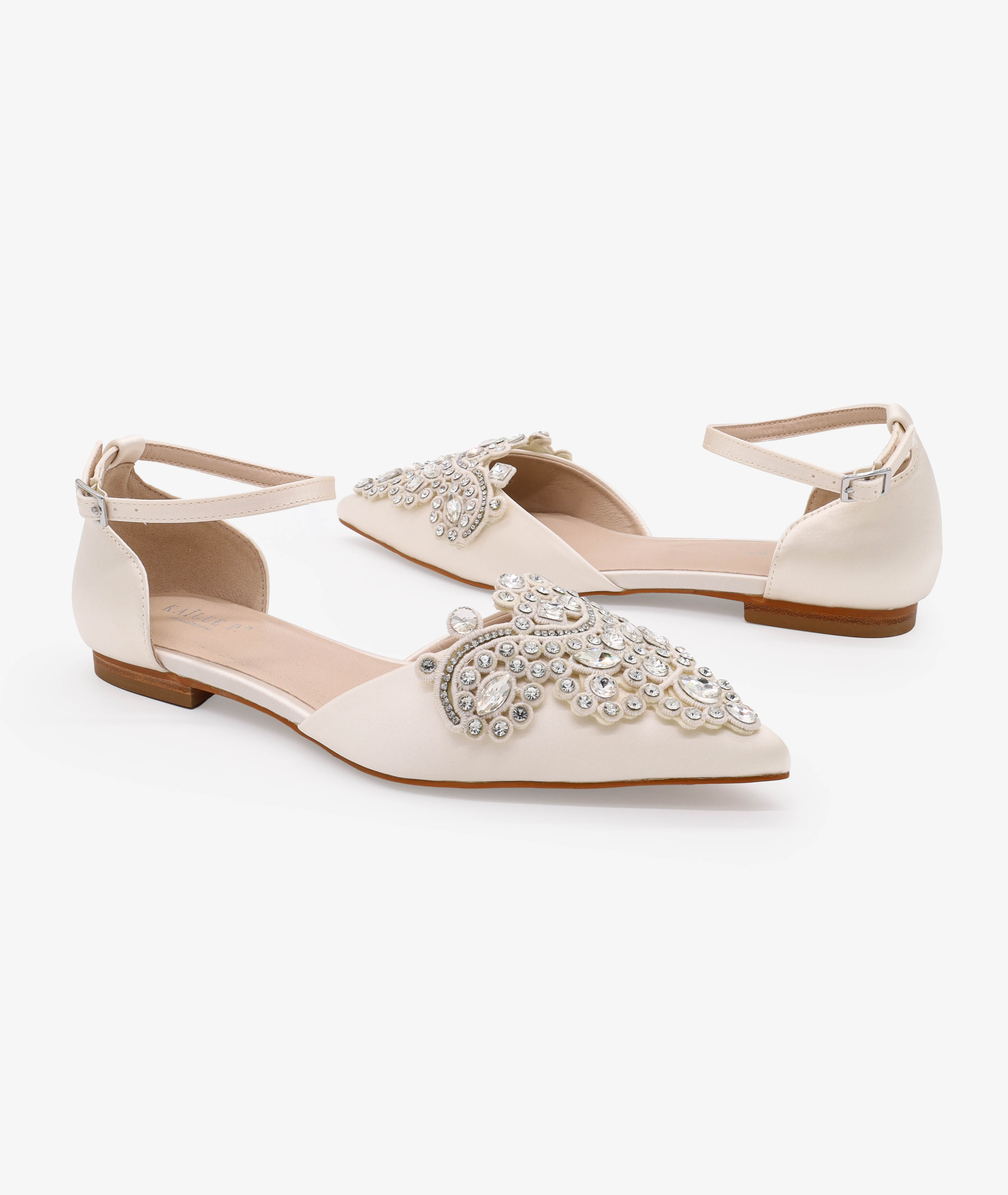 Classic chic satin pointy toe flats topped with sparkly embellished oversized appliqué. Comfort with simplicity perfect for any special events. Perfect for brides, bridesmaids, holiday party, prom night, date night, and any special occasions.