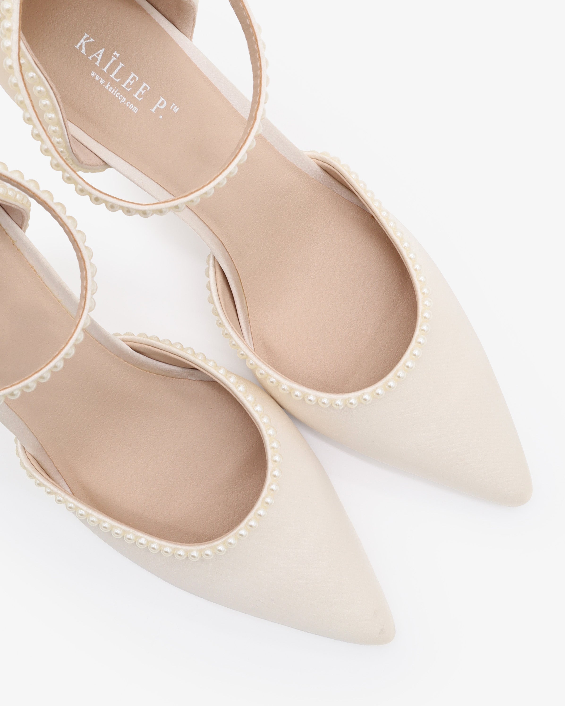 Classic satin pointy toe heels with an added touch for romantic, elegant and feminine look. The prettiest pearl details on this elegant satin heel checks off all the right boxes. The delicate mini pearl beads are placed carefully by hand to create a graceful classic bridal shoe. Perfect for brides, bridal party, bridesmaids, prom, parties, or any special occasion.