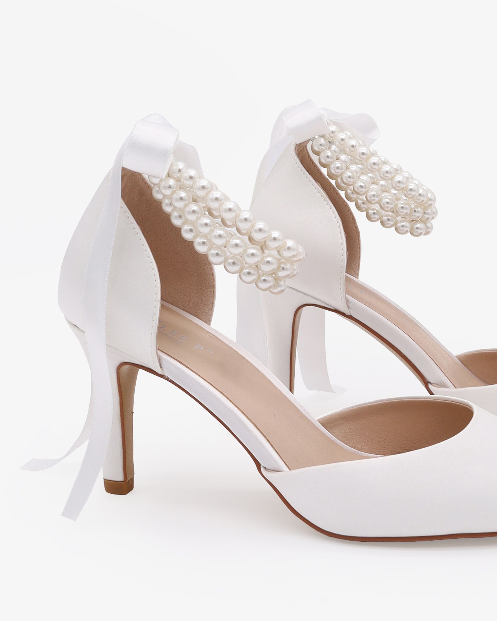 Classic satin pointy toe wedding heels with an added touch of elegance. Featuring our trinity pearl strap, which includes three rows of pearls around the ankle. Tie silky ribbon bow at the back for a secure fitting. Perfect for brides, bridal party, bridesmaids, prom, parties, or any special occasion.