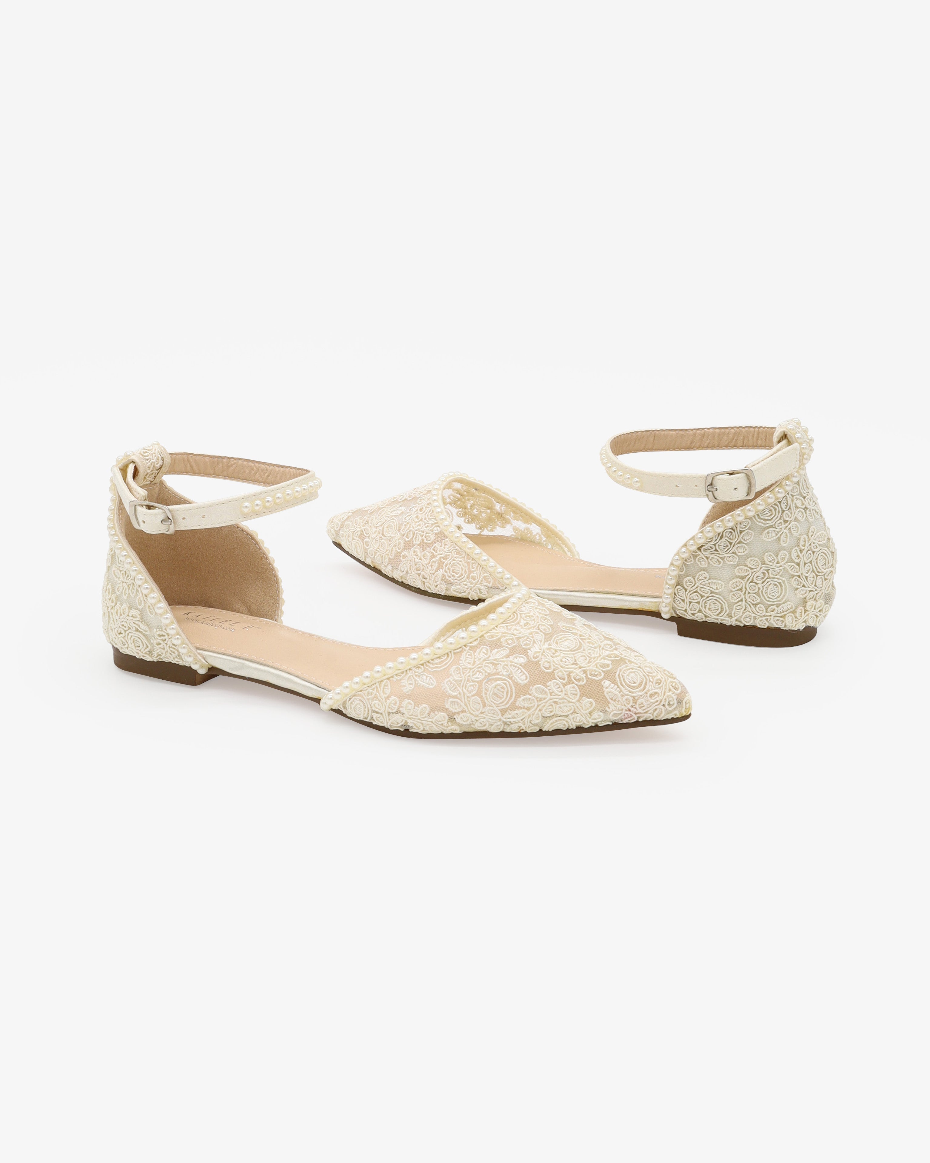 Crochet lace pointy toe flats for comfortable wear throughout your special day and perfect for wedding party. The delicate mini pearl beads are placed carefully by hand made to order to create a graceful classic bridal shoe. Perfect for bridal shoes, bridesmaids, prom shoes, party shoes, holiday shoes, and any special occasions.