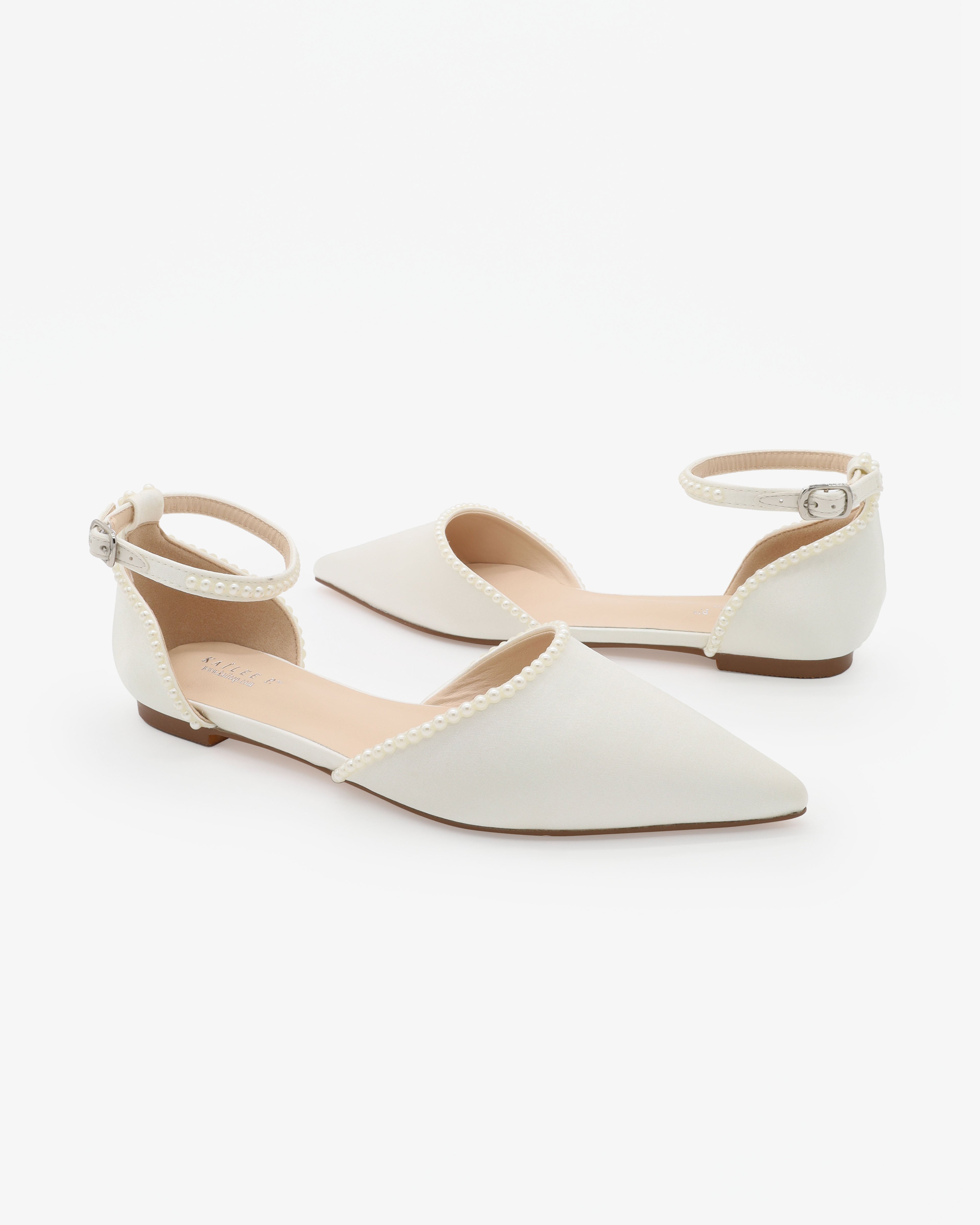 Satin pointy toe flats topped with mini pearls for a touch of classy glam. Comfortable throughout your special day and perfect for brides, bridal party, bridesmaids, prom, parties, or any special occasion.