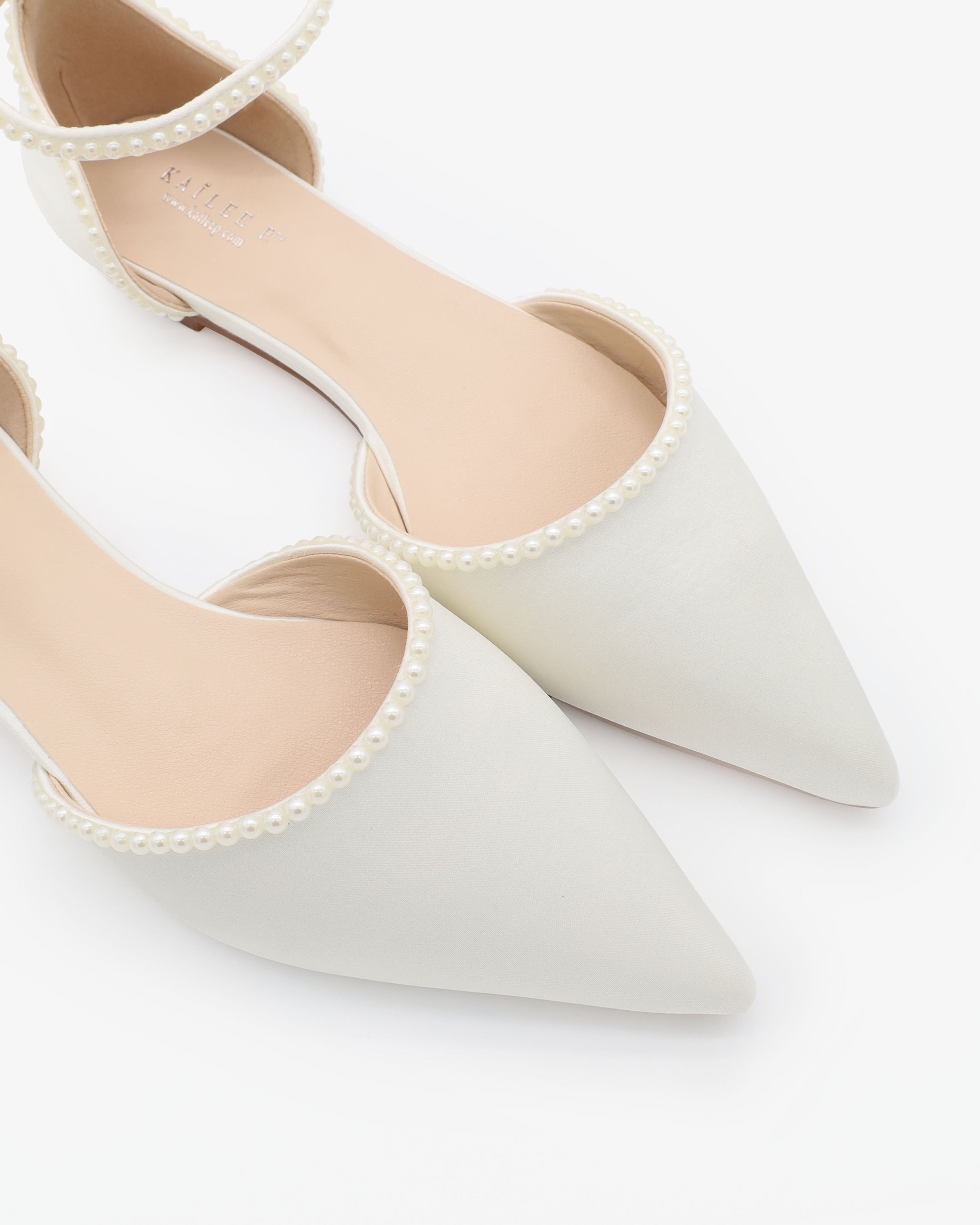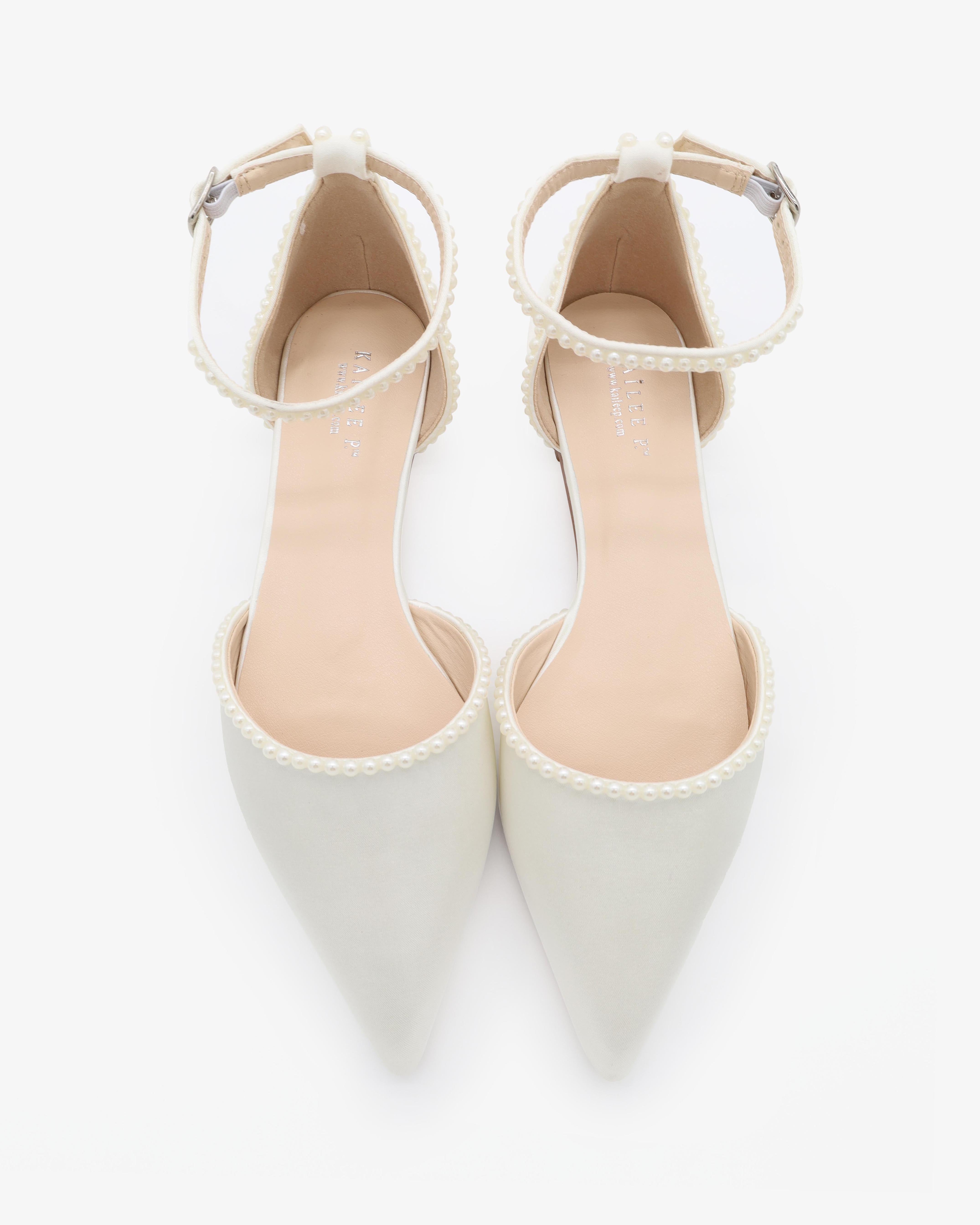 Satin Pointy Toe Flats with Mini Pearls and Ankle Strap