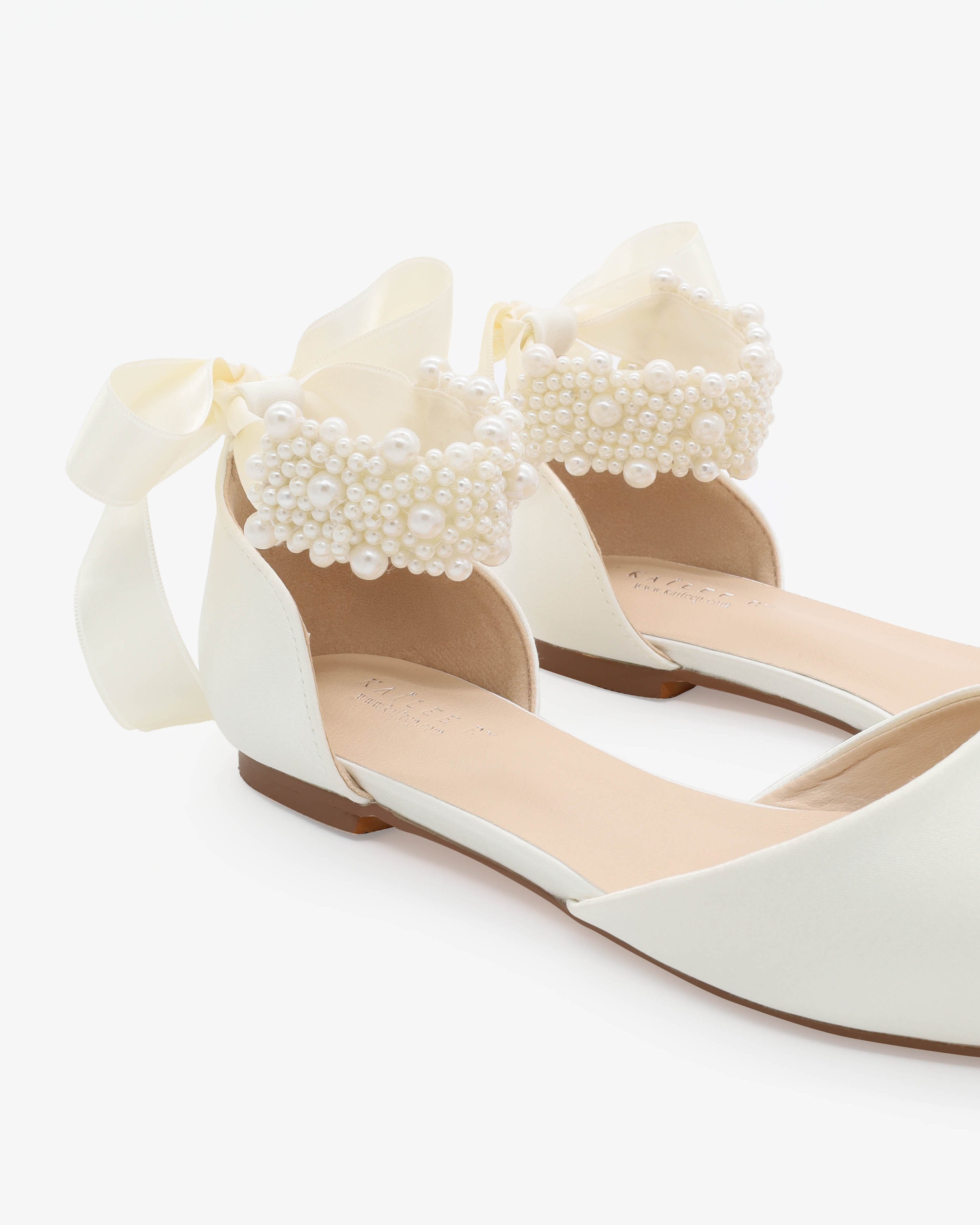 Shiny and glamorous satin flats with all over pearls ribbon strap. Elegance and feminine inspired wear for your special day. The delicate pearl beads are placed to create a graceful classic style. Perfect for brides, bridal party, bridesmaids, prom, parties, or any special occasion.