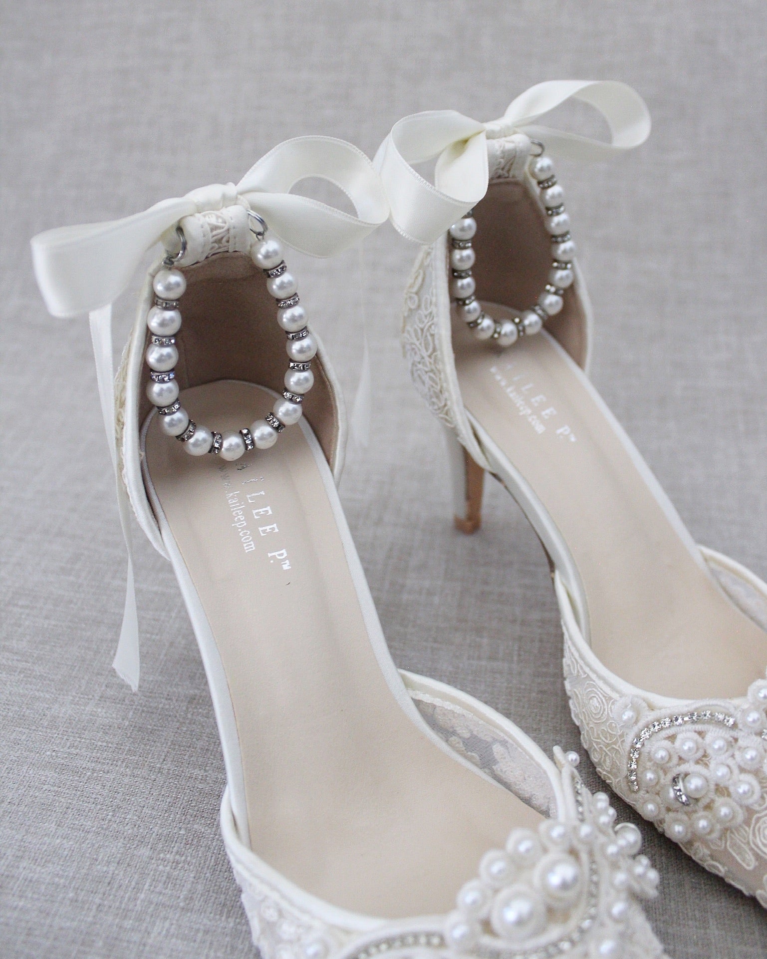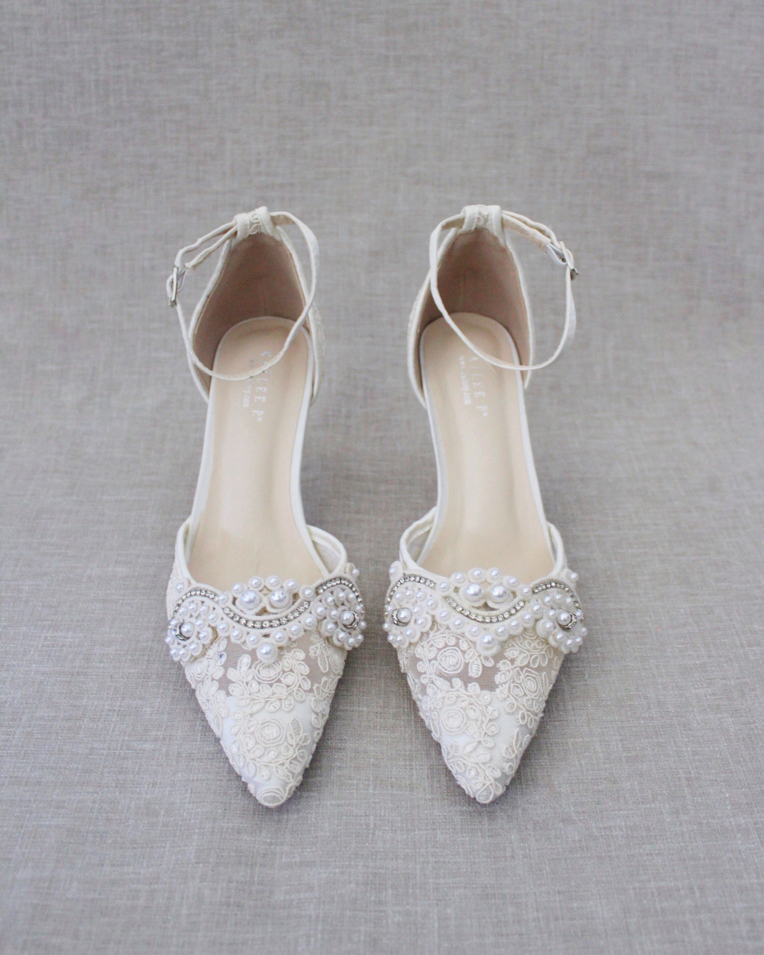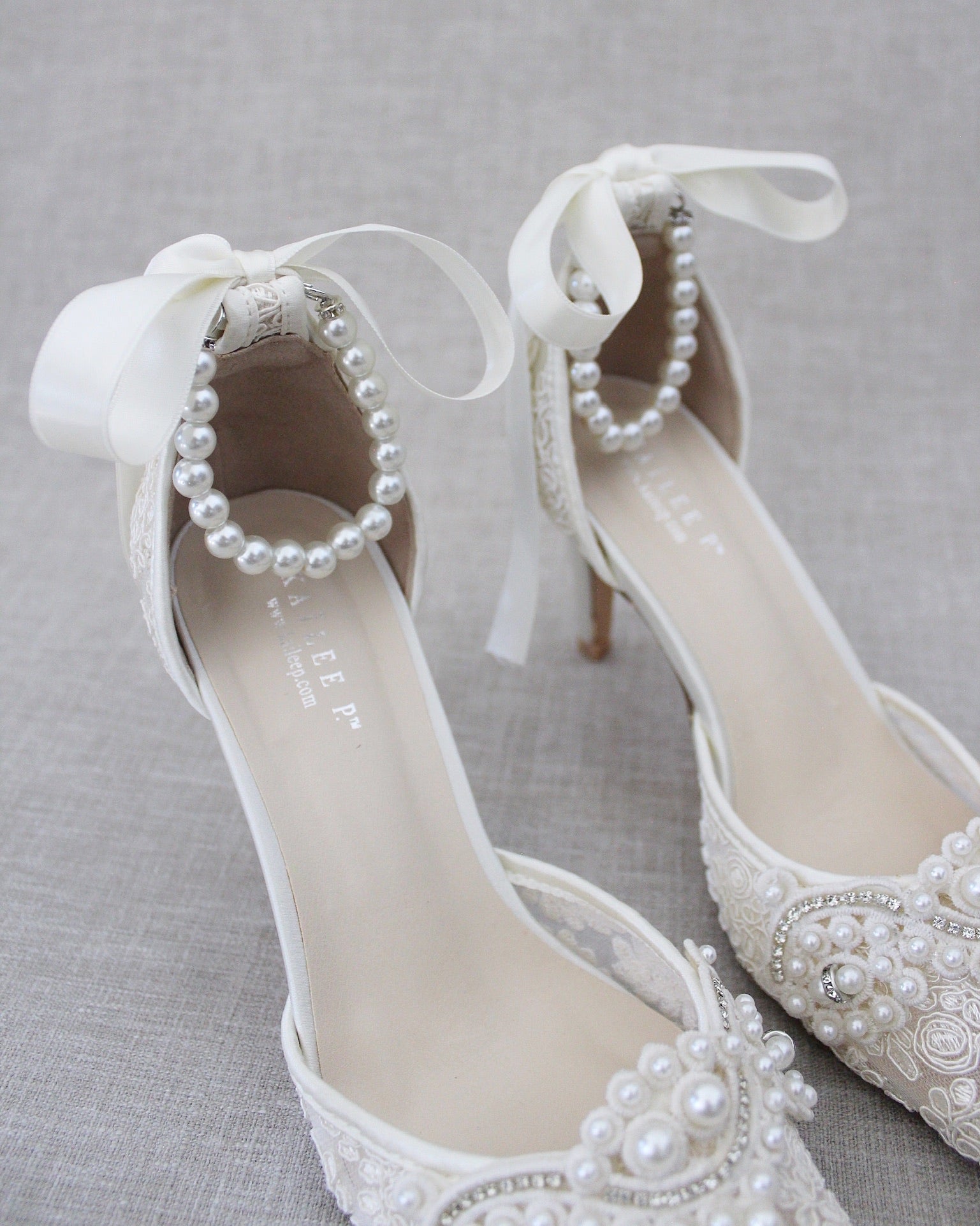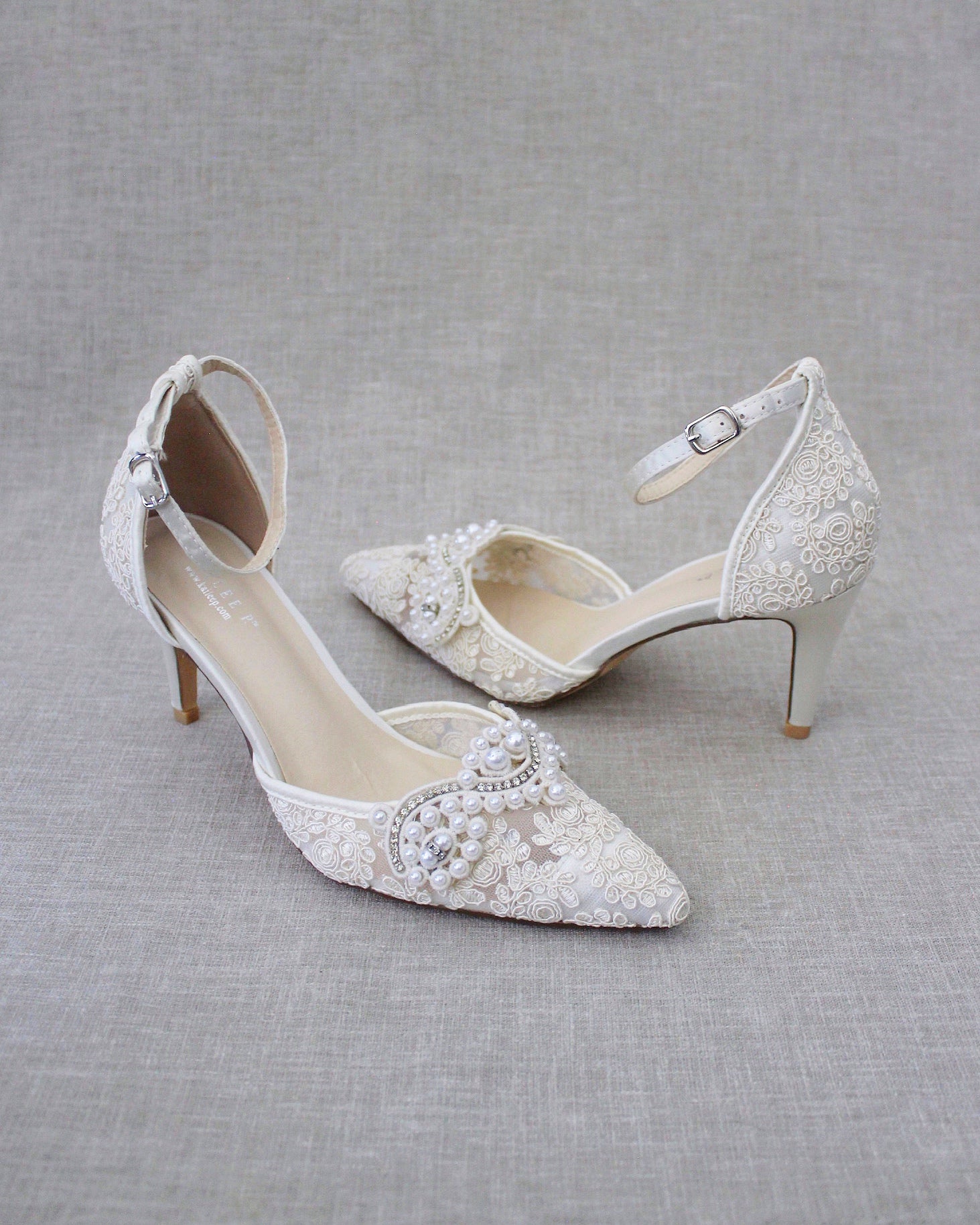 Ivory Crochet Lace Pointy Toe Heels with Small Pearls Applique