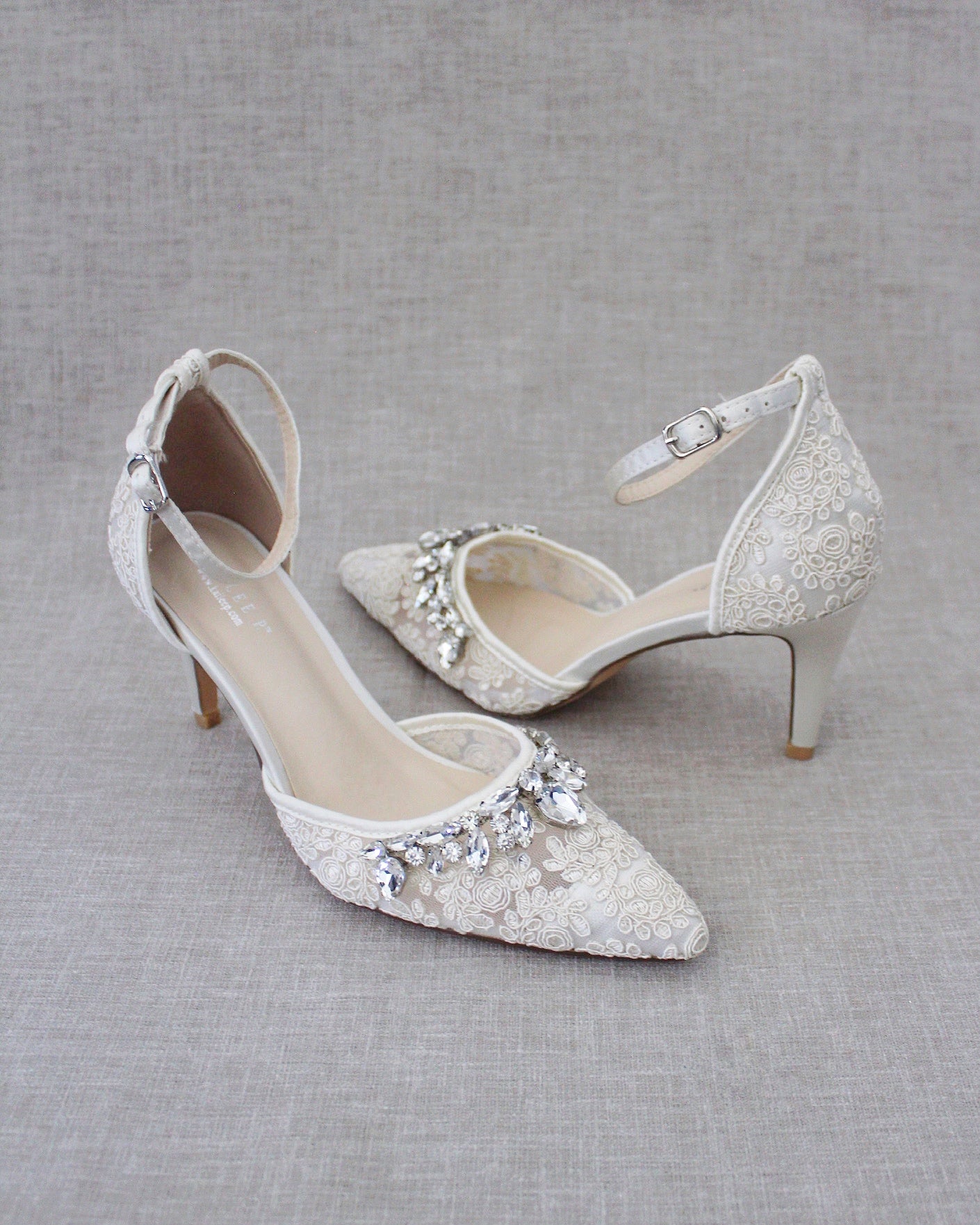 Ivory Crochet Lace Pointy Toe Heels with Teardrop Rhinestones Embellishments