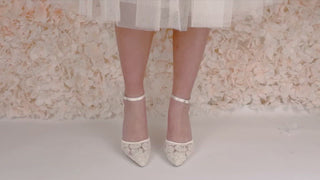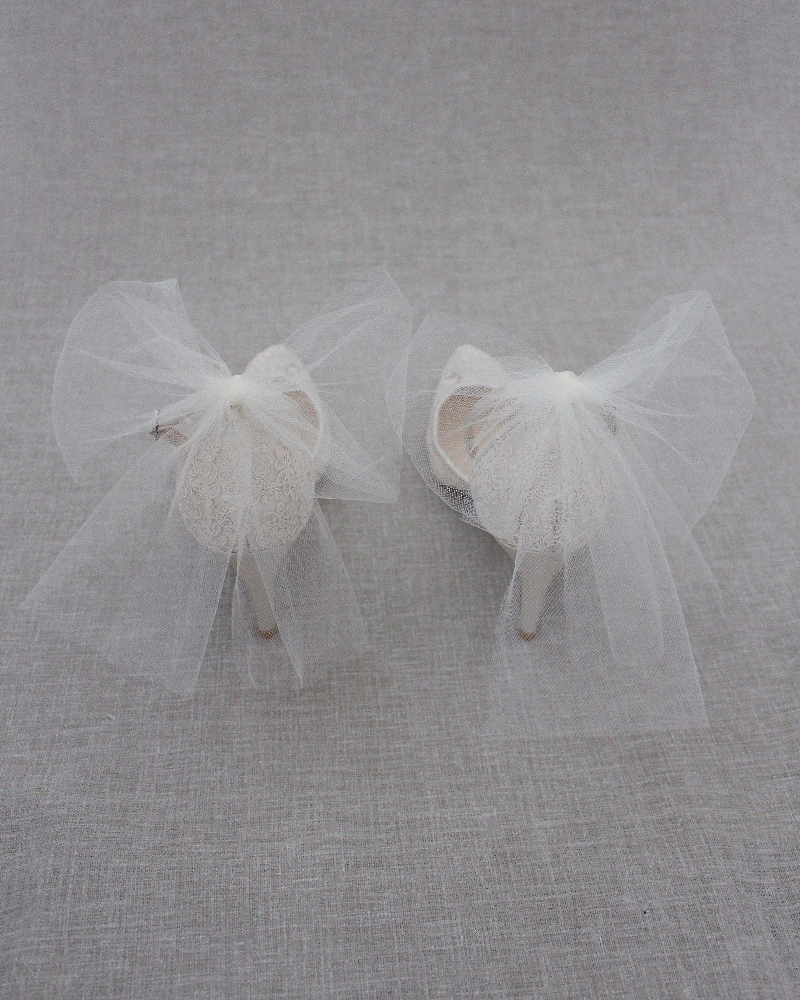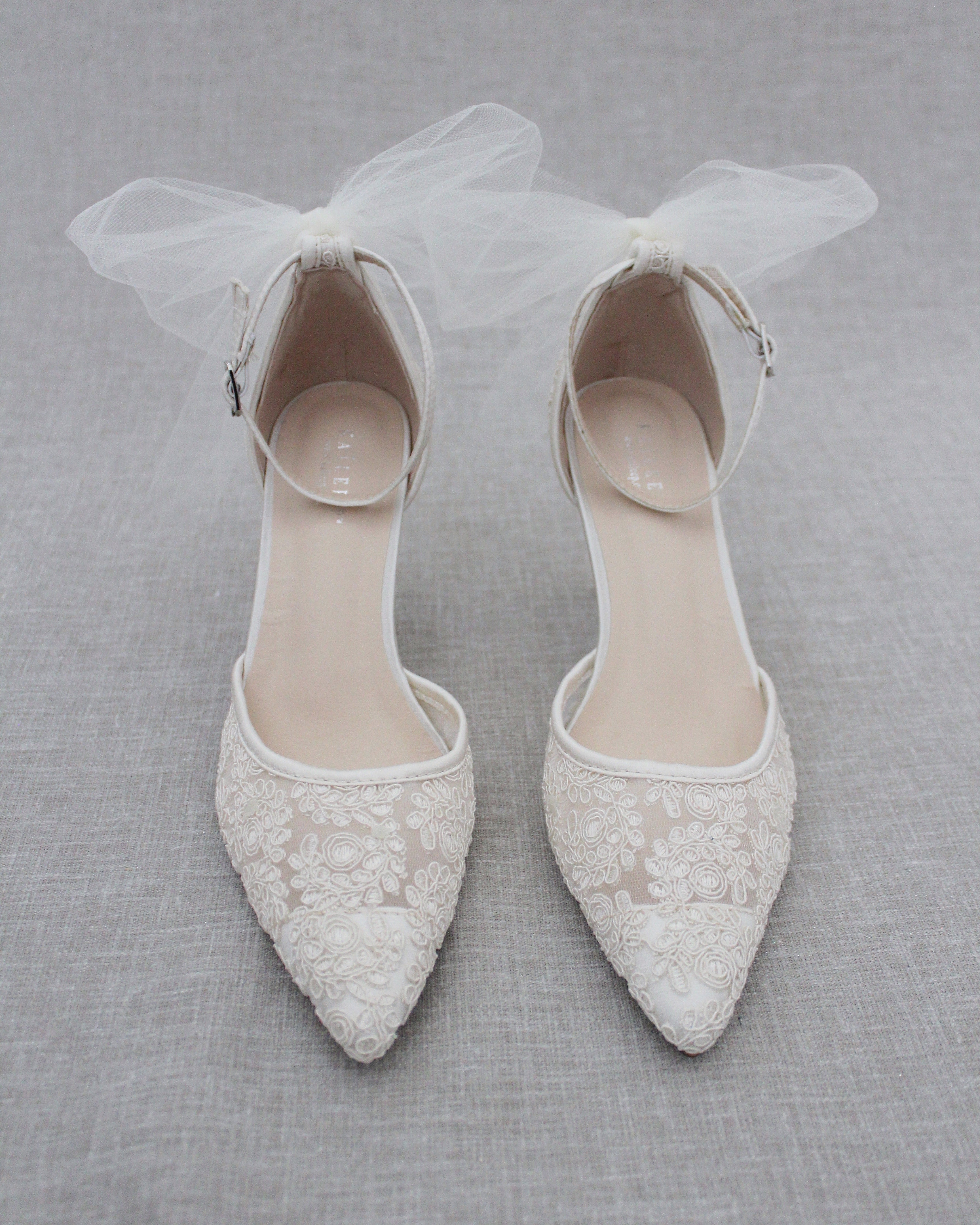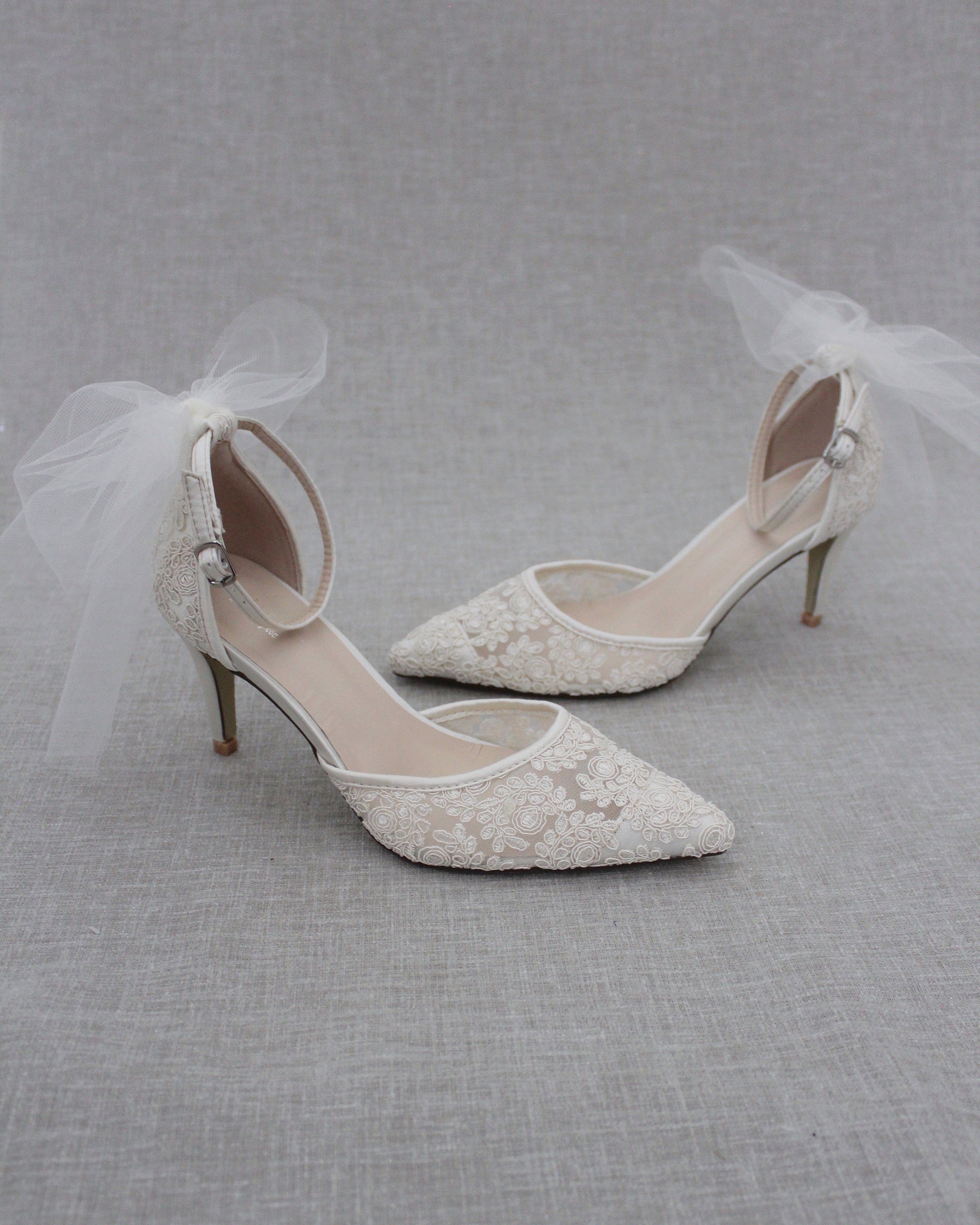 Ivory Crochet Lace Pointy Toe Heels with Tulle Back Bow