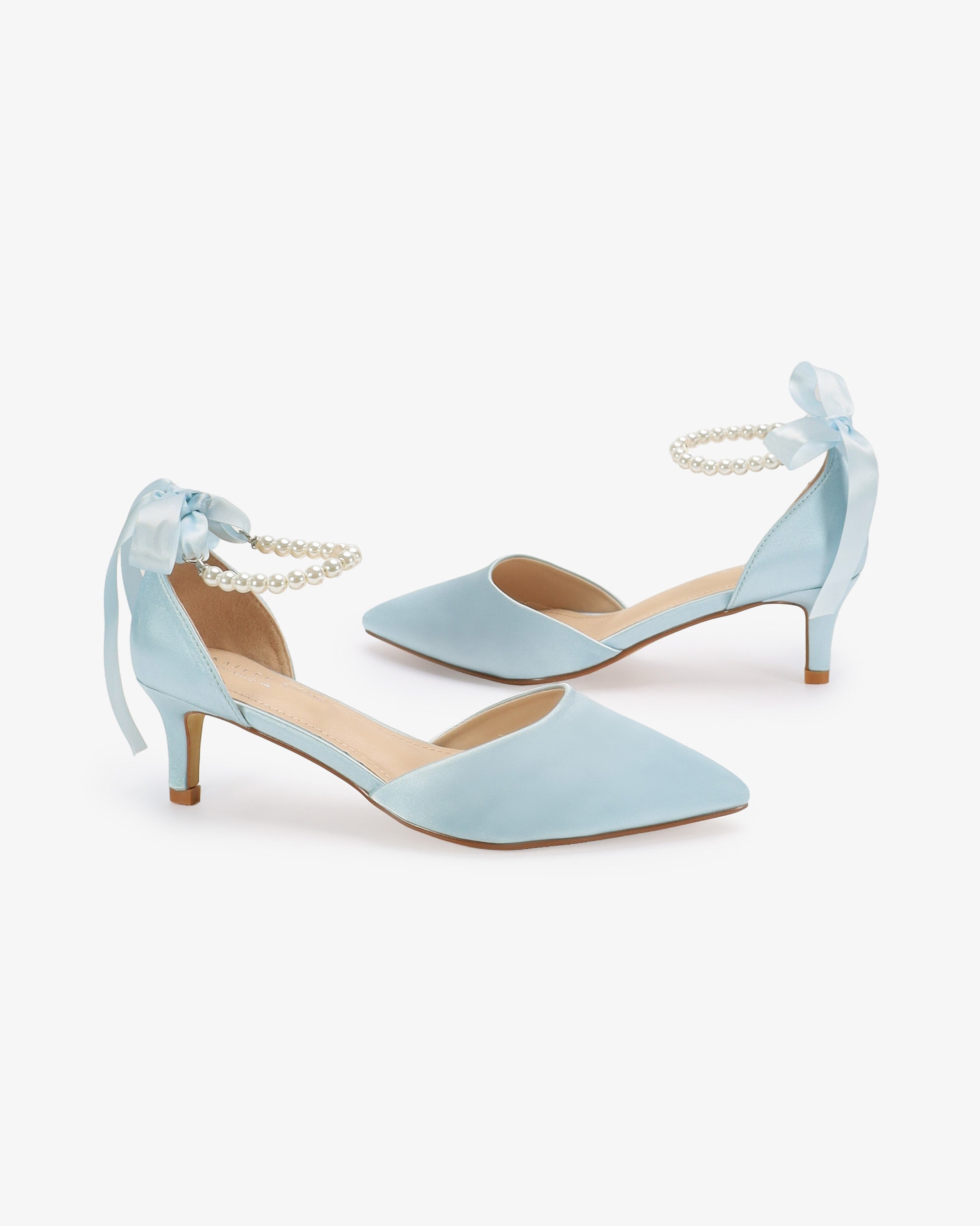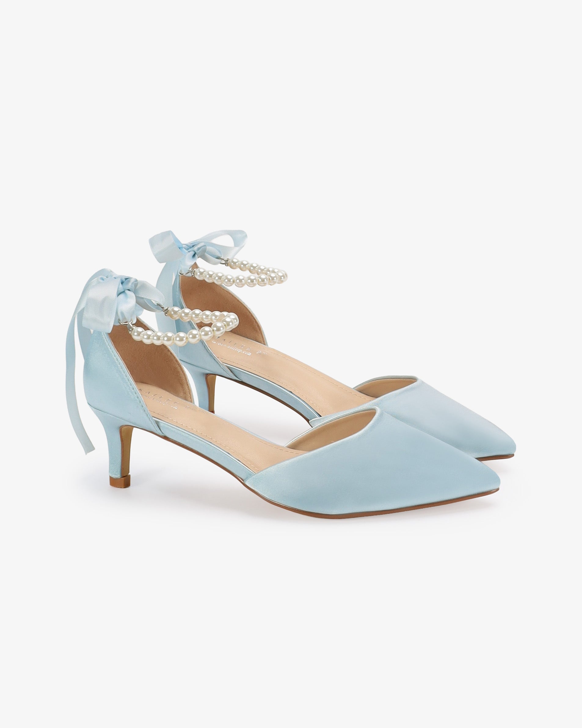 Satin Pointy Toe Kitten Low Heel with All Pearls Strap