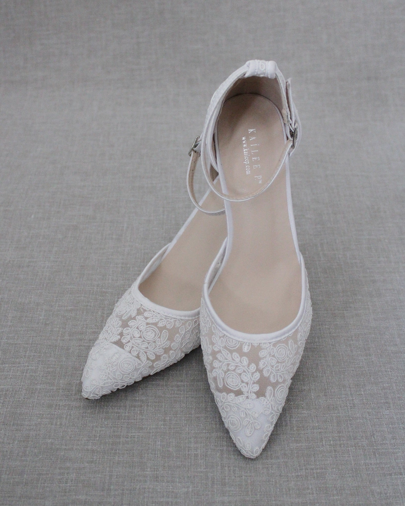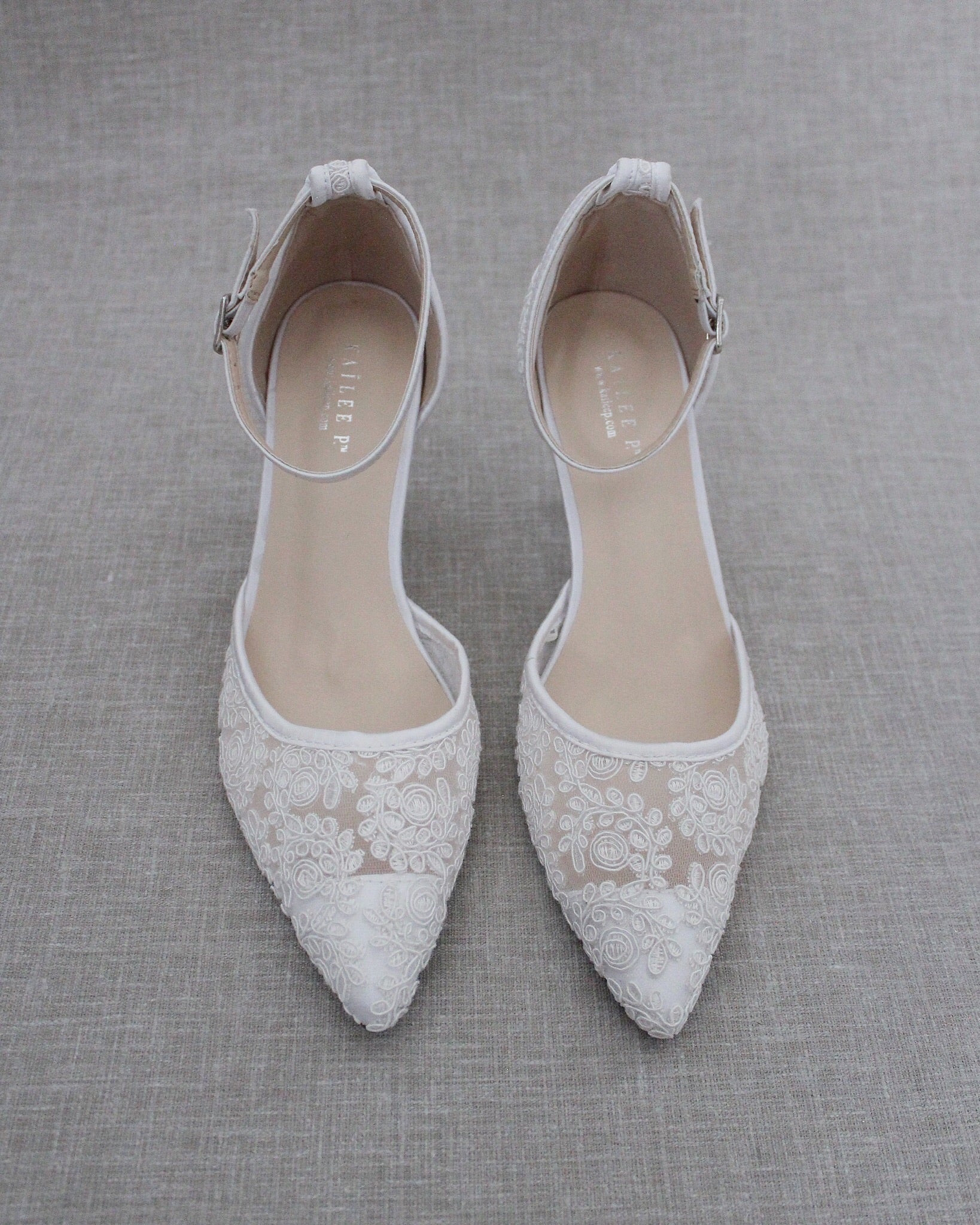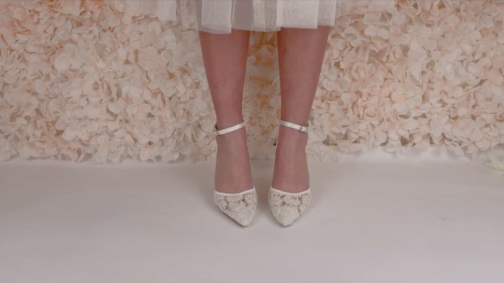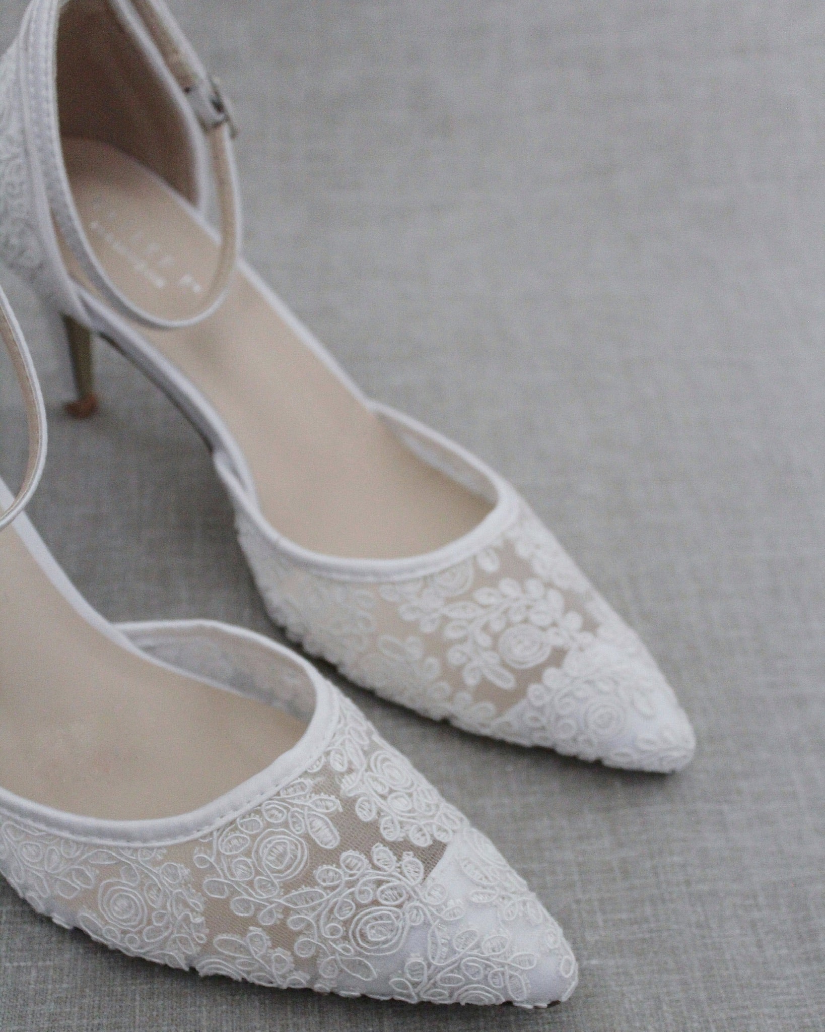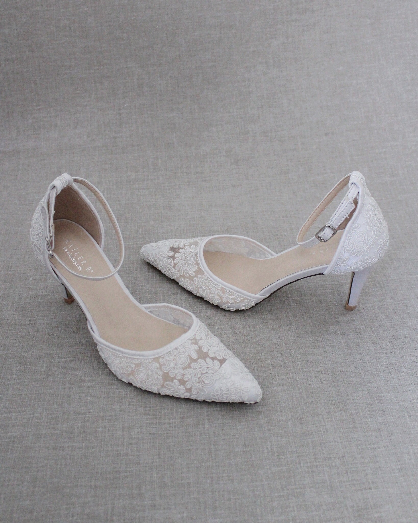 Crochet style pointy toe heels with ankle strap. Elegance and vintage inspired wear for your special day.