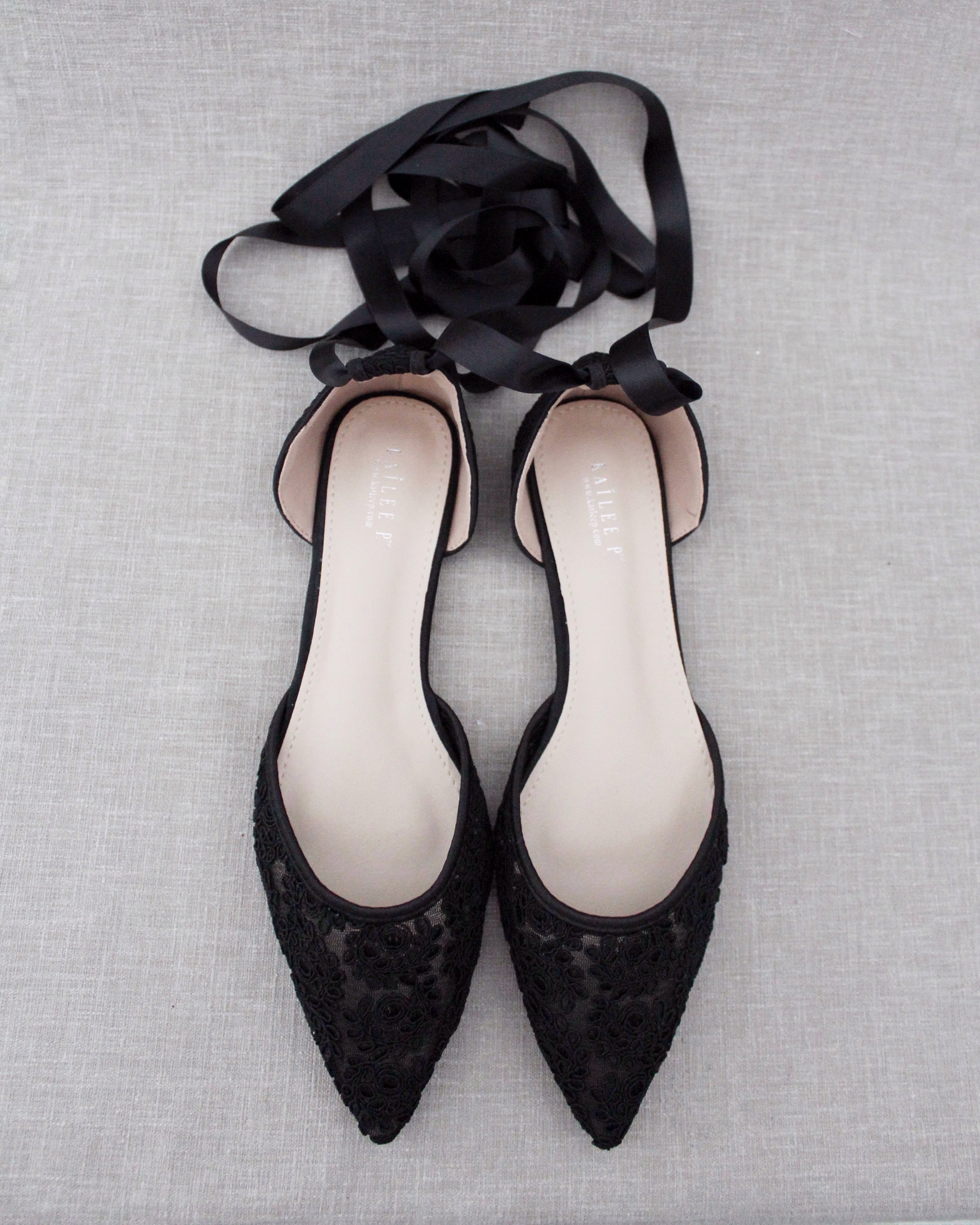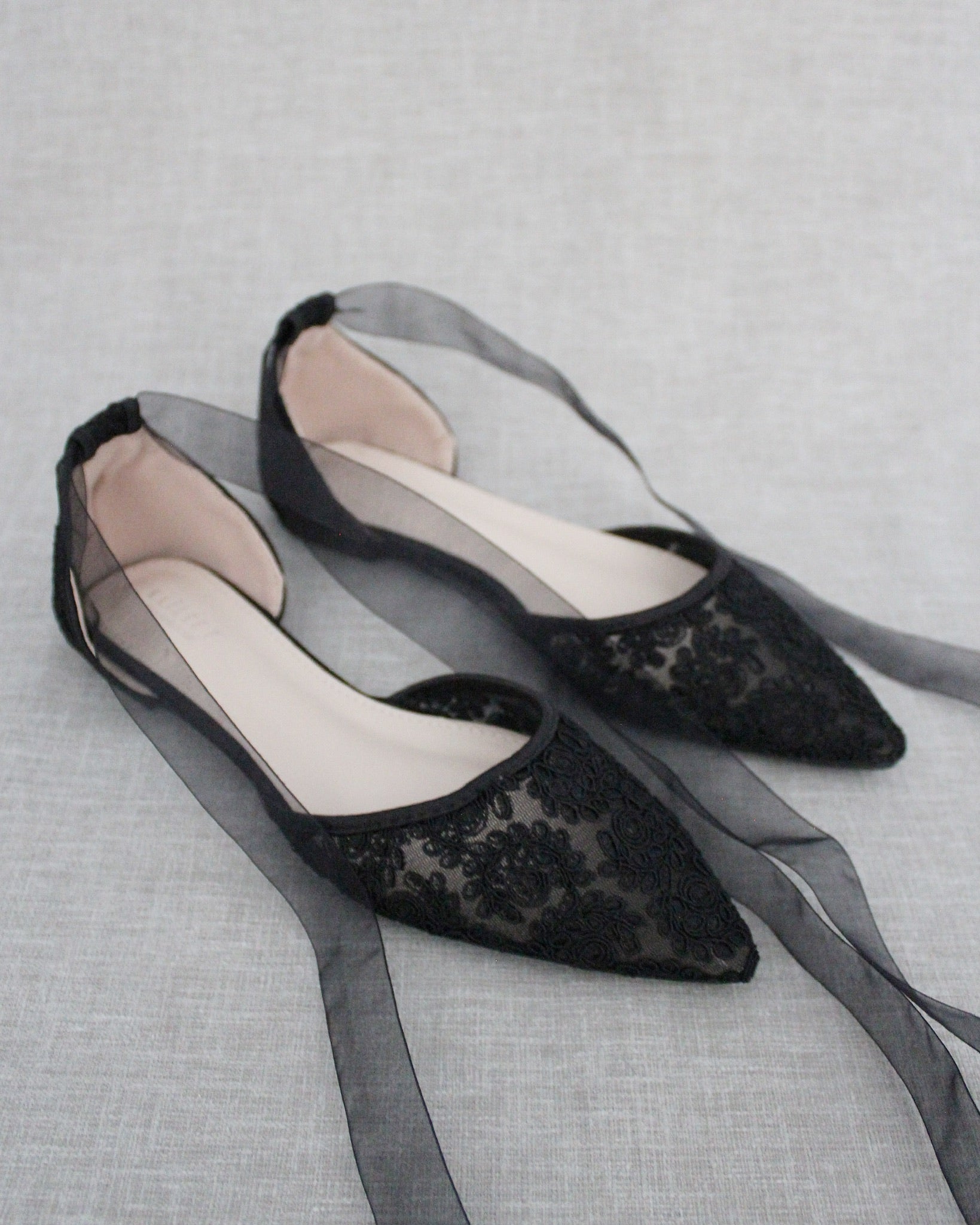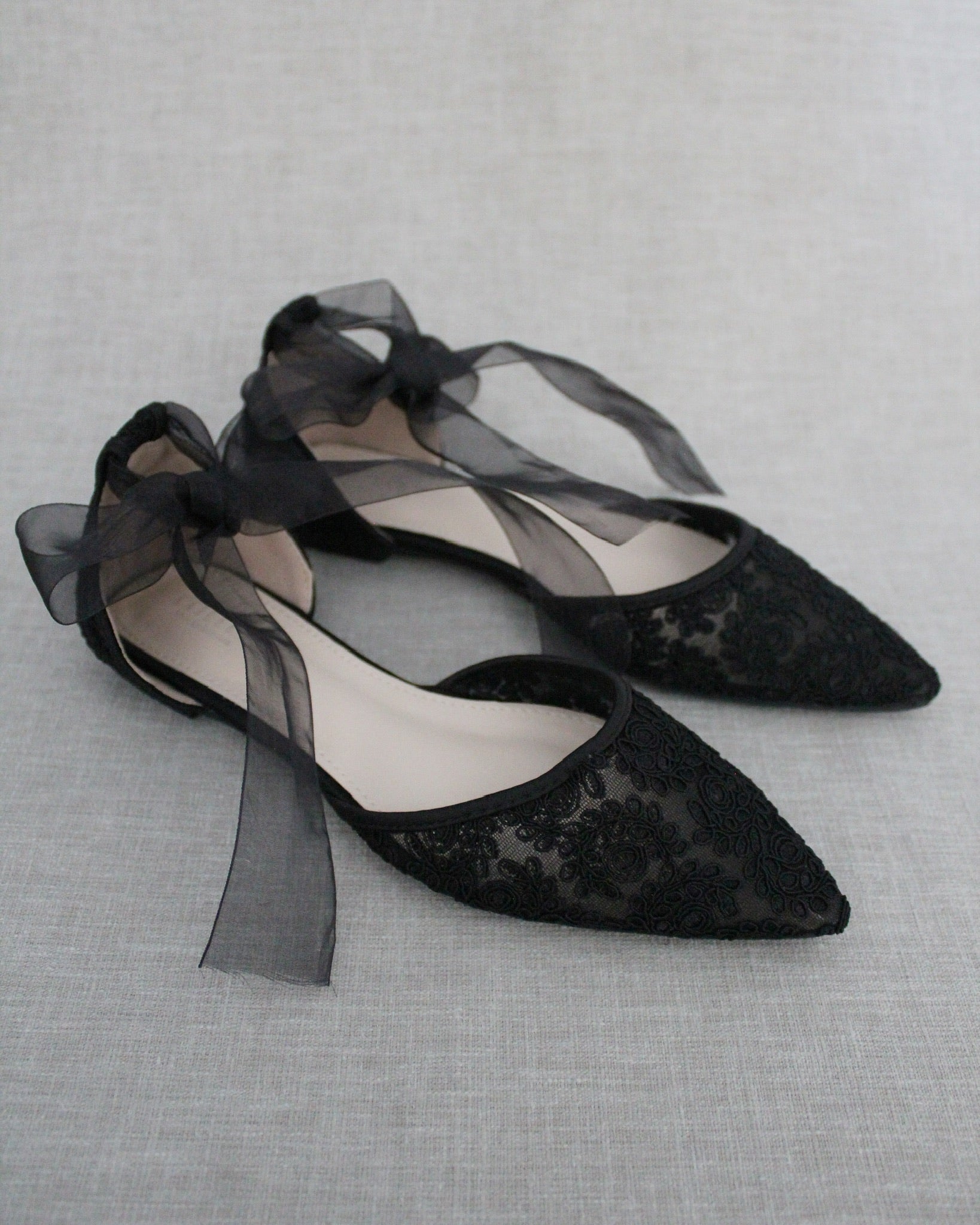 Crochet lace pointy toe flats for comfortable wear throughout your special day and perfect for wedding party. We've added satin or sheer organza lace up ribbon to make this a ballerina shoe.