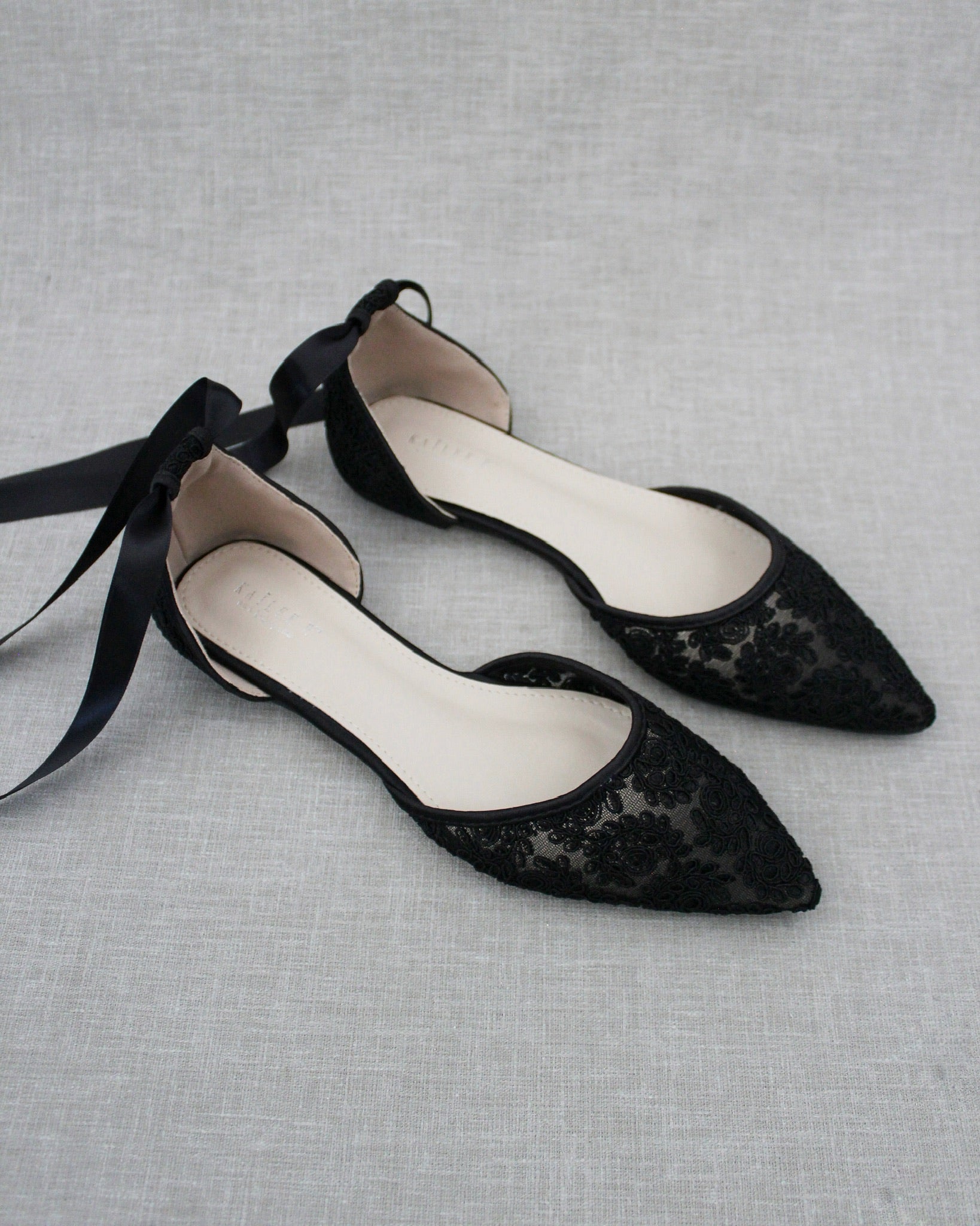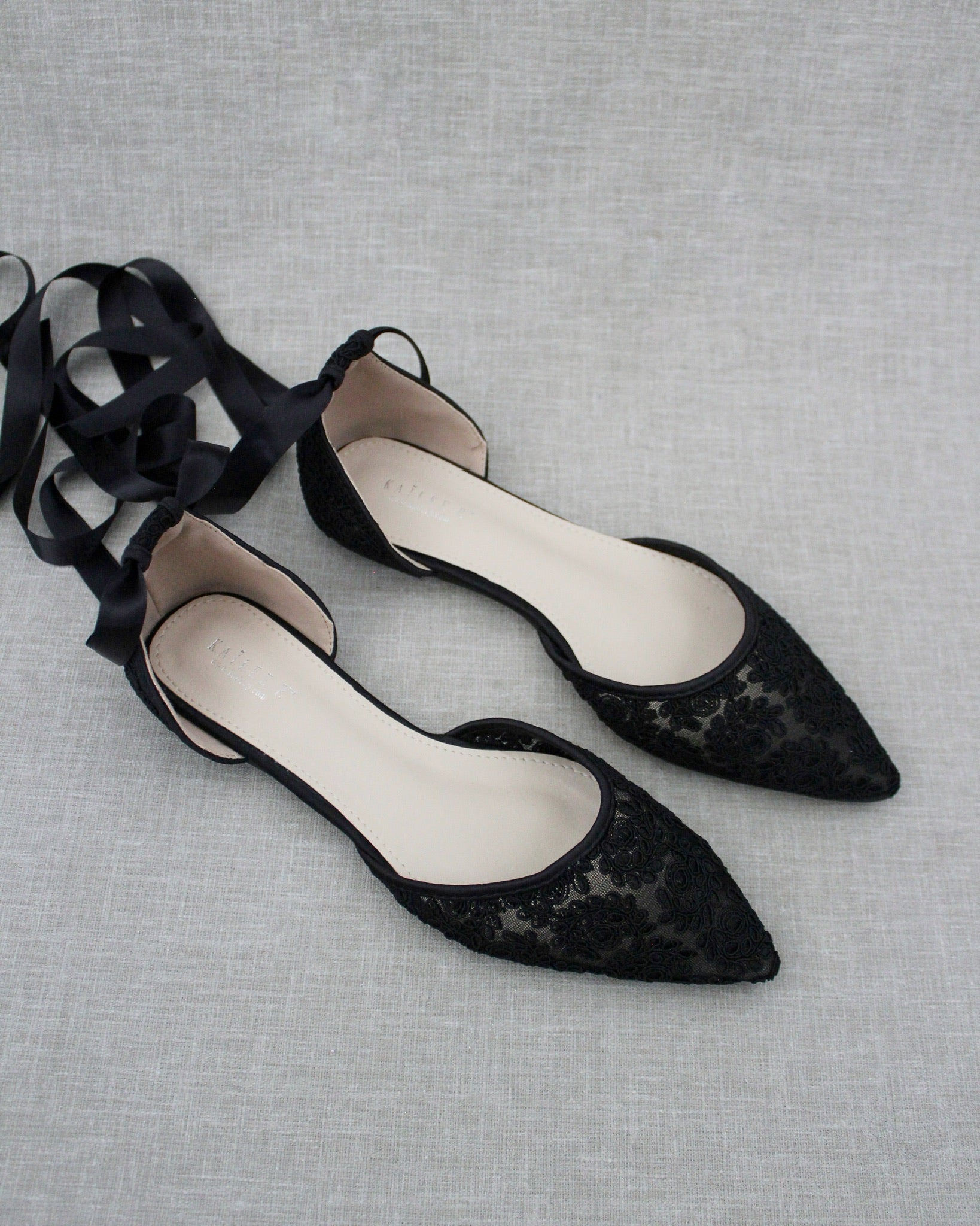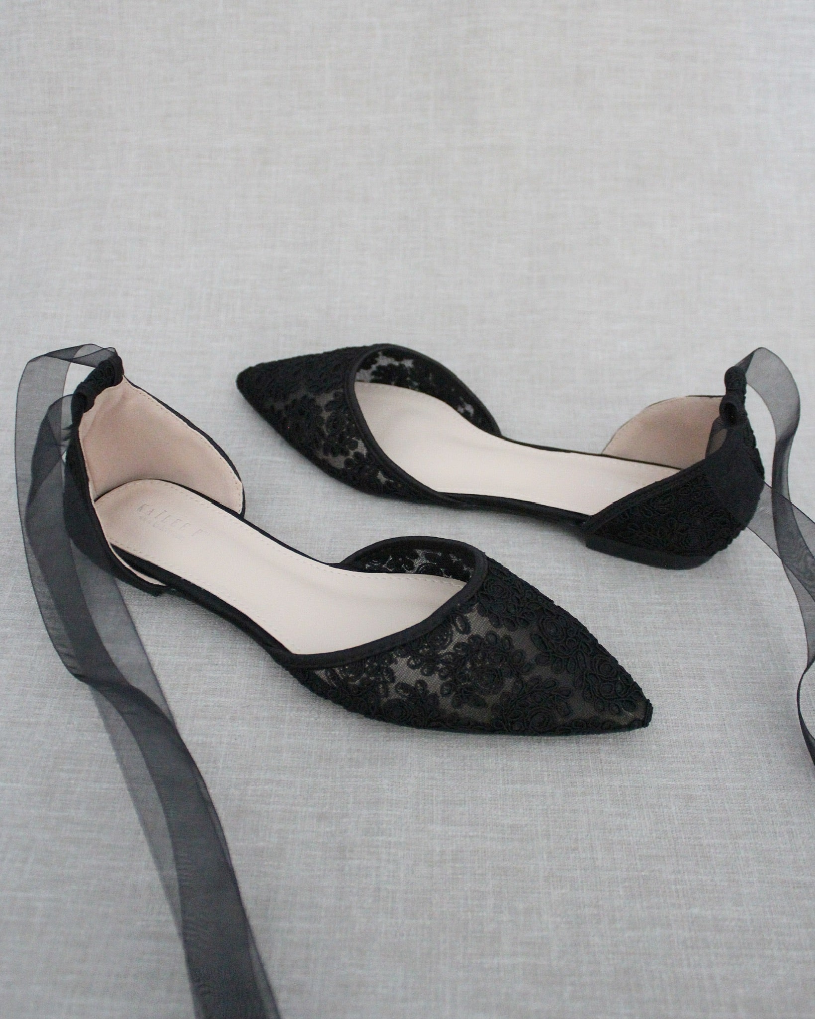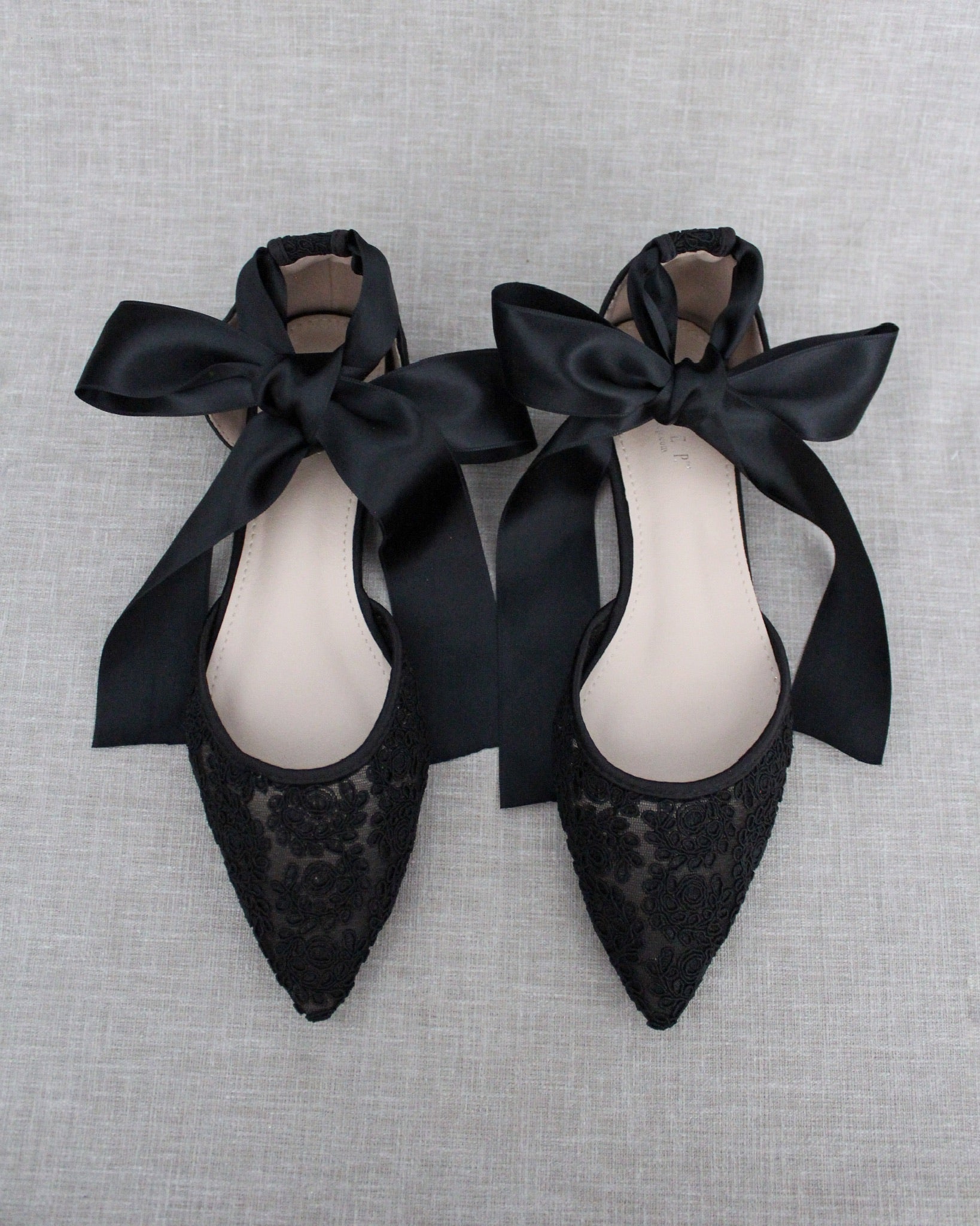 Crochet lace pointy toe flats for comfortable wear throughout your special day and perfect for wedding party. We've added satin or sheer organza lace up ribbon to make this a ballerina shoe.