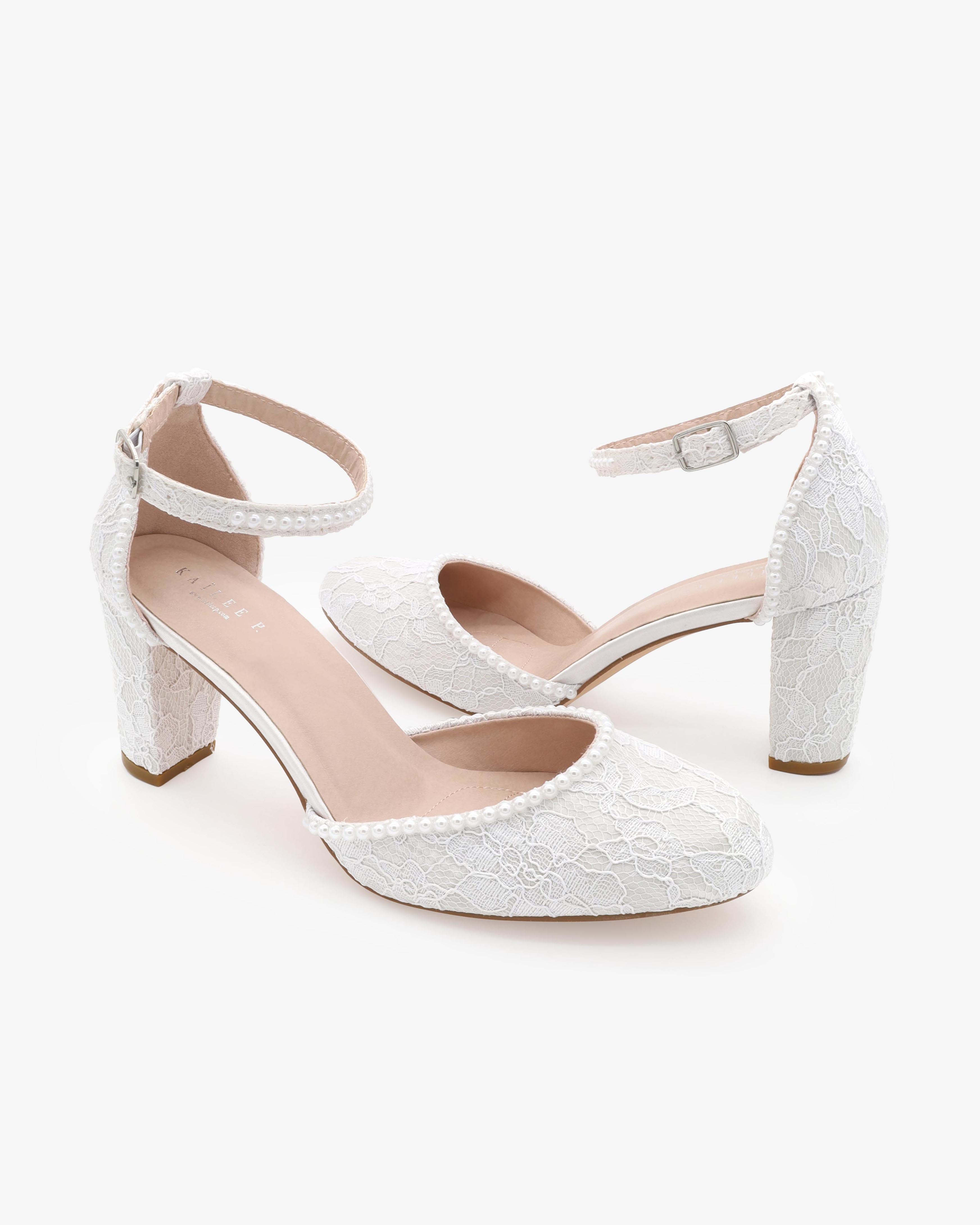 An all-time classic and elegant style with simplicity of lace heels and removable ankle strap with added mini pearls. Perfect for brides, bridesmaids, prom night, date night, holiday party, and any special occasions. The delicate mini pearl beads are placed carefully by hand made to order to create a graceful classic bridal shoe.