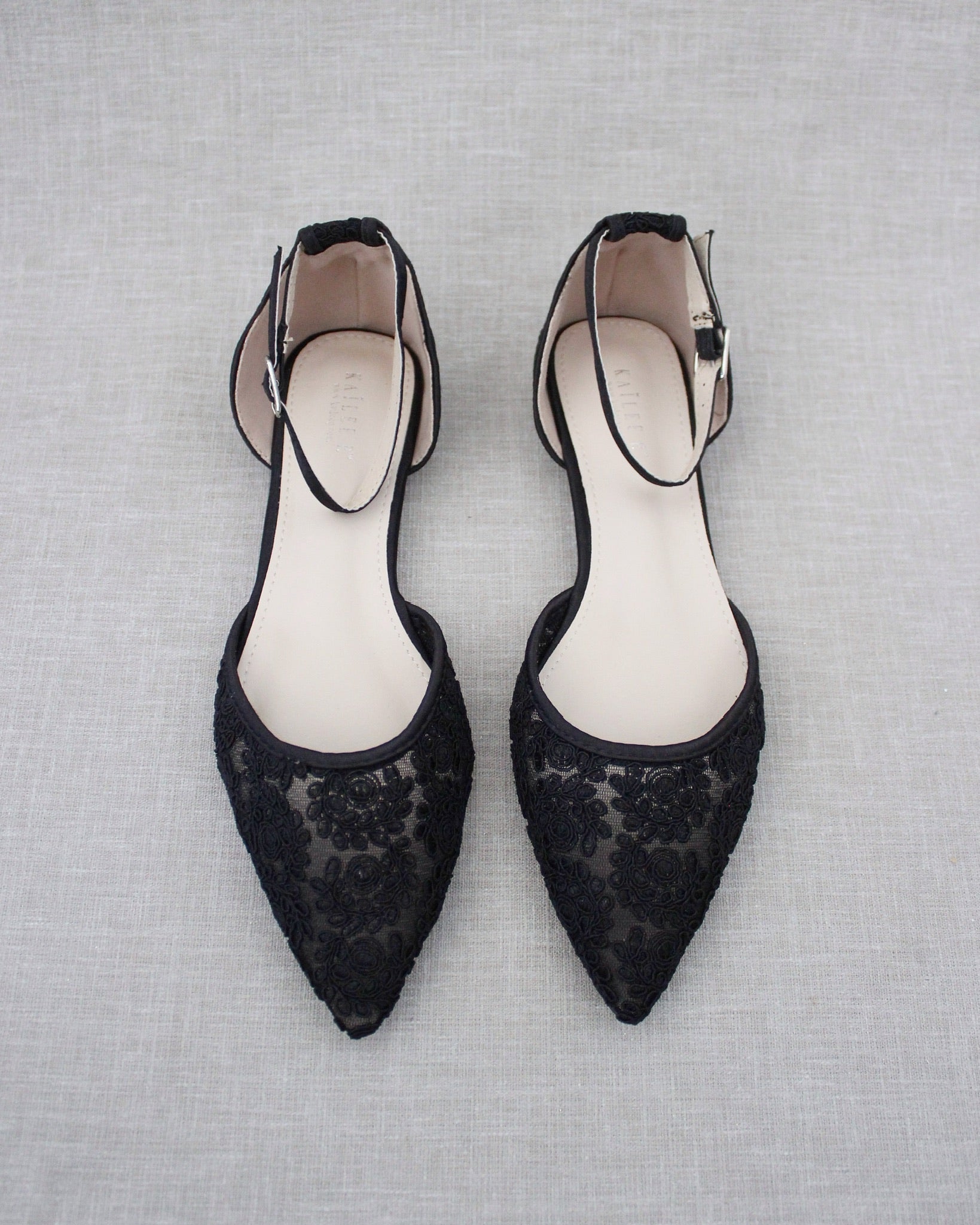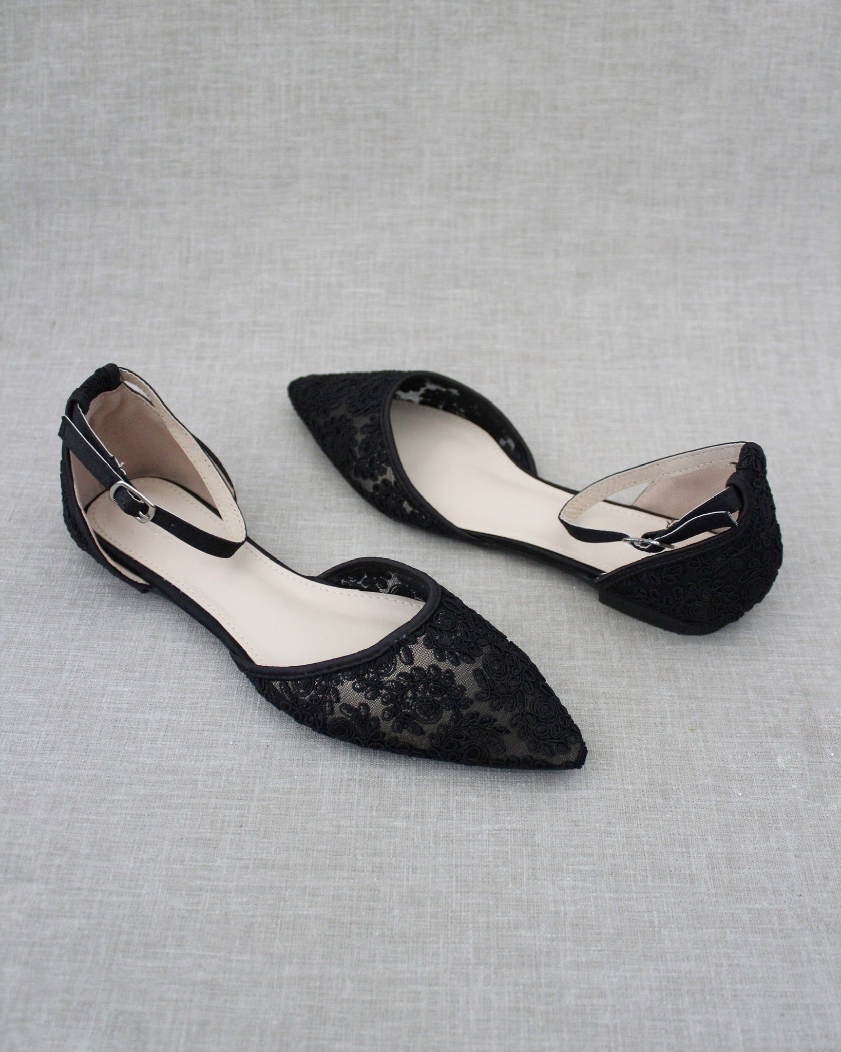 Crochet Lace Pointy Toe Flats with Ankle Strap