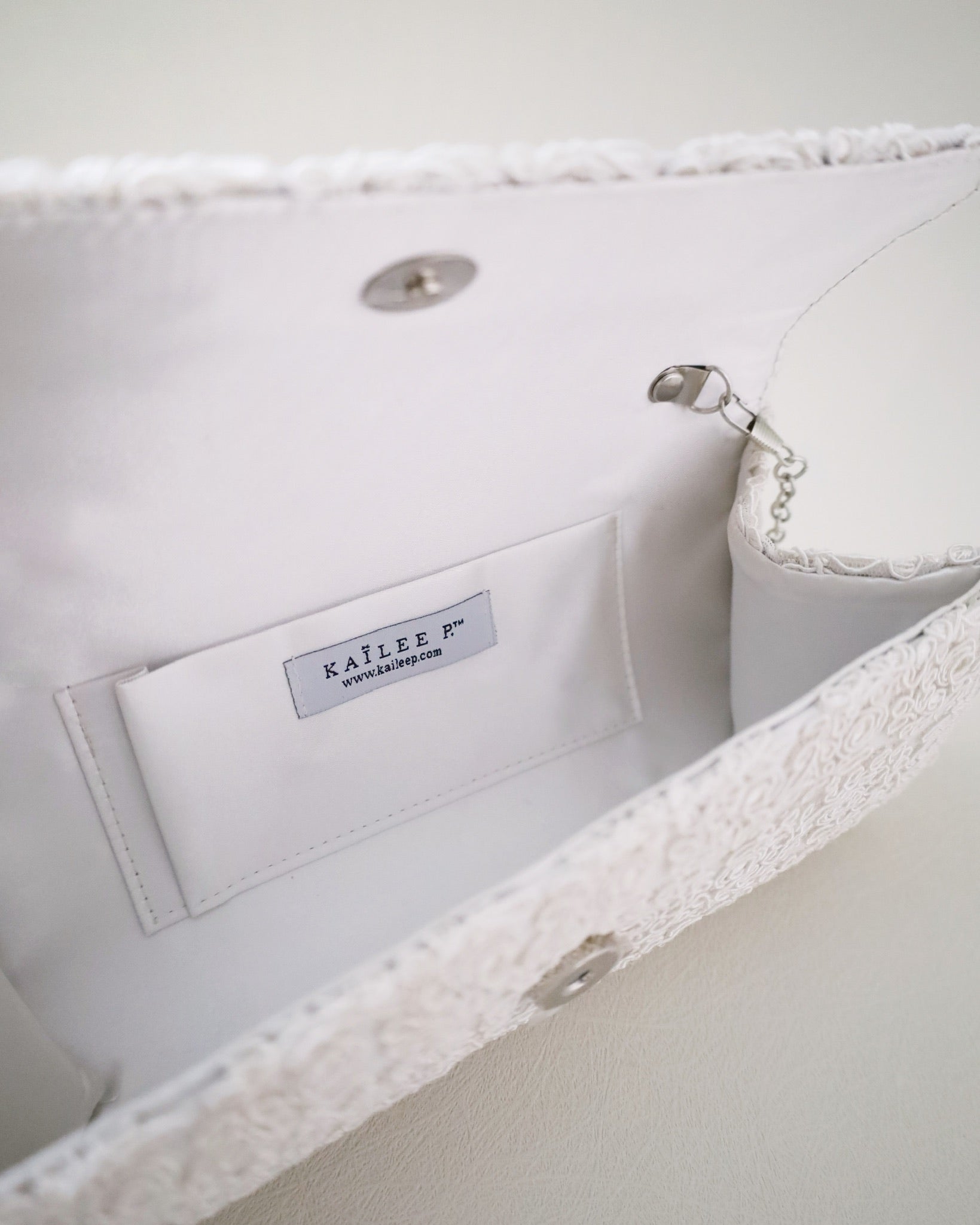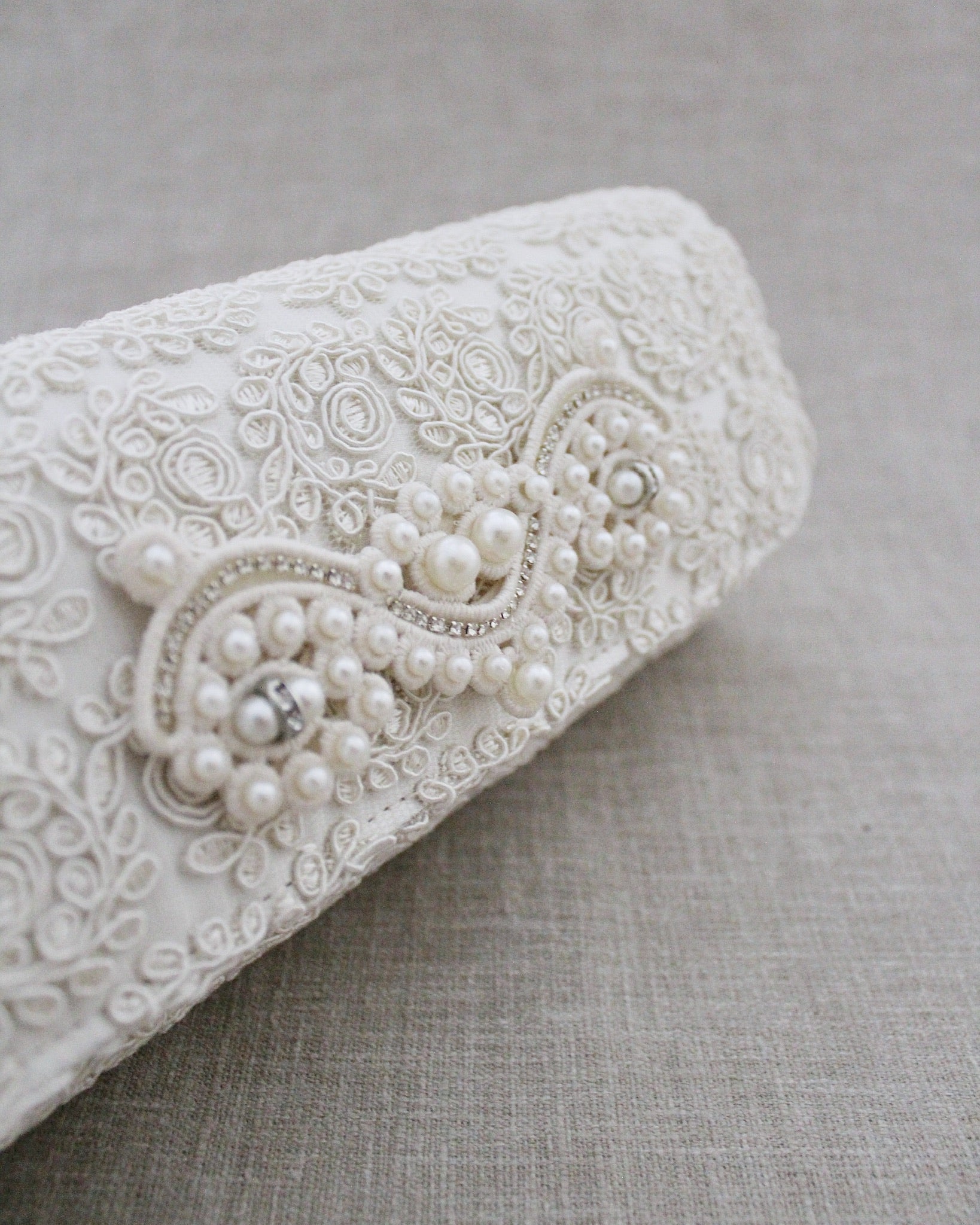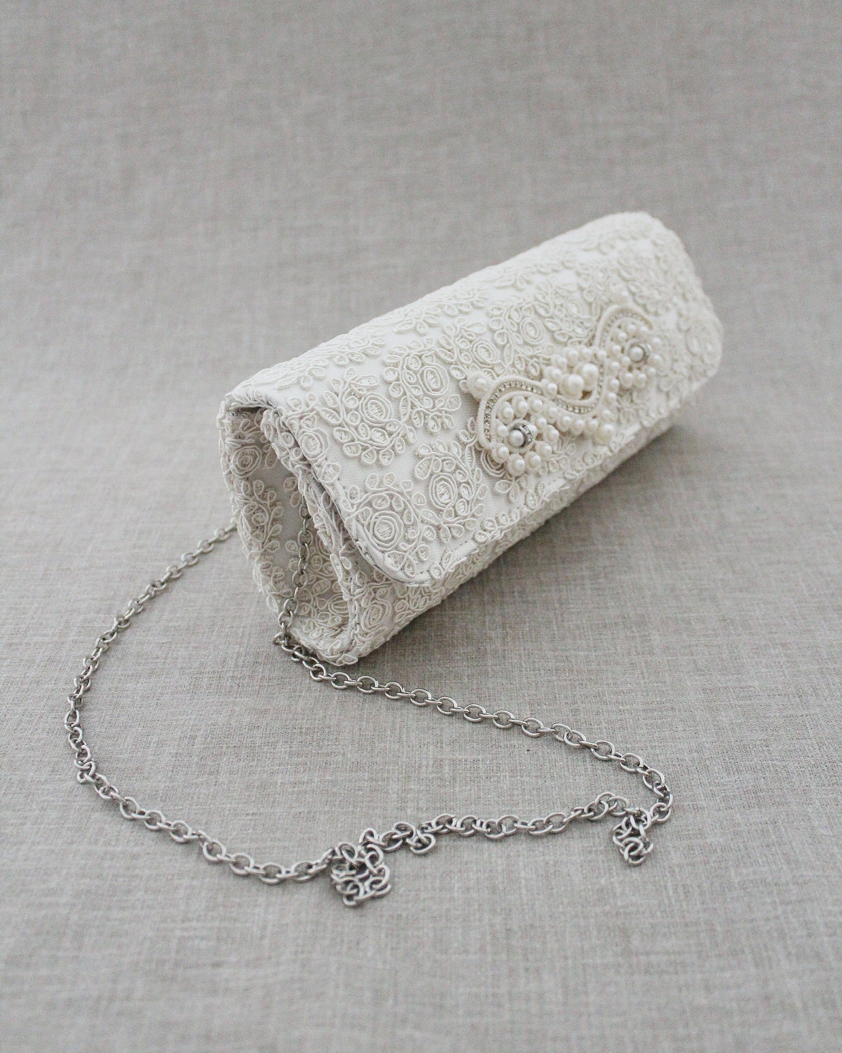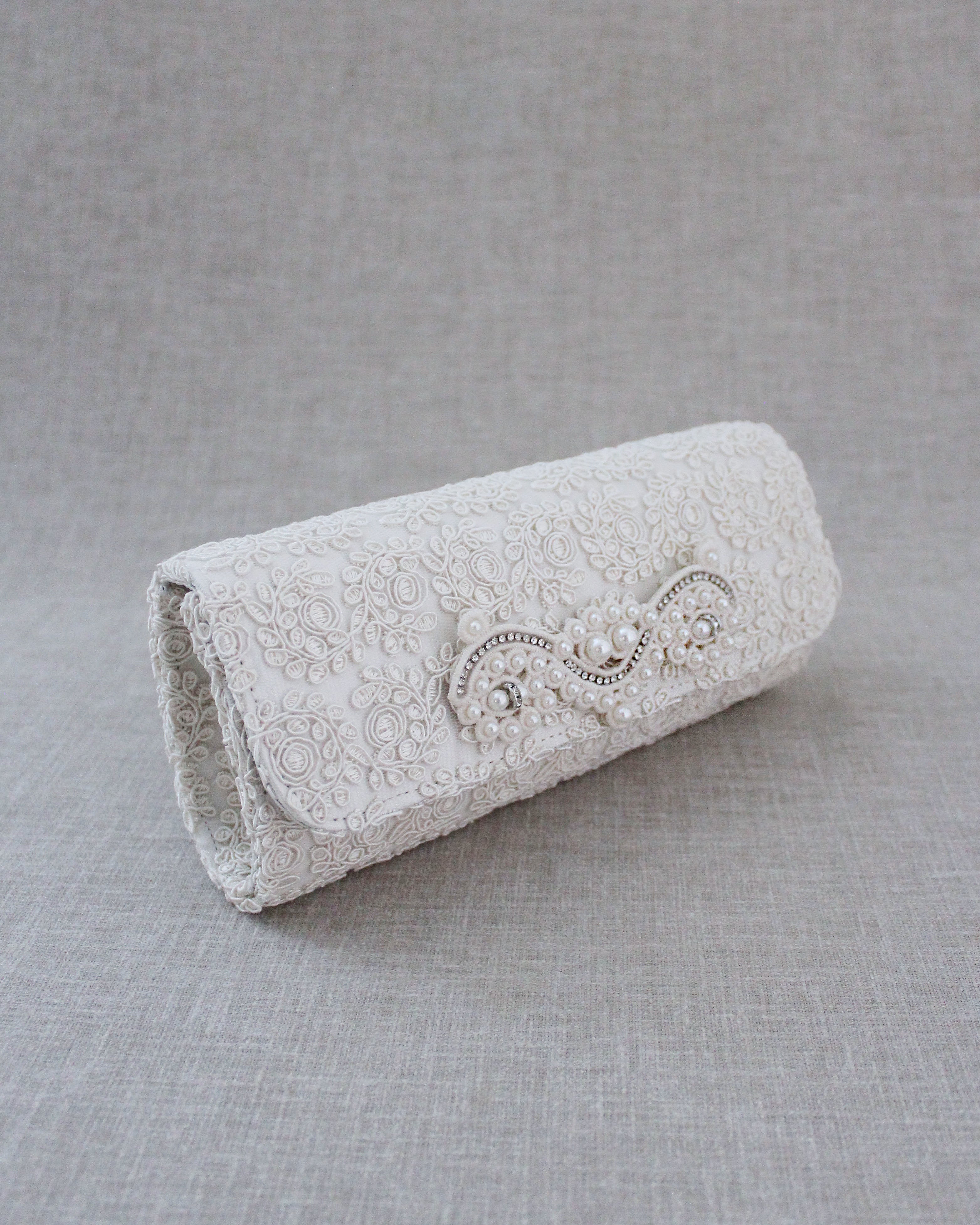 Add a classic modern touch with this crochet lace envelop clutch. With a touch of pearls and rhinestones embellishment, this will be a beautiful complement to your bridal gown, evening dress, casual dress. Perfect ensemble for bride, bridesmaids, mother of the bride, wedding parties, or any special occasions.