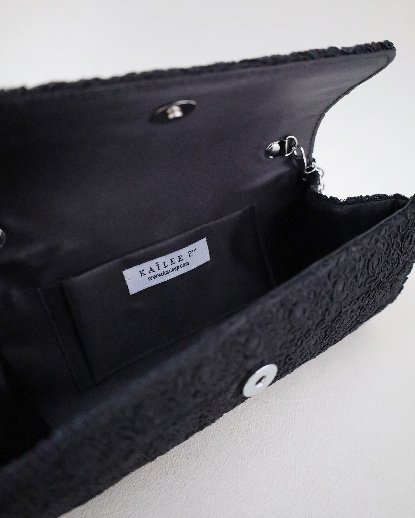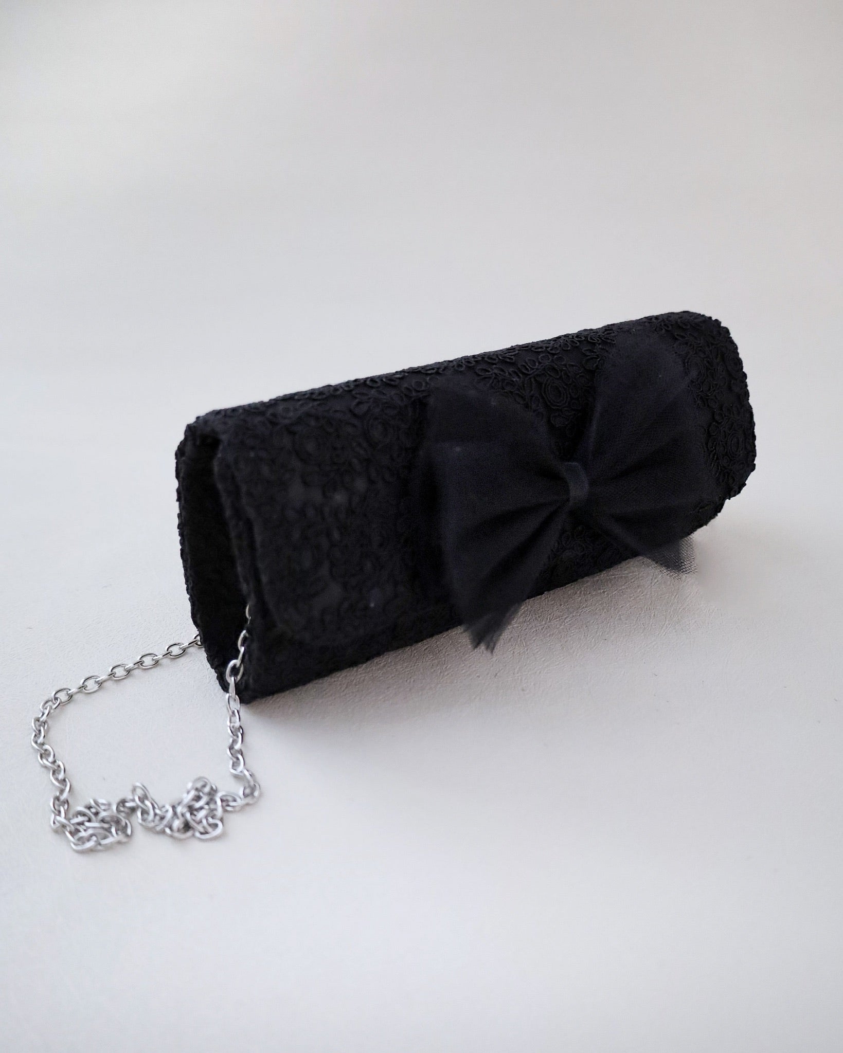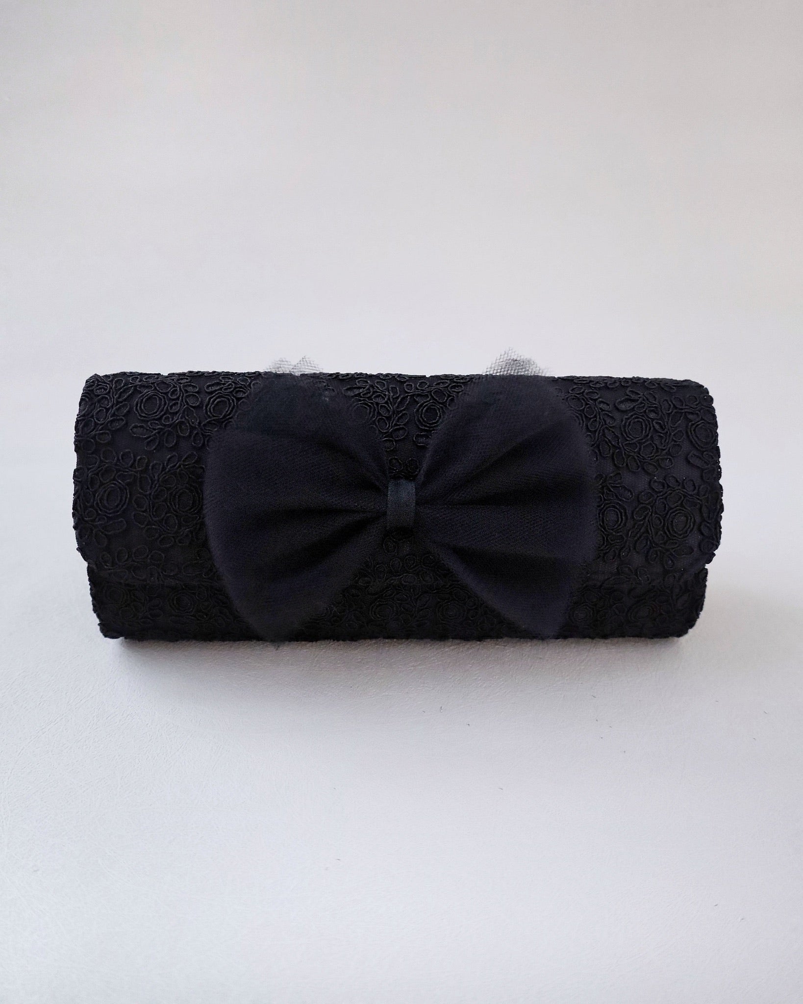 This crochet lace envelop wedding clutch creates a simple yet elegant look. Adorned with matching color tulle bow to create a beautiful complement to your bridal gown, evening dress, casual dress, and a perfect ensemble for wedding parties, or any special occasions.