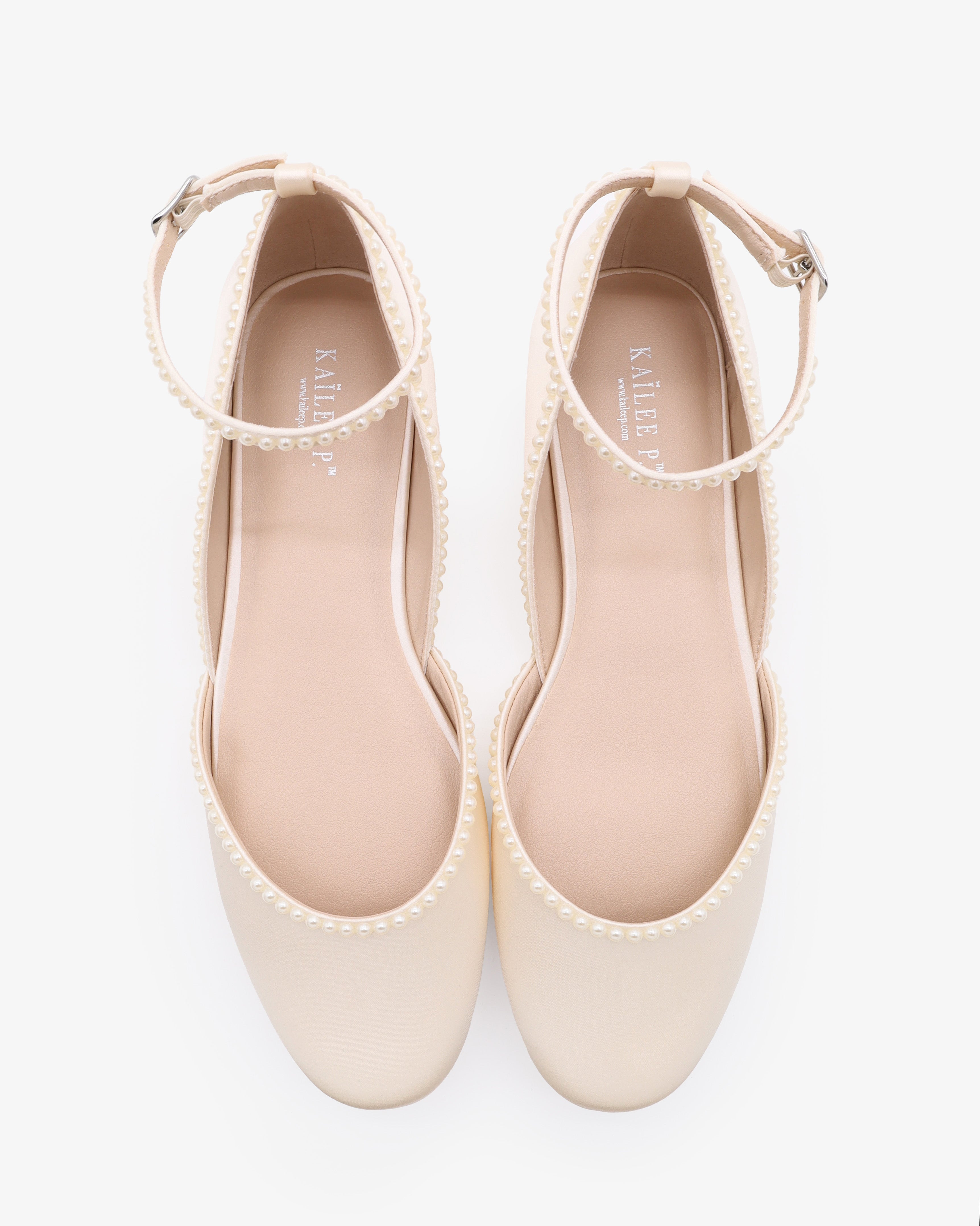 Inspired by a contemporary and refined ballet style flat. Classic silky satin round toe flat with added mini pearls details brings an elevated elegance. The delicate mini pearl beads are placed carefully by hand to create a graceful classic bridal shoe. Perfect for fall or summer wedding, evening wear, holiday, or romantic date.