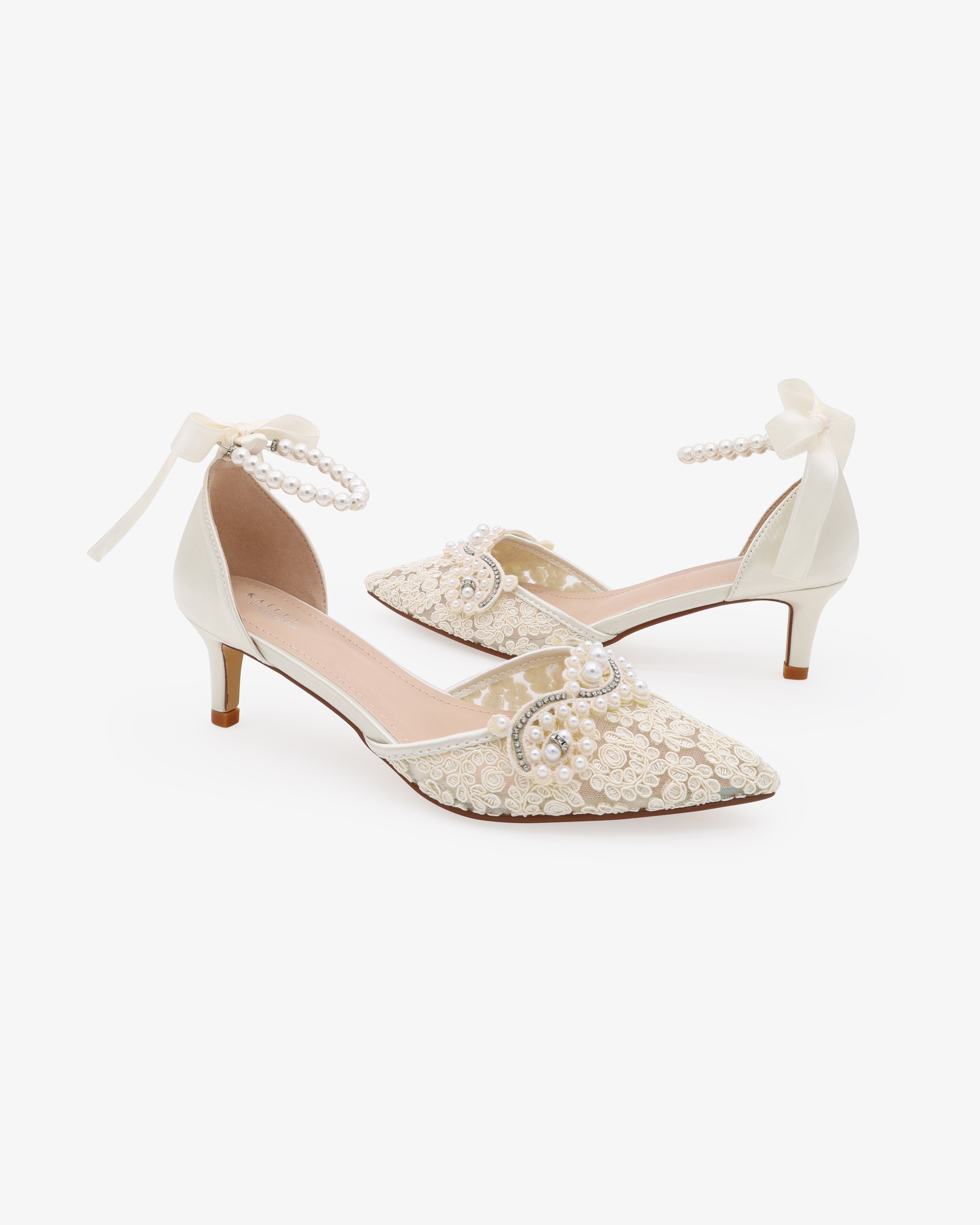 Crochet Lace Pointy Toe Wedding Kitten Low Heel with Mini Pearls