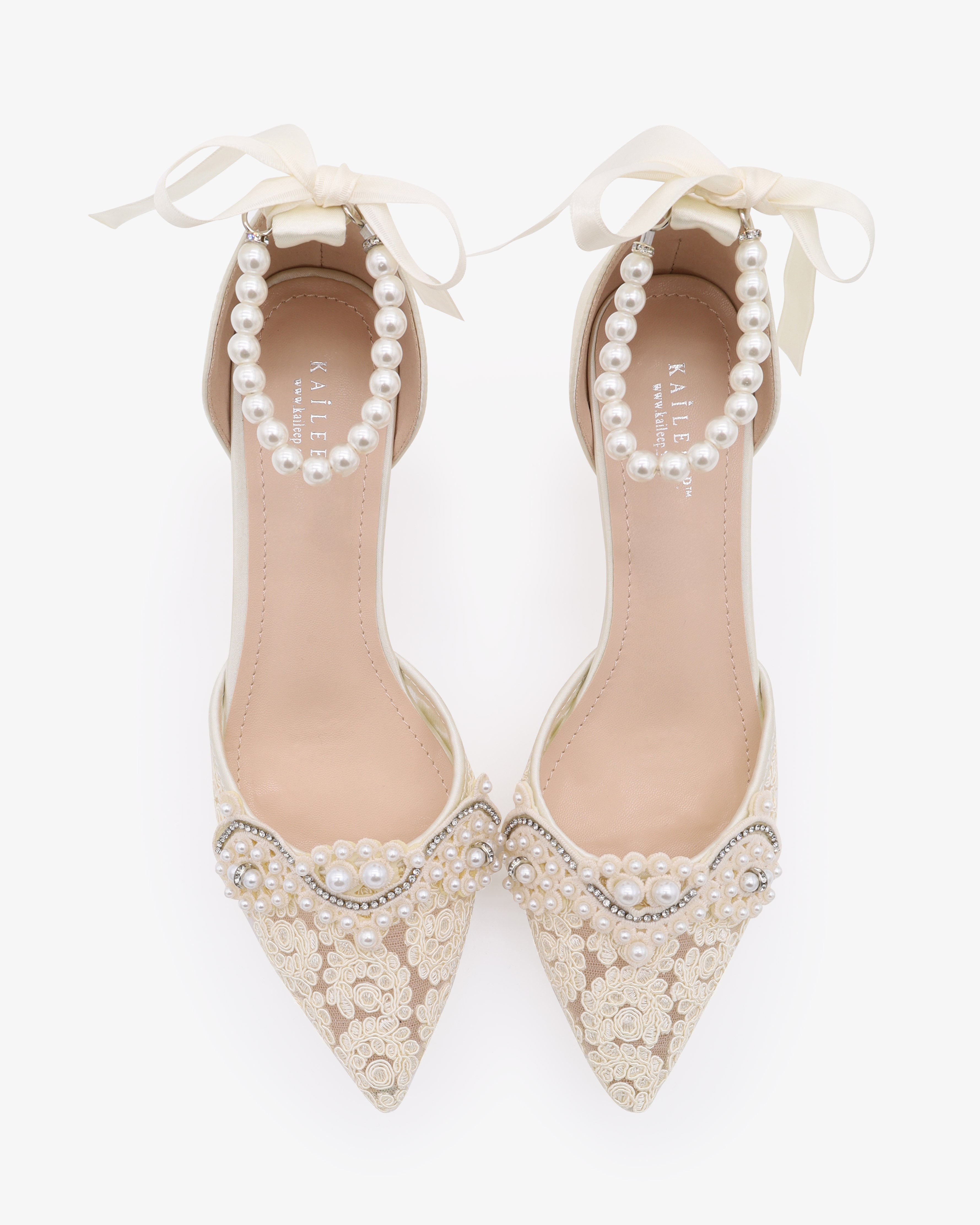 Classic crochet lace pointy toe with low heels with an added pearls applique. The luminous pearls makes this a classic and elegant heel for any bride. Perfect for brides, bridal party, bridesmaids, prom, parties, or any special occasion.