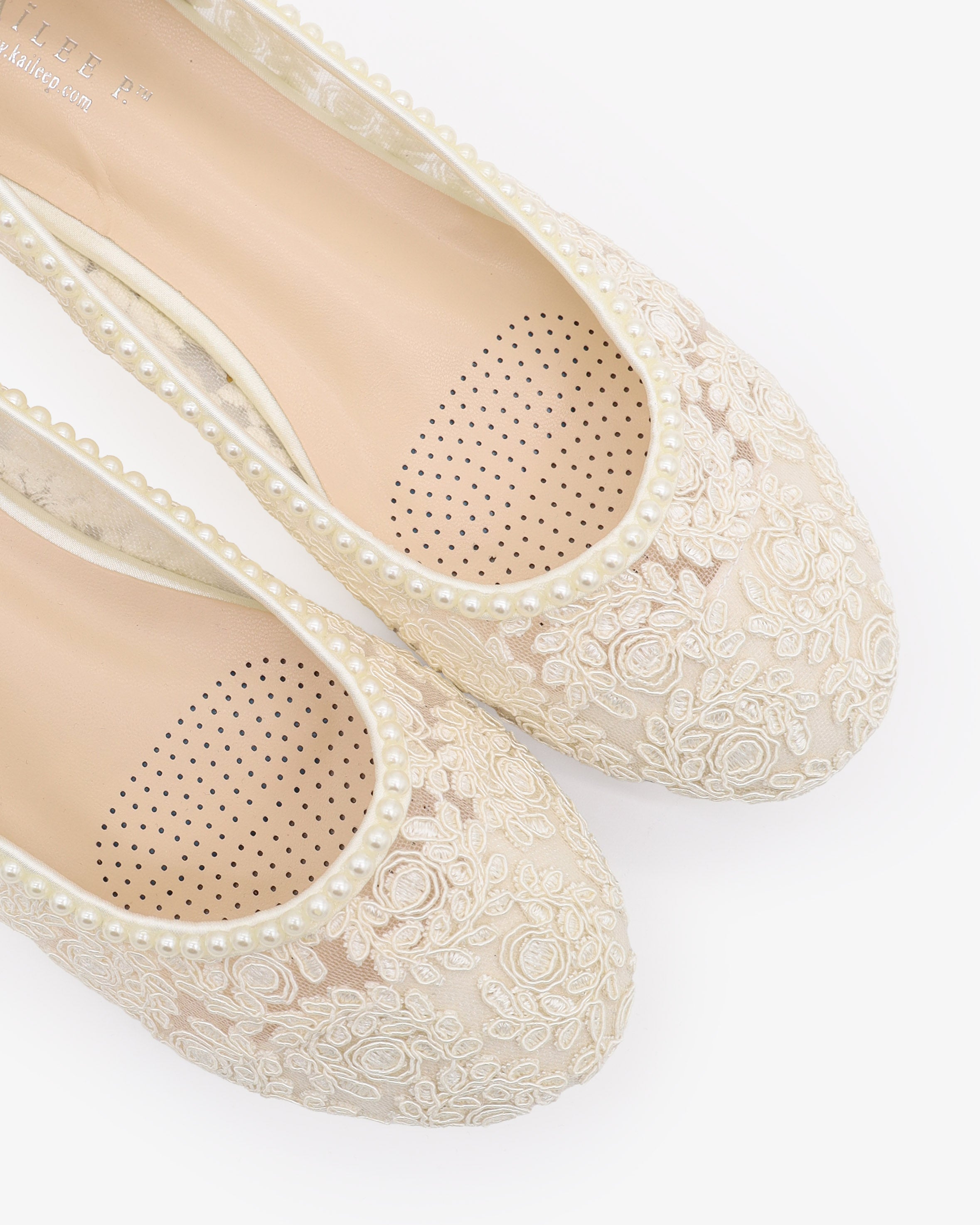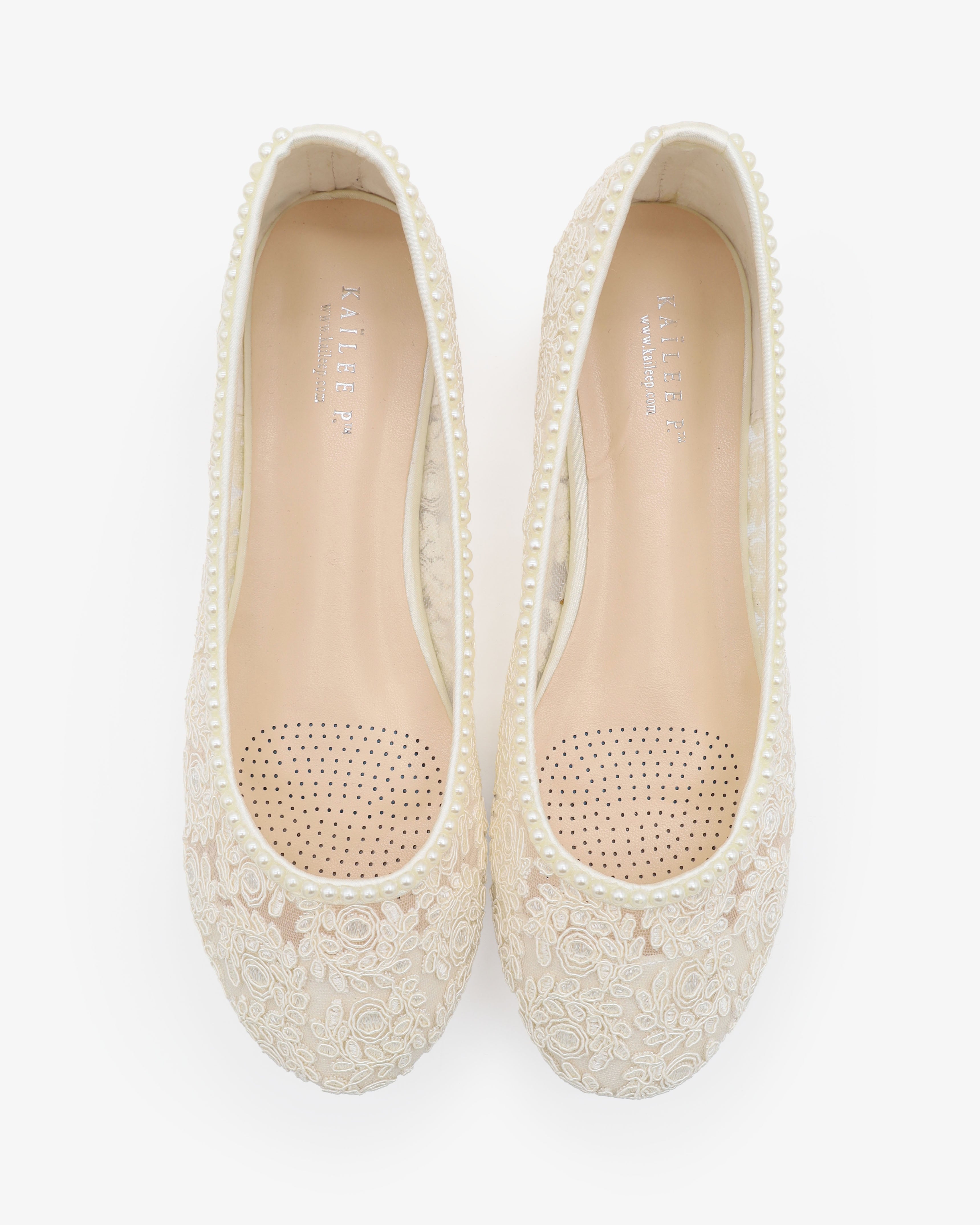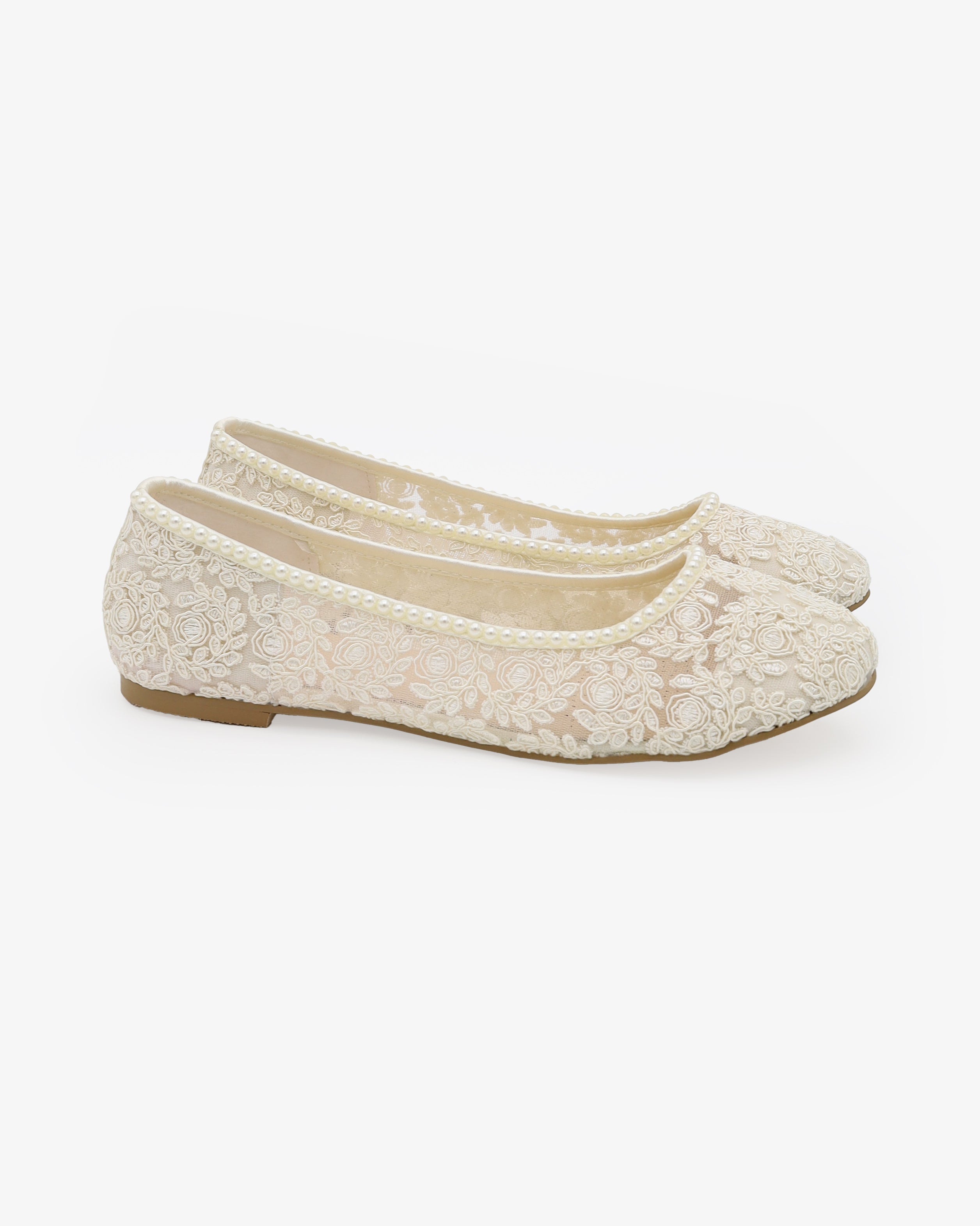 Delicate lace flats with added mini pearls along topline. Comfortable throughout your special day and perfect for wedding party. The delicate mini pearl beads are placed carefully by hand made to order to create a graceful classic bridal shoe.